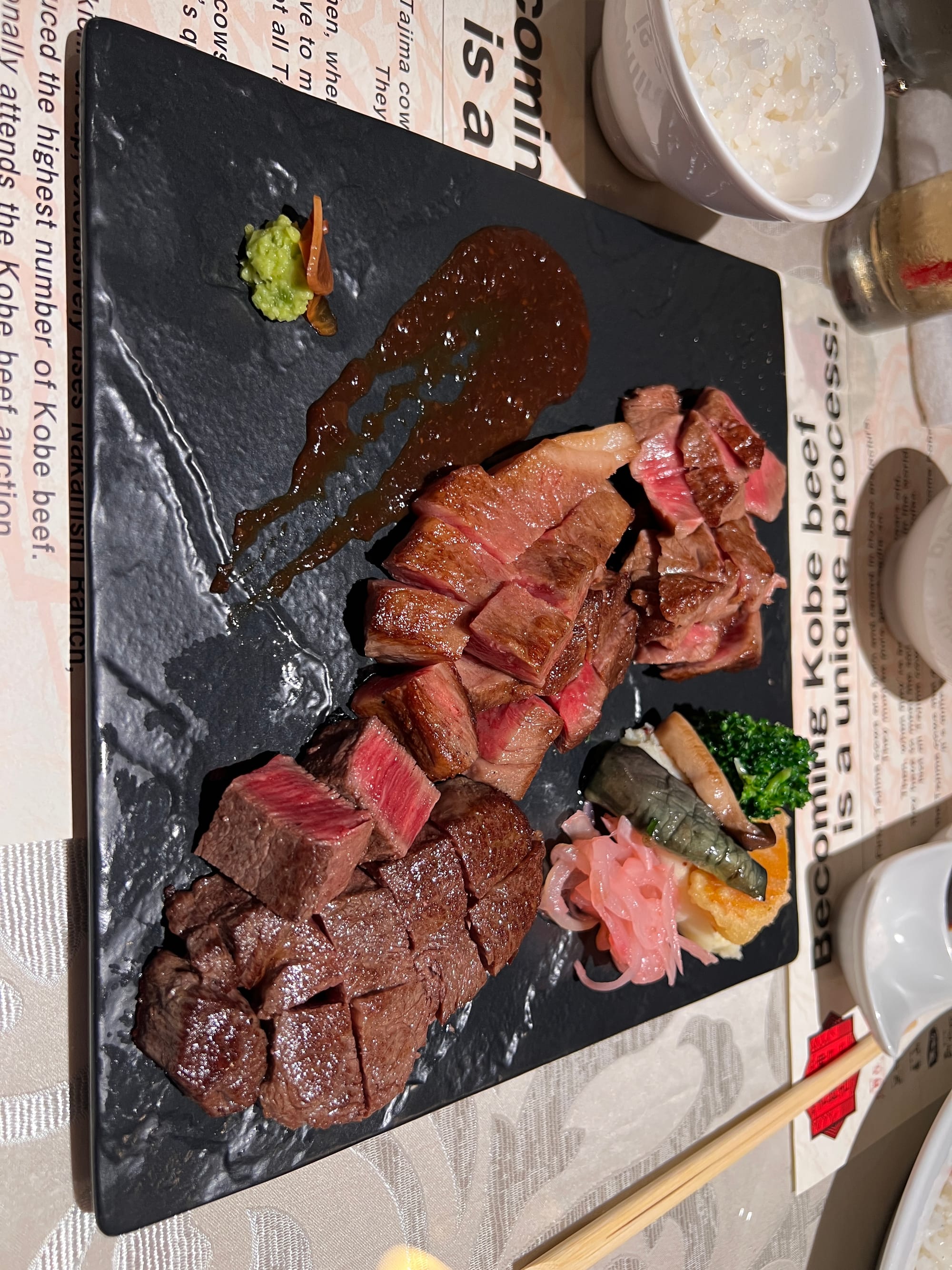 Jako mięsożercy i miłośnicy wołowiny, jeszcze przed wyjazdem założyliśmy sobie, że jednym z naszych celów w Japonii będzie nie tylko spróbowanie najlepszej wołowiny świata, ale zjedzenie Kobe w Kobe. Dzisiaj nam się to udało, a przy okazji odwiedziliśmy bardzo ładne miasto 😉. Trzeba przyznać, że wołowina ta jest naprawdę przepyszna i bardzo delikatna, to była dla nas prawdziwa uczta kulinarna.