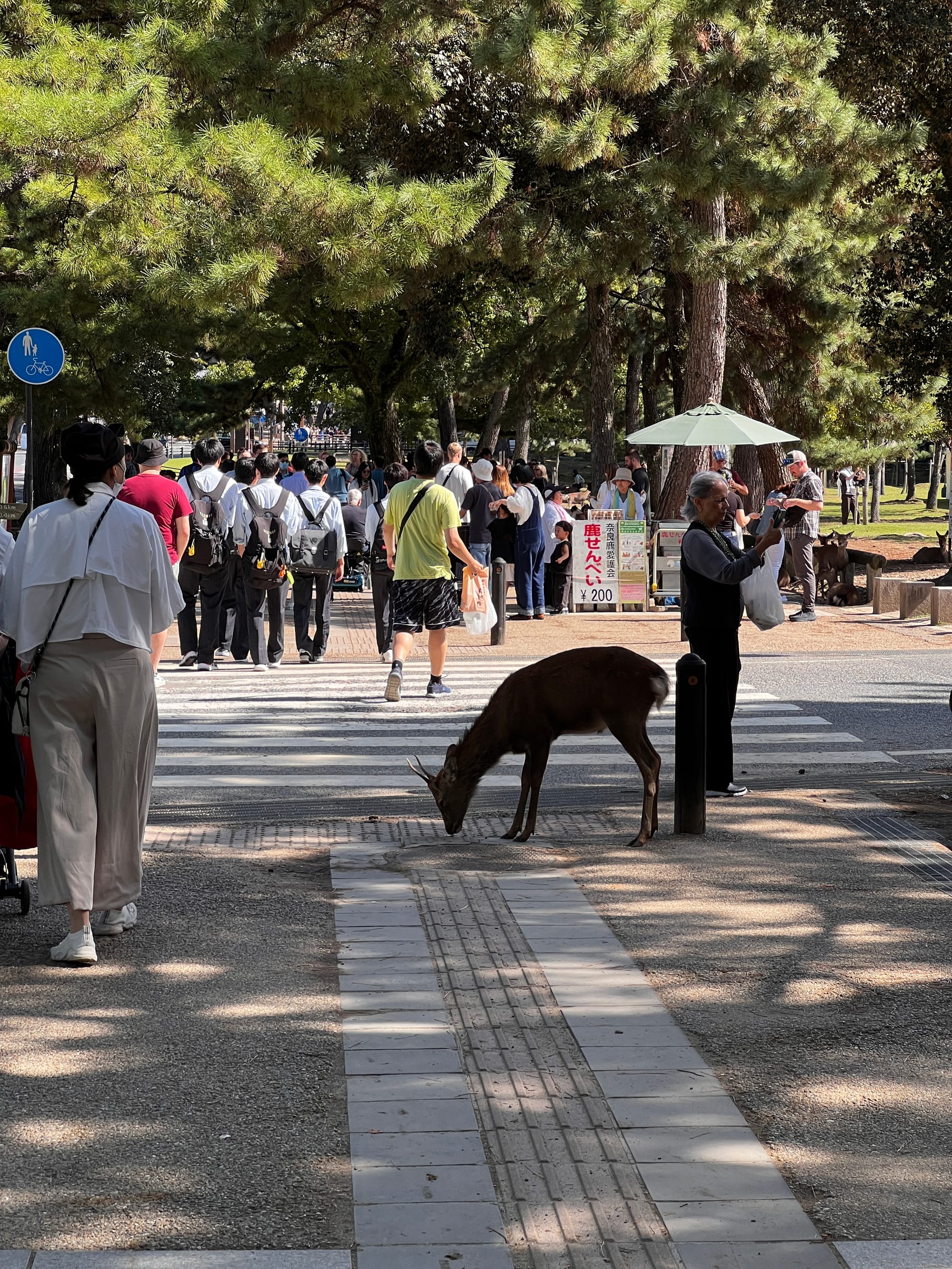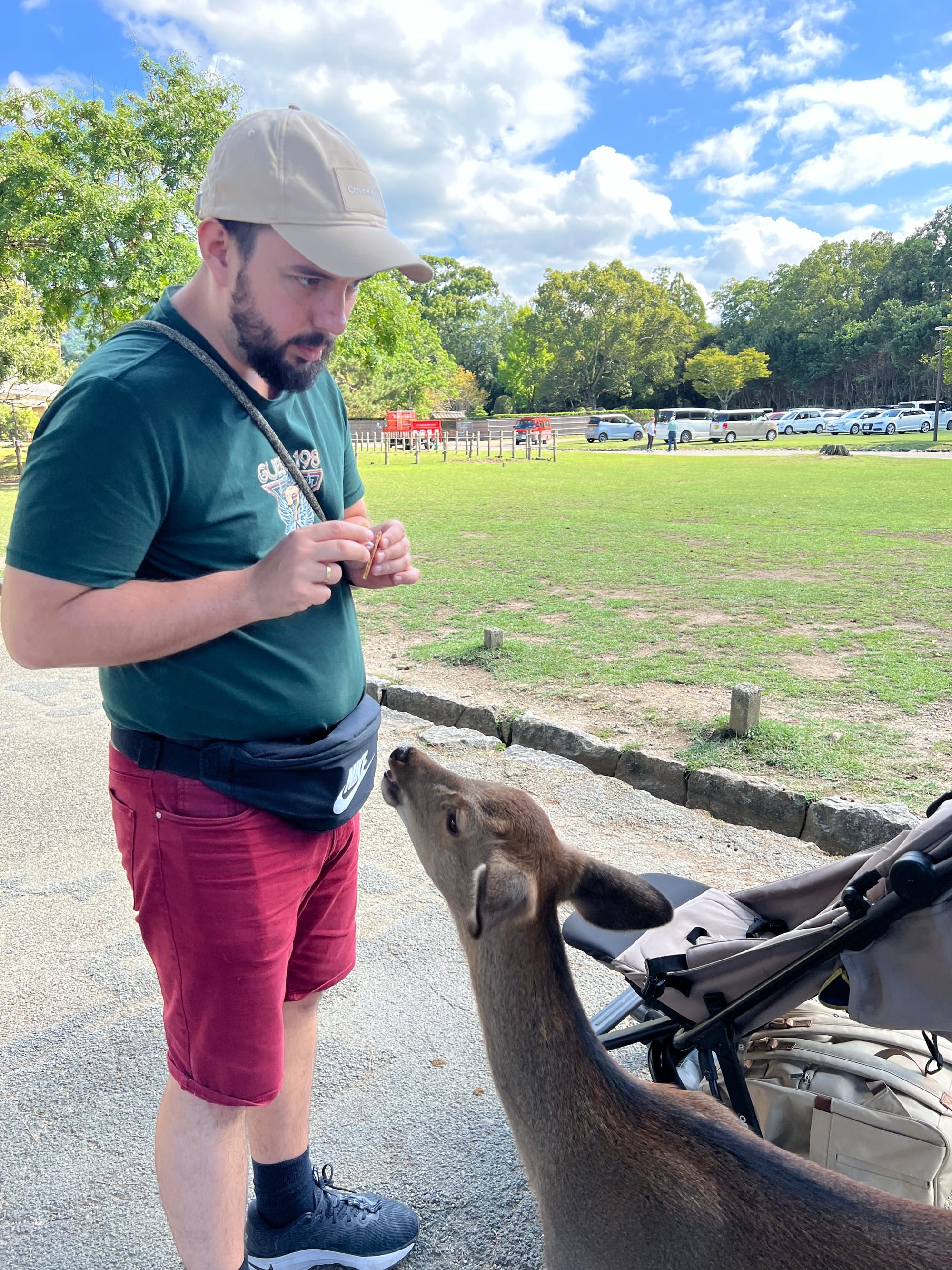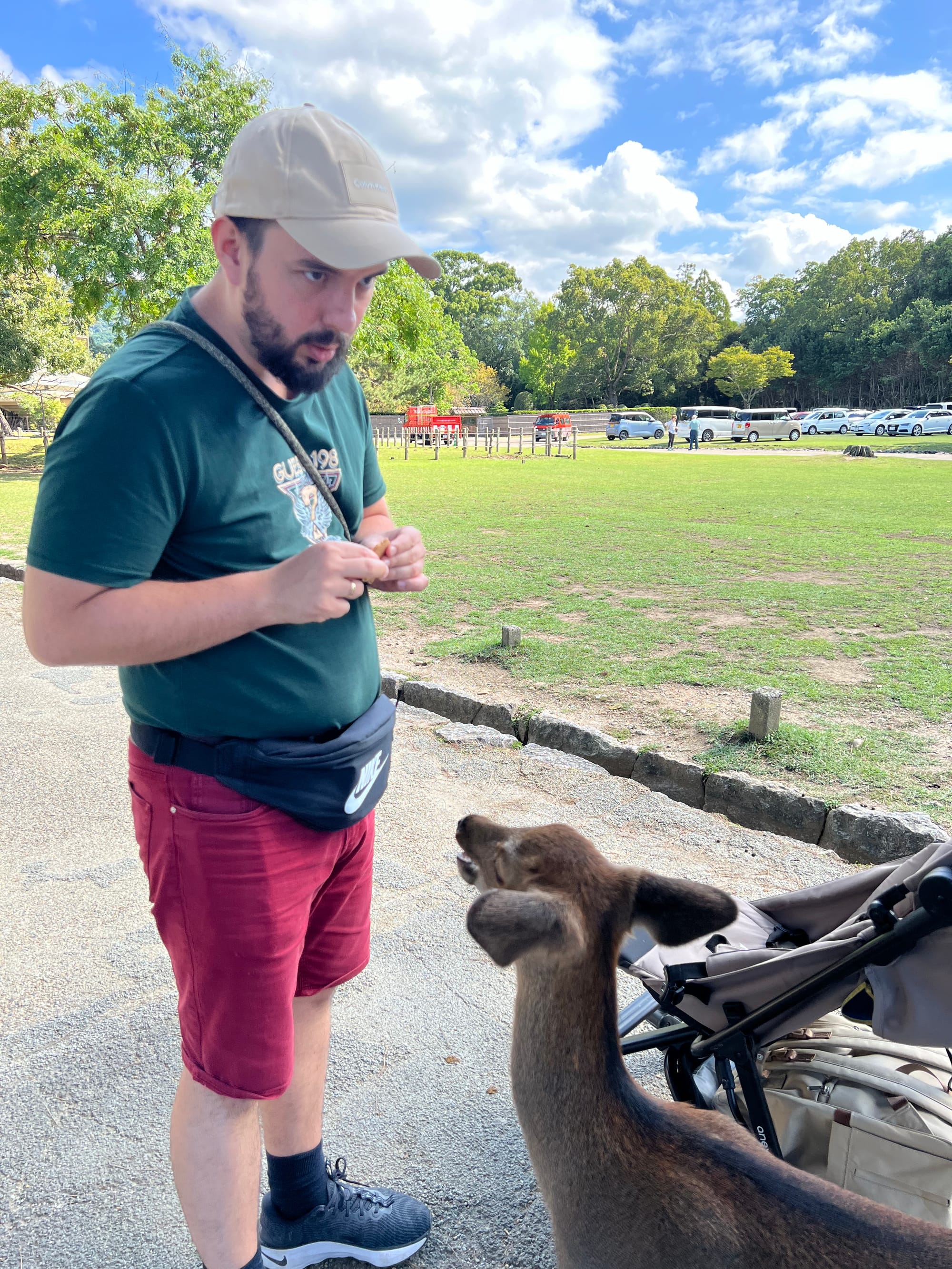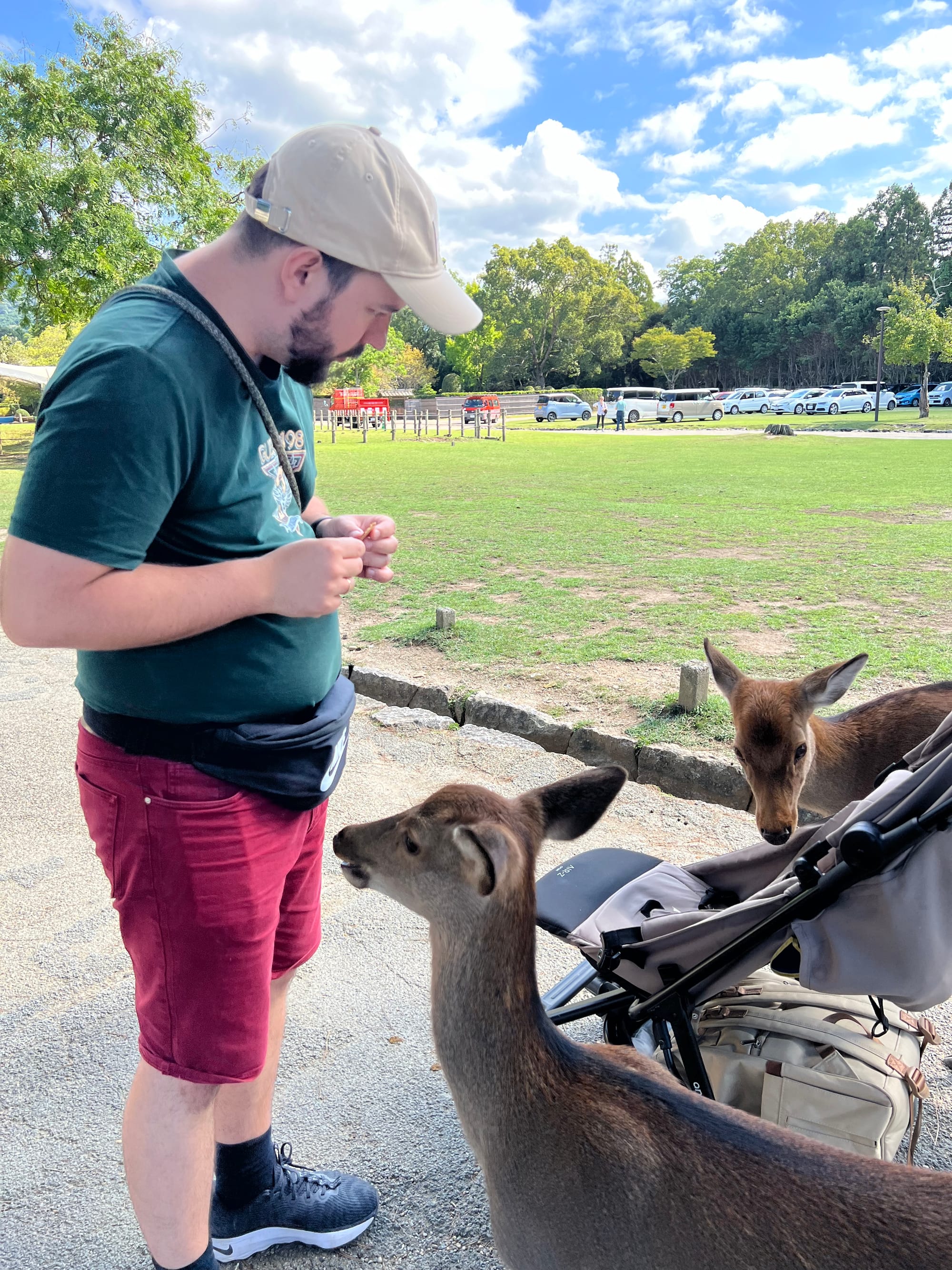 Dzisiaj wybraliśmy się do pobliskiego miasta o nazwie Nara. Miasto to było pierwszą stałą stolicą Japonii i siedzibą dworu cesarskiego. Po przeniesieniu stolicy do Kioto, stało się ważnym ośrodkiem klasztornym. Do dzisiaj w Narze znajduje się wiele świątyń. My zdecydowaliśmy się odwiedzić tylko jedną z nich, bo na trasie naszego zwiedzania do tej pory świątyń nie brakowało, a wstęp do nich zazwyczaj jest płatny. Oprócz świątyń, Nara słynie również z jeleni sika, które przechadzają się swobodnie po parkach przy nich położonych. Jelenie chętnie podchodzą do ludzi, oczekując od nich jedzenia. Ich przysmak, ryżowe krakersy, można zakupić na straganach przy parkach za 200 jenów (około 5,30 zł).