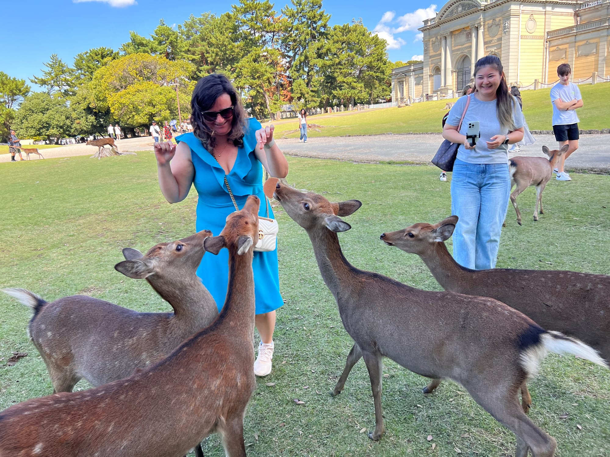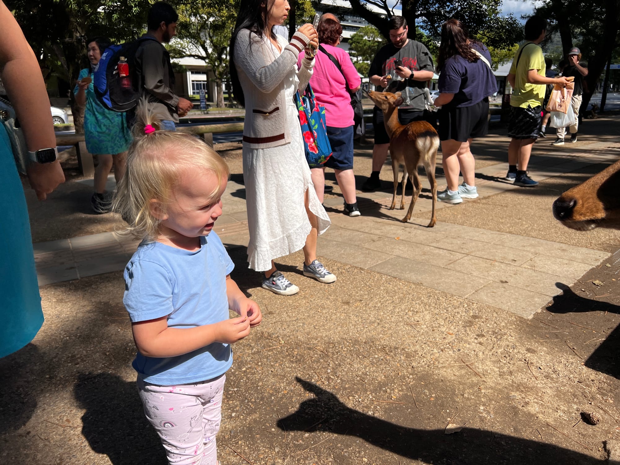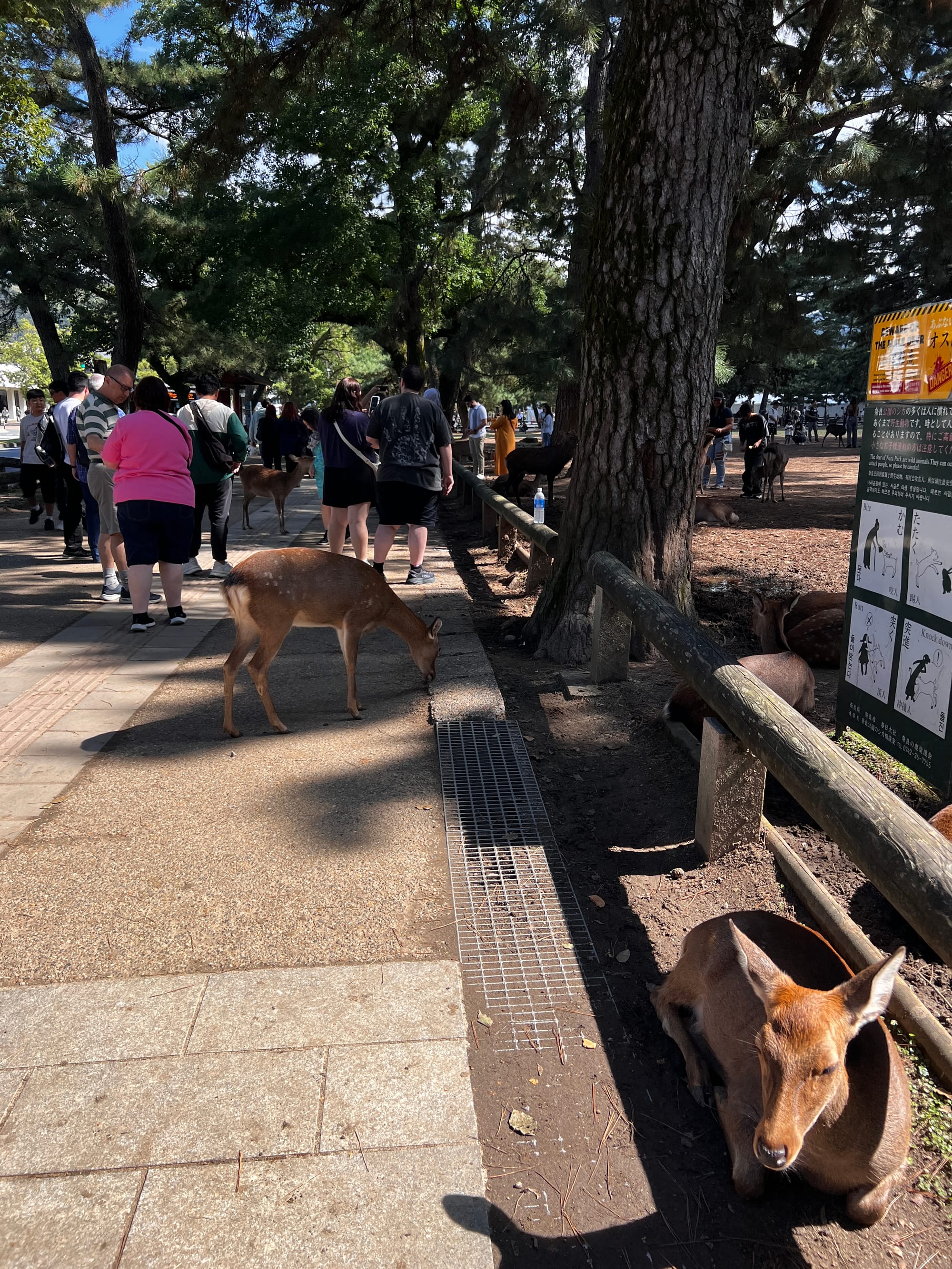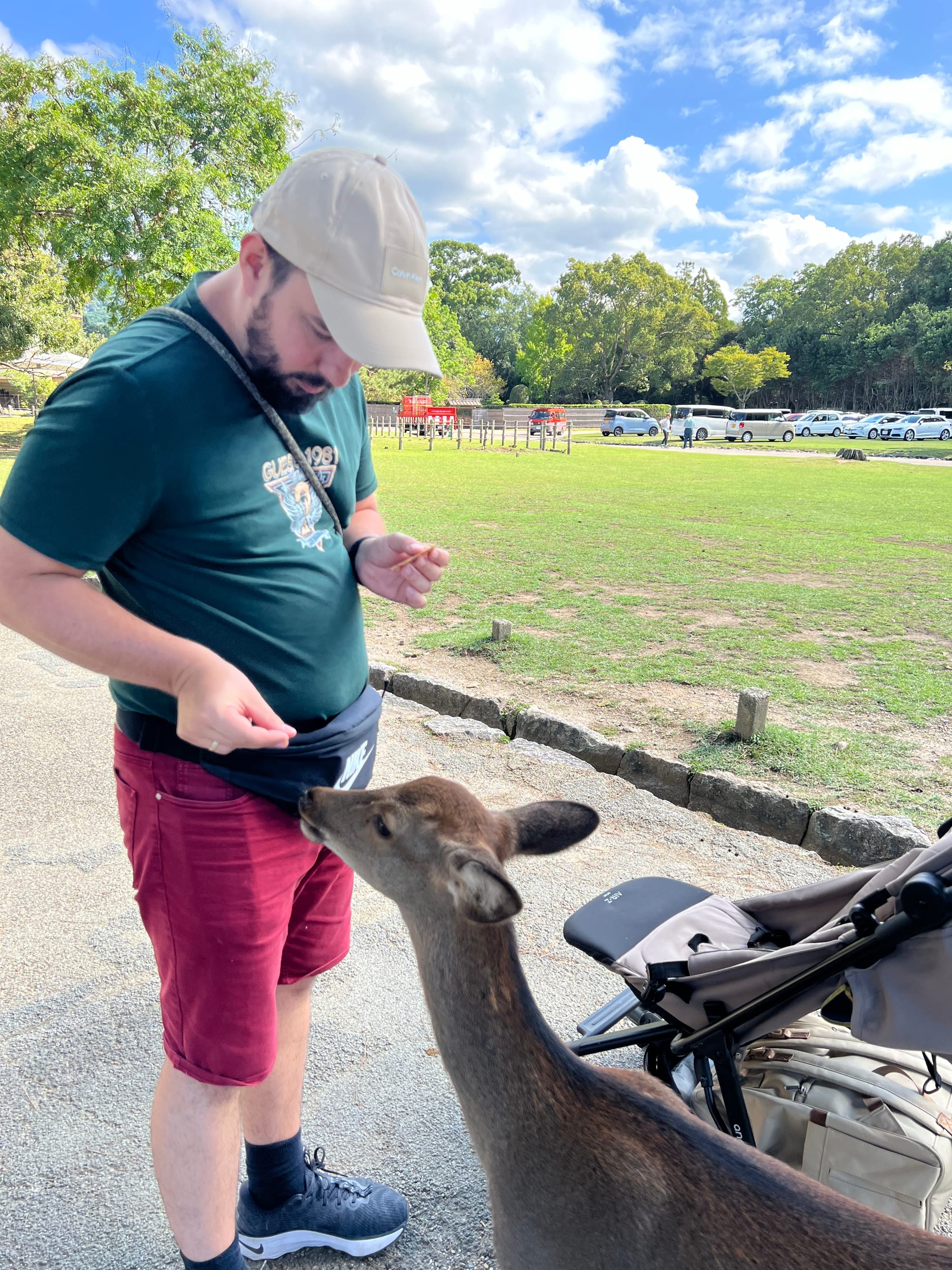 Dzisiaj wybraliśmy się do pobliskiego miasta o nazwie Nara. Miasto to było pierwszą stałą stolicą Japonii i siedzibą dworu cesarskiego. Po przeniesieniu stolicy do Kioto, stało się ważnym ośrodkiem klasztornym. Do dzisiaj w Narze znajduje się wiele świątyń. My zdecydowaliśmy się odwiedzić tylko jedną z nich, bo na trasie naszego zwiedzania do tej pory świątyń nie brakowało, a wstęp do nich zazwyczaj jest płatny. Oprócz świątyń, Nara słynie również z jeleni sika, które przechadzają się swobodnie po parkach przy nich położonych. Jelenie chętnie podchodzą do ludzi, oczekując od nich jedzenia. Ich przysmak, ryżowe krakersy, można zakupić na straganach przy parkach za 200 jenów (około 5,30 zł).