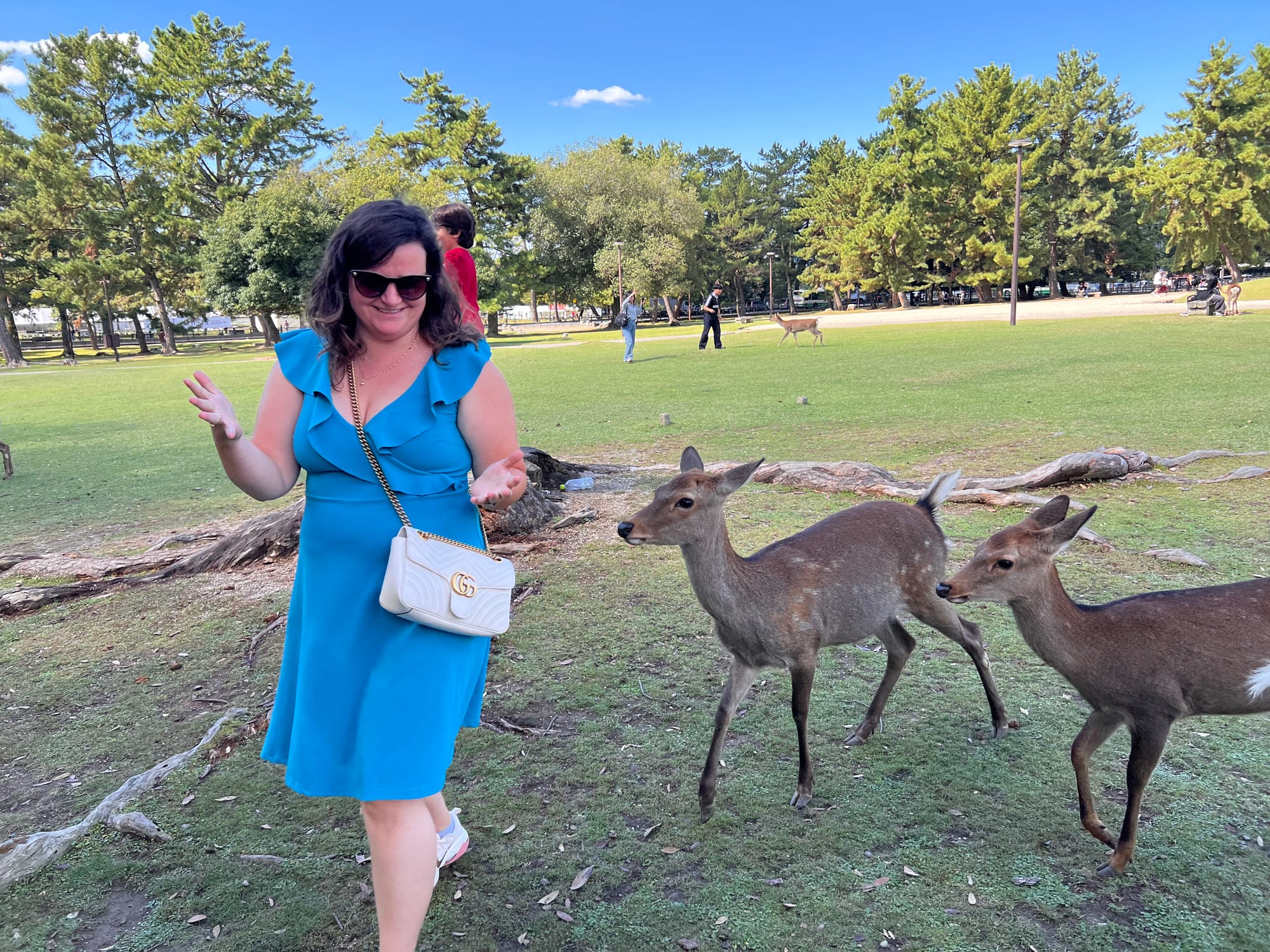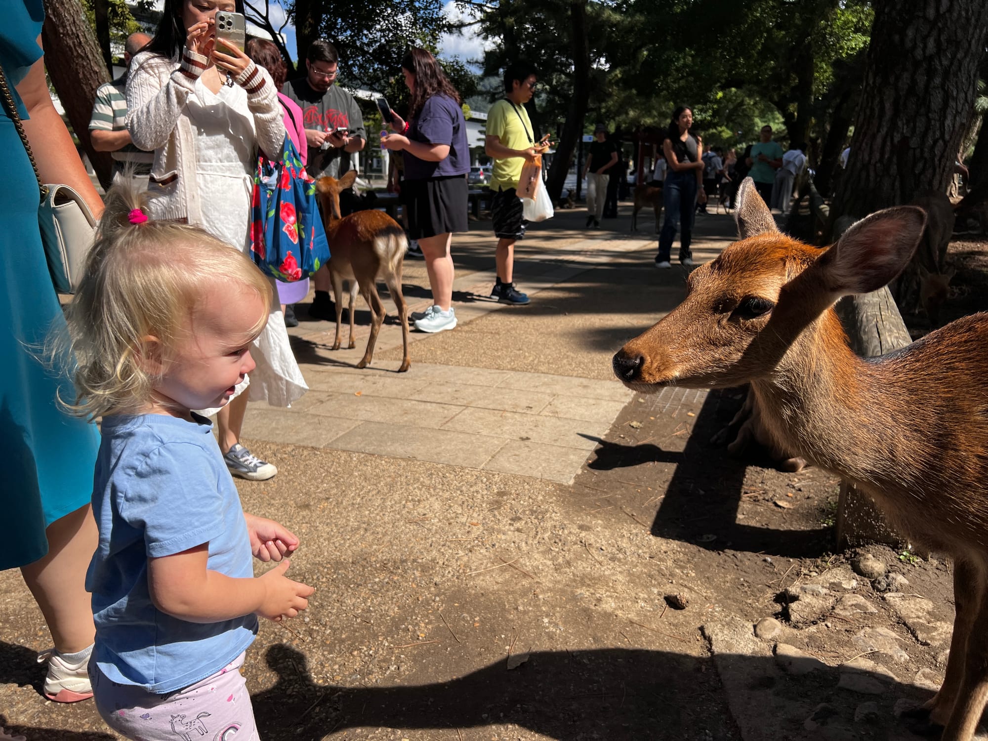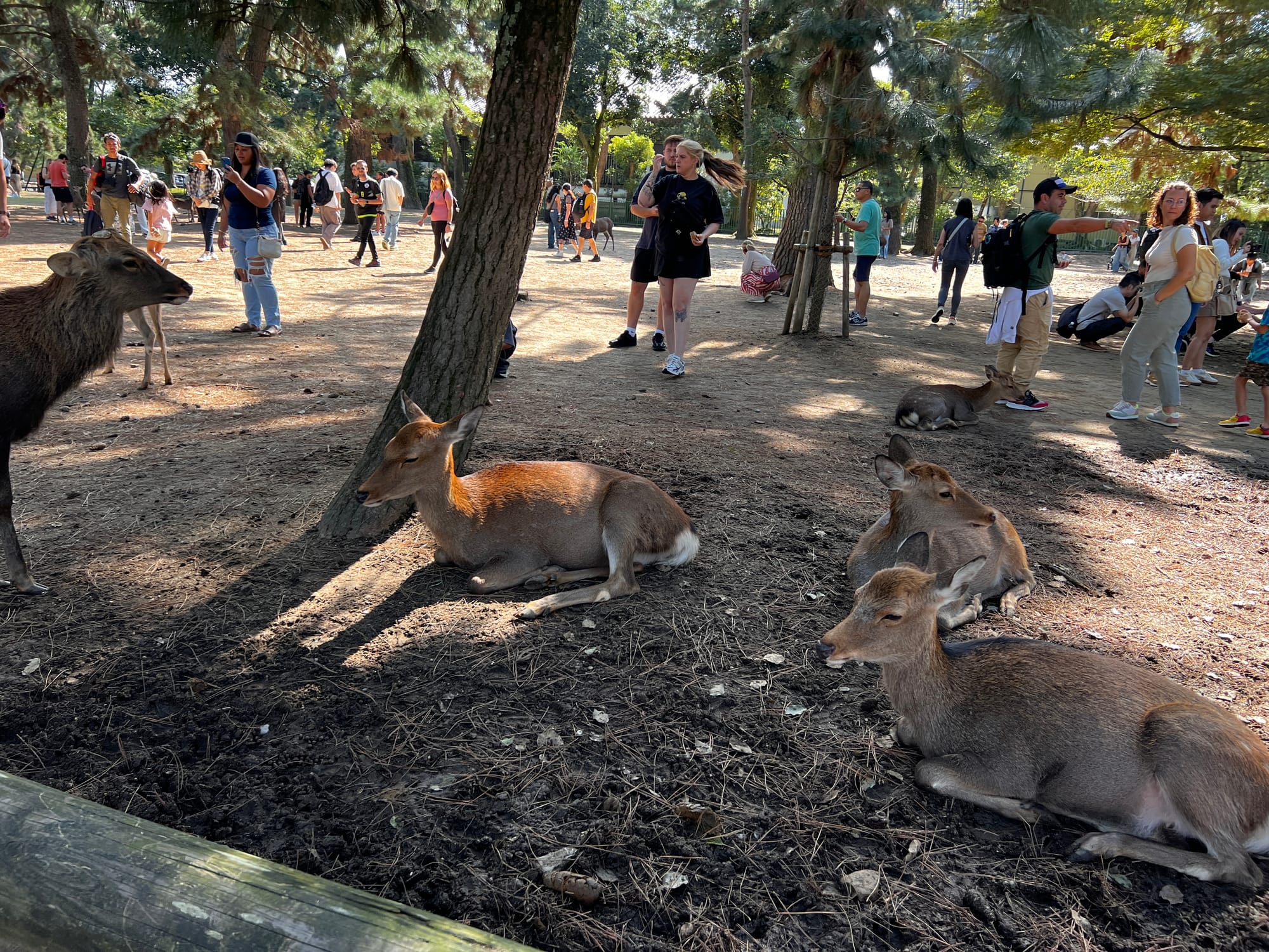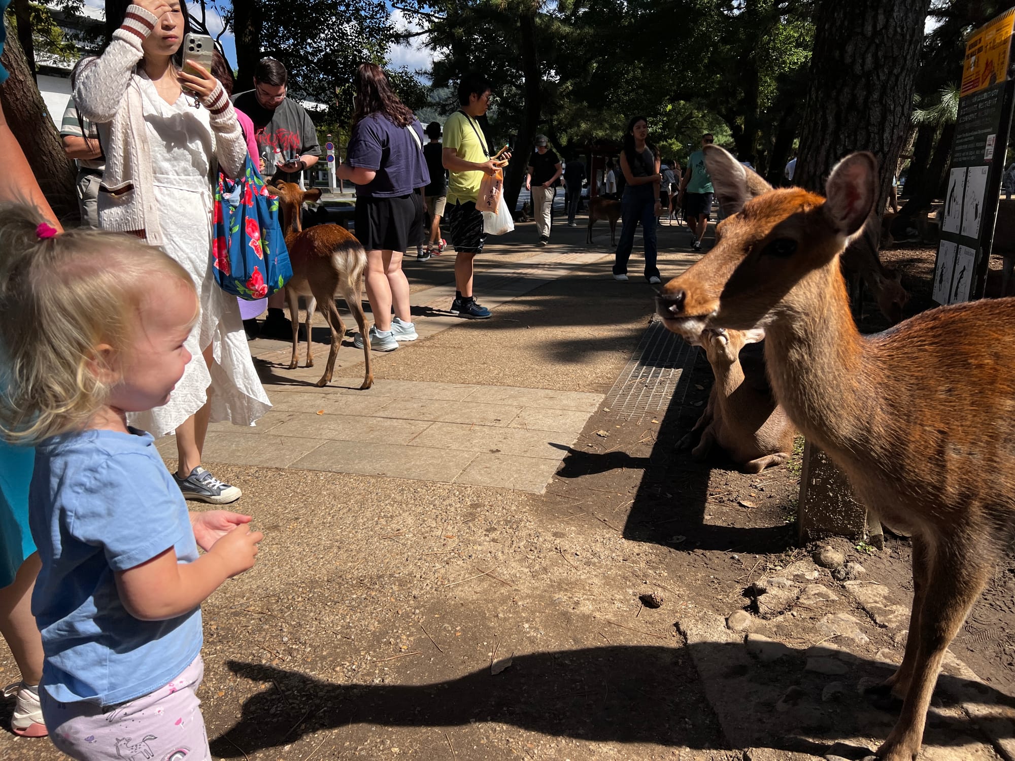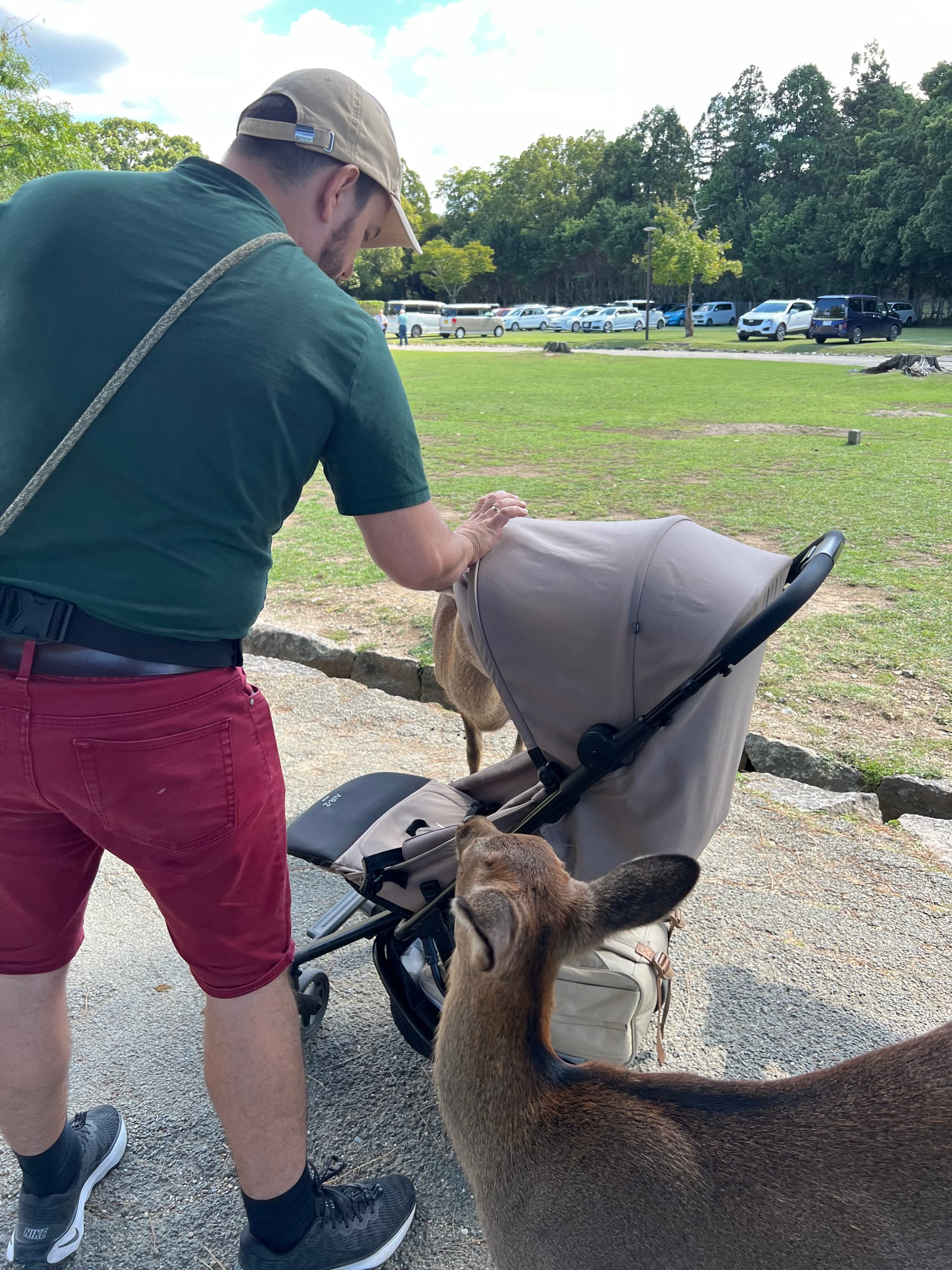 Dzisiaj wybraliśmy się do pobliskiego miasta o nazwie Nara. Miasto to było pierwszą stałą stolicą Japonii i siedzibą dworu cesarskiego. Po przeniesieniu stolicy do Kioto, stało się ważnym ośrodkiem klasztornym. Do dzisiaj w Narze znajduje się wiele świątyń. My zdecydowaliśmy się odwiedzić tylko jedną z nich, bo na trasie naszego zwiedzania do tej pory świątyń nie brakowało, a wstęp do nich zazwyczaj jest płatny. Oprócz świątyń, Nara słynie również z jeleni sika, które przechadzają się swobodnie po parkach przy nich położonych. Jelenie chętnie podchodzą do ludzi, oczekując od nich jedzenia. Ich przysmak, ryżowe krakersy, można zakupić na straganach przy parkach za 200 jenów (około 5,30 zł).