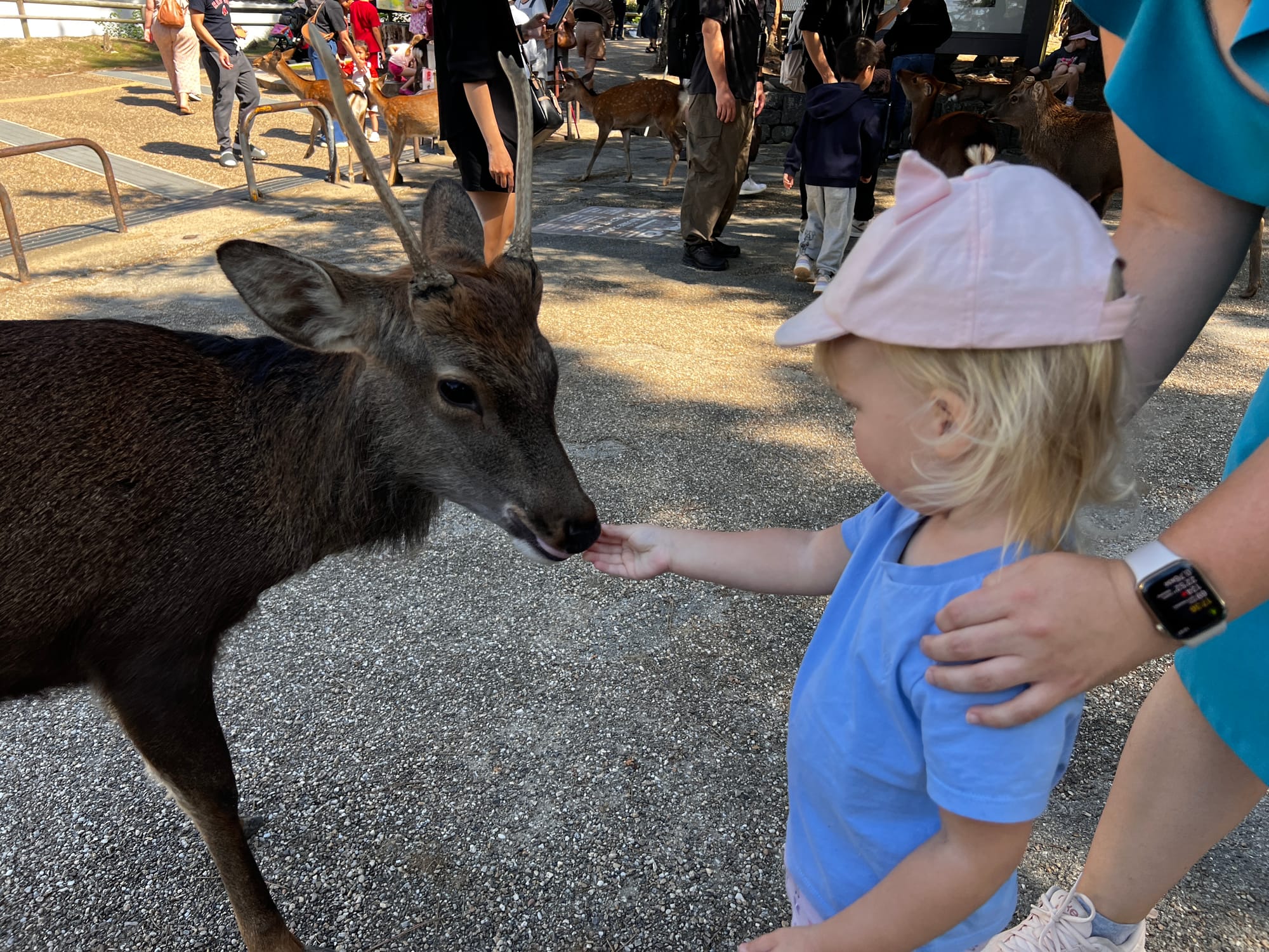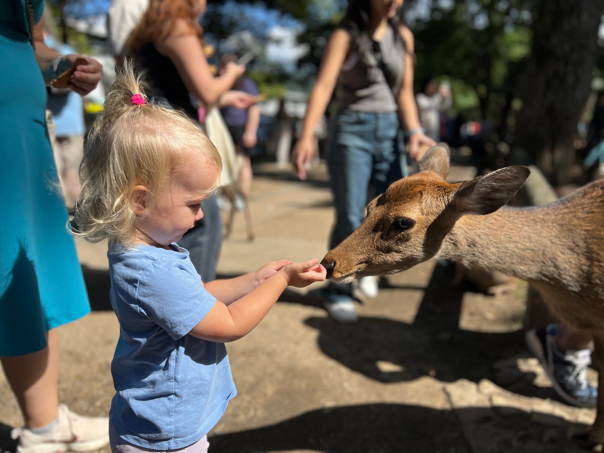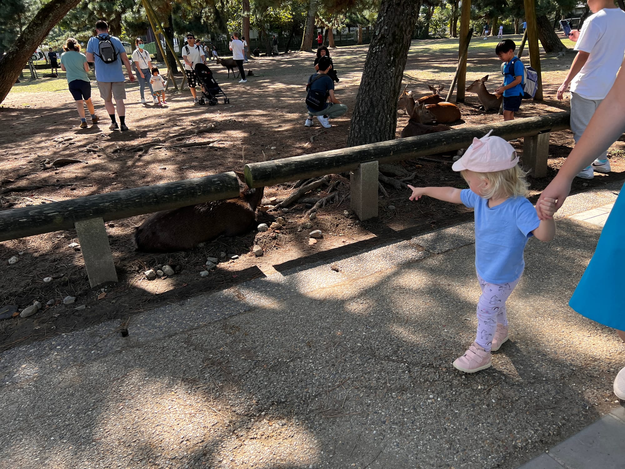 My kupiliśmy dwie paczki i poszliśmy karmić jelonki. Tosia ruszyła aż nadto entuzjastycznie i przewróciła się, raniąc sobie kolanko. Płacz był głośny, ale niedługi, bo obecność jelonków złagodziła ból.