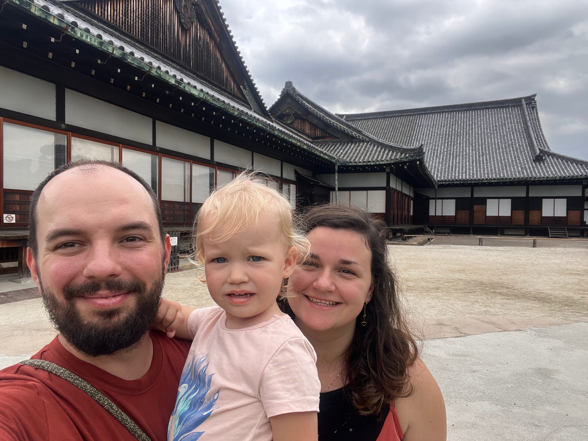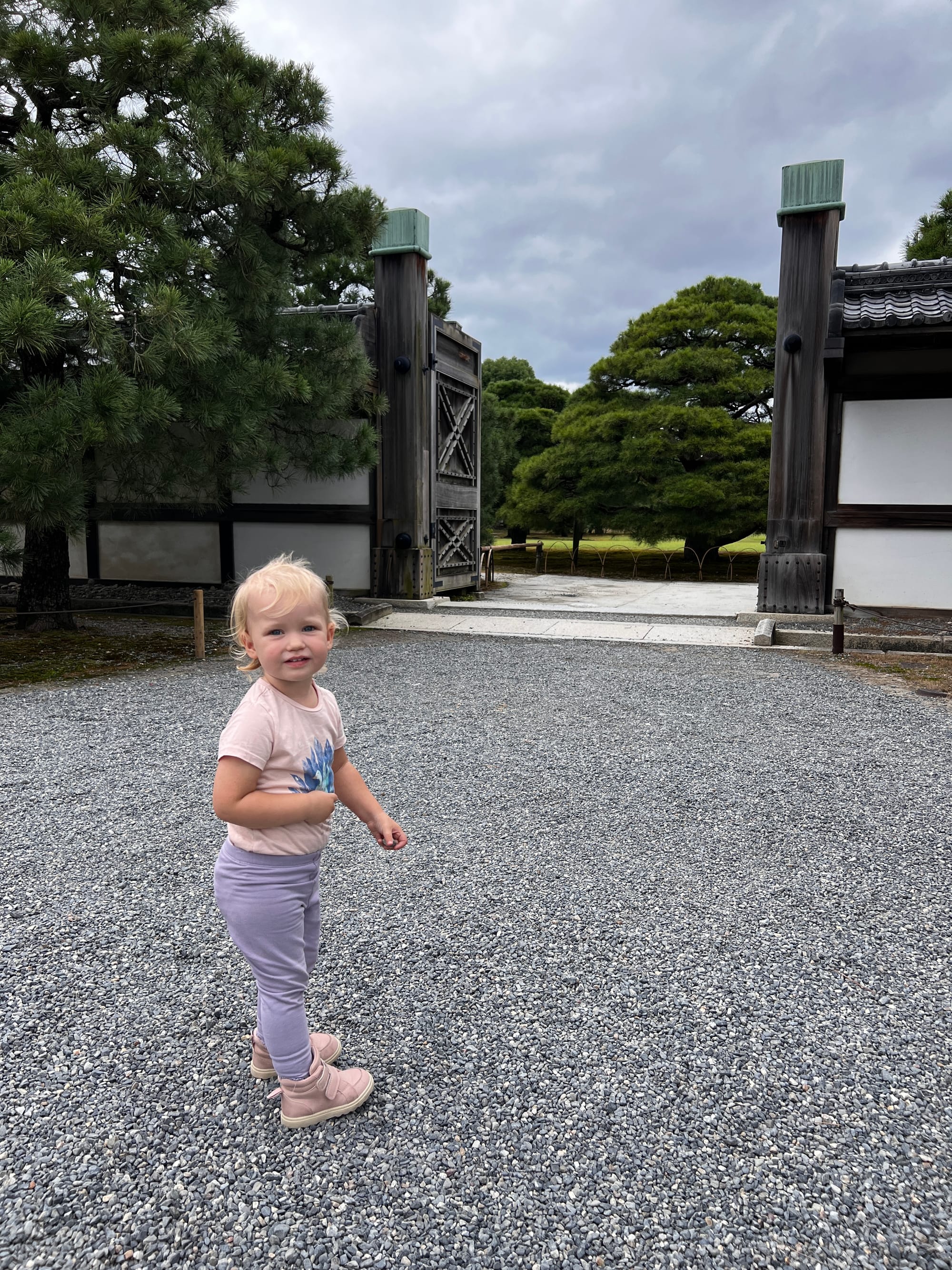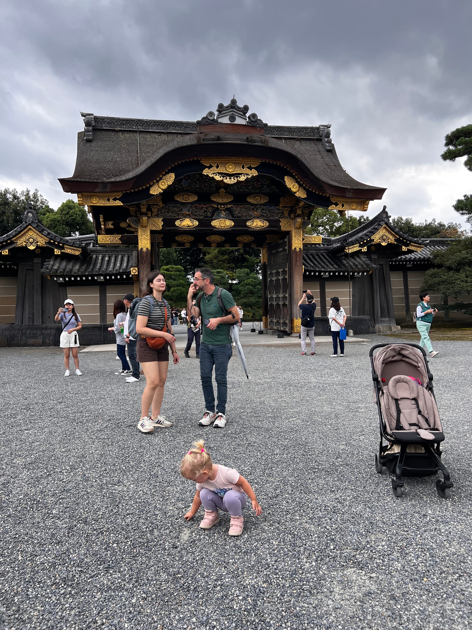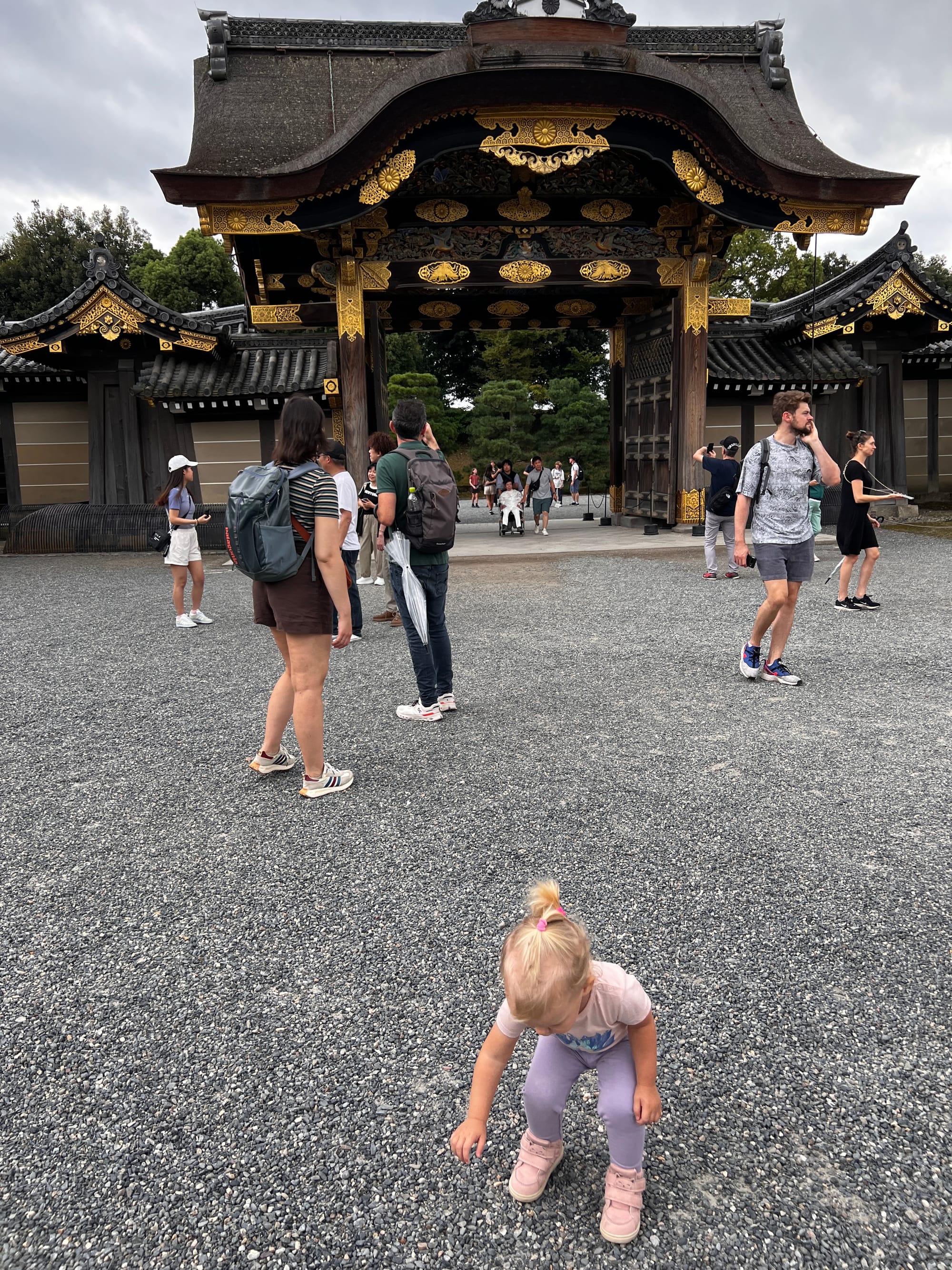 Dzisiaj rozpoczęliśmy dzień od odwiedzenia Zamku Nijo, należącego do zespołu zabytkowego dawnego Kioto, Uji i Otsu, wpisanego na listę światowego dziedzictwa UNESCO w 1994 roku. Był on siedzibą shogunów przez ponad 200 lat. Następnie, po upadku szogunatu, przekazany został Cesarzowi Meji i przez pewien czas pełnił funkcję pałacu cesarskiego, aby ostatecznie trafić do zasobów miasta Kioto, które umożliwiło jego zwiedzanie. Zamek Nijo spełniał również funkcje obronne i stanowił symbol militarnej potęgi rodu Tokugawa. Można zwiedzać go w środku, jednak przed wejściem konieczne jest ściągnięcie butów, jak również obowiązuje zakaz robienia zdjeć i nagrywania wideo. Na nas zdecydowanie większe wrażenie zrobiła zewnętrzna część zamku i piękne, otaczające go ogrody. Tosia z kolei najbardziej zachwycona była kamyczkami, które podnosiła i rzucała przed siebie.
