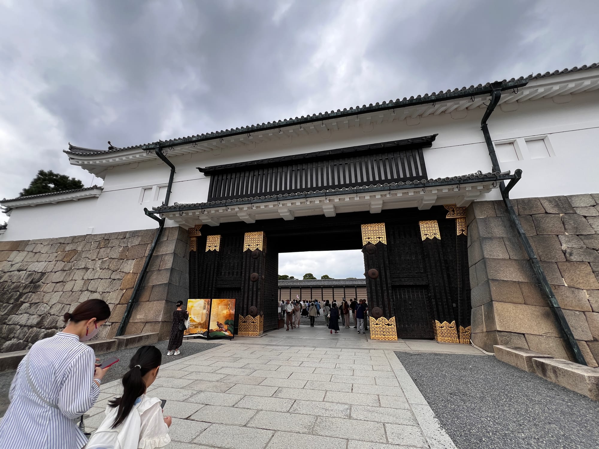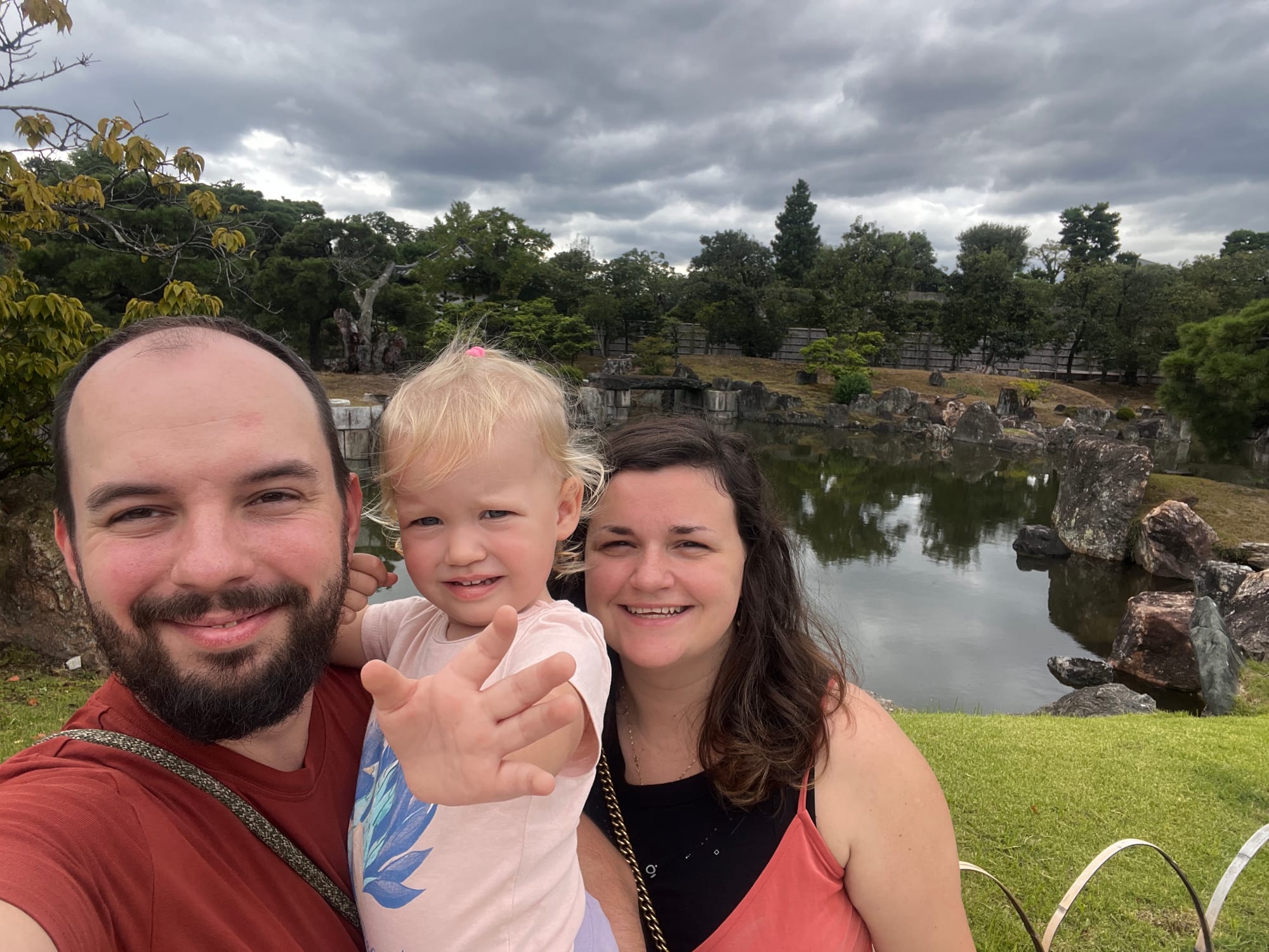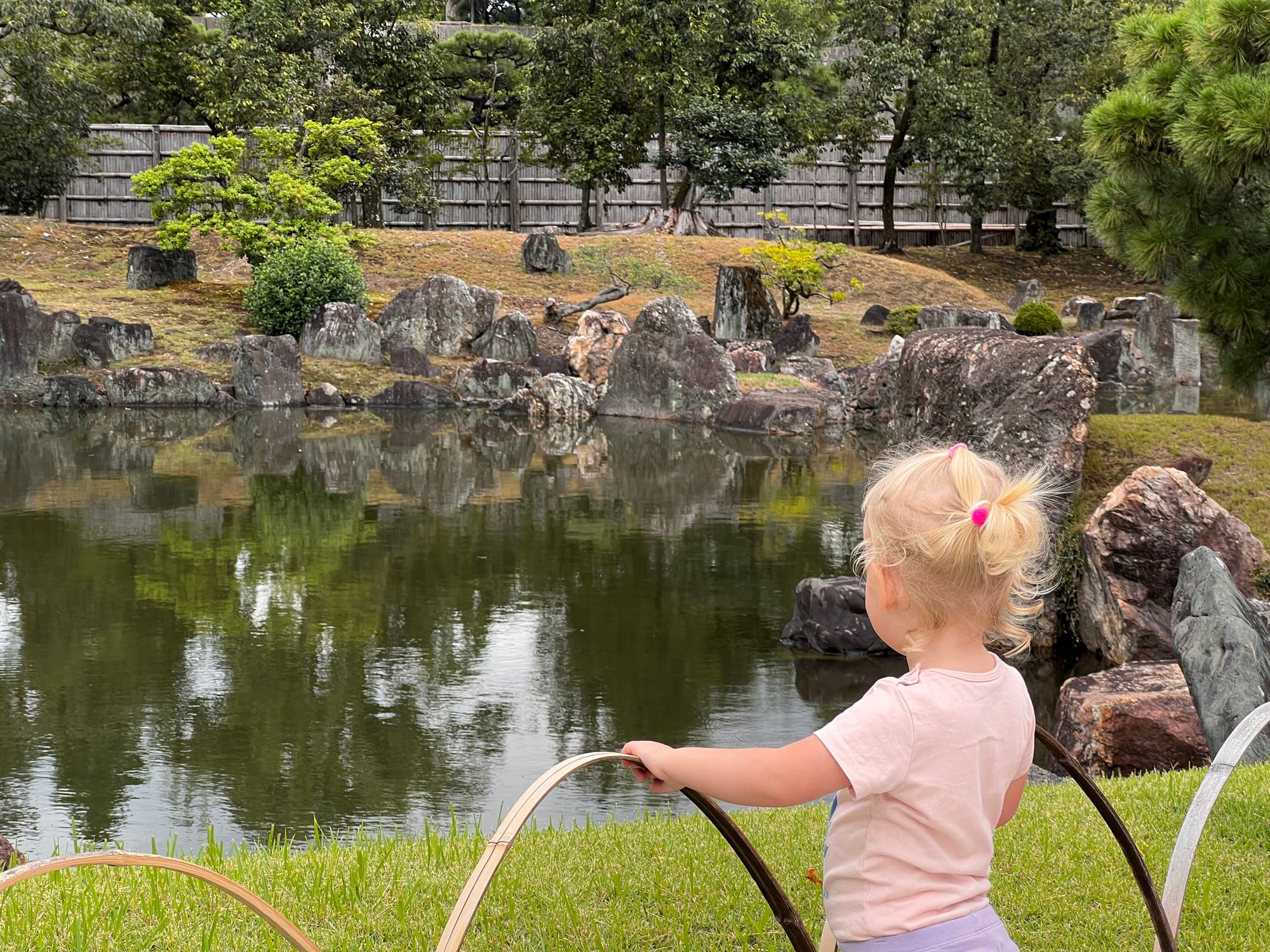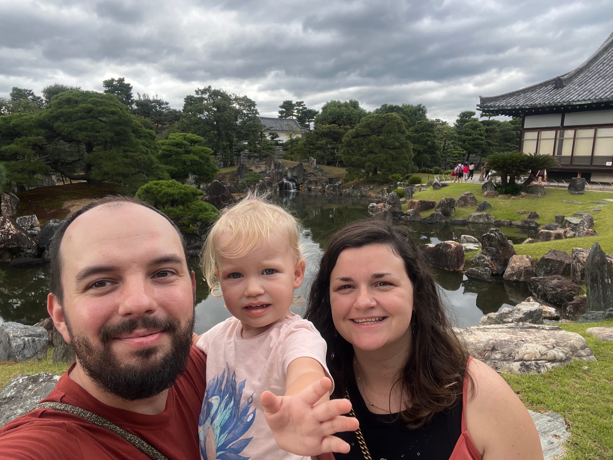 Dzisiaj rozpoczęliśmy dzień od odwiedzenia Zamku Nijo, należącego do zespołu zabytkowego dawnego Kioto, Uji i Otsu, wpisanego na listę światowego dziedzictwa UNESCO w 1994 roku. Był on siedzibą shogunów przez ponad 200 lat. Następnie, po upadku szogunatu, przekazany został Cesarzowi Meji i przez pewien czas pełnił funkcję pałacu cesarskiego, aby ostatecznie trafić do zasobów miasta Kioto, które umożliwiło jego zwiedzanie. Zamek Nijo spełniał również funkcje obronne i stanowił symbol militarnej potęgi rodu Tokugawa. Można zwiedzać go w środku, jednak przed wejściem konieczne jest ściągnięcie butów, jak również obowiązuje zakaz robienia zdjeć i nagrywania wideo. Na nas zdecydowanie większe wrażenie zrobiła zewnętrzna część zamku i piękne, otaczające go ogrody. Tosia z kolei najbardziej zachwycona była kamyczkami, które podnosiła i rzucała przed siebie.