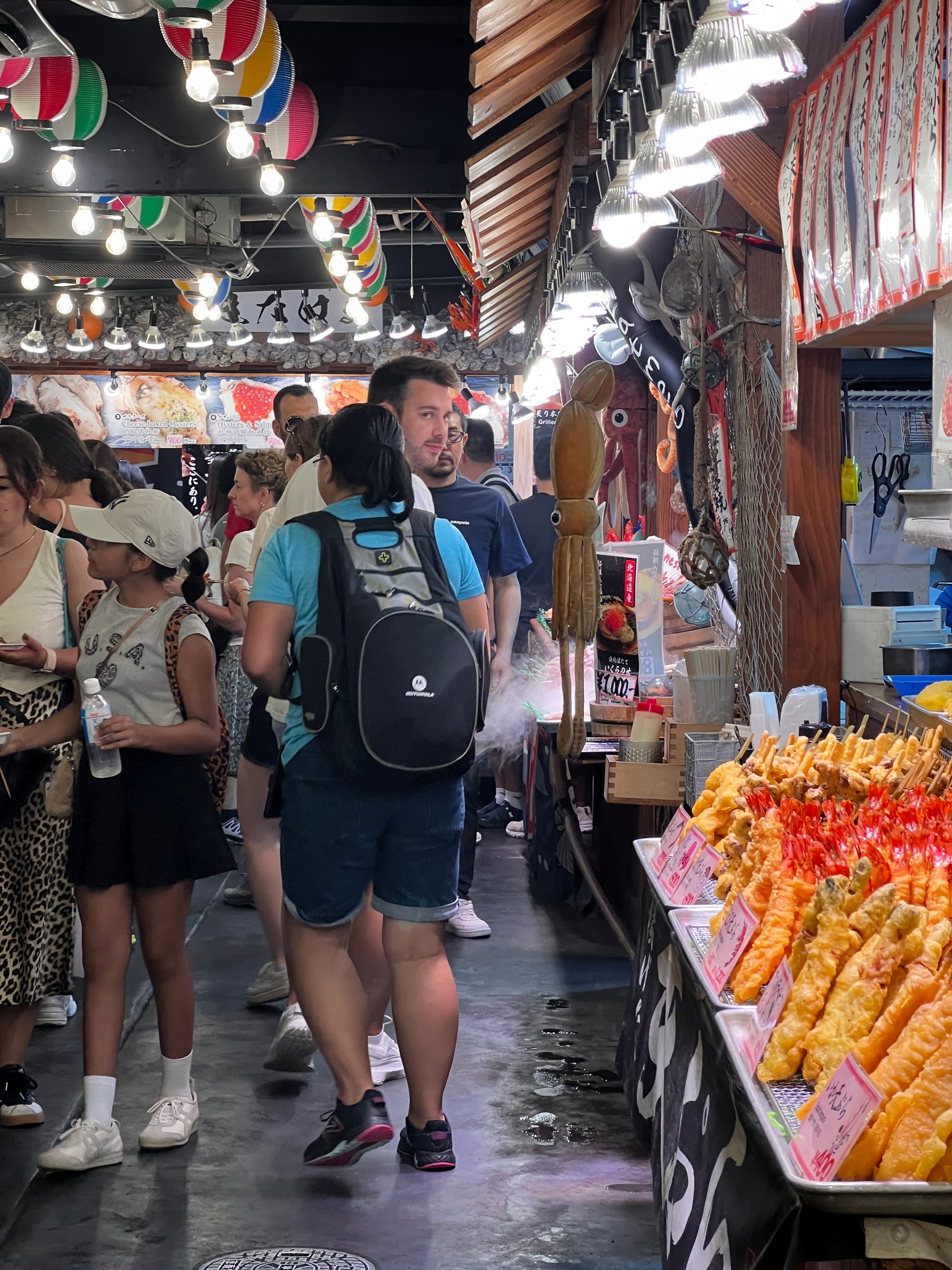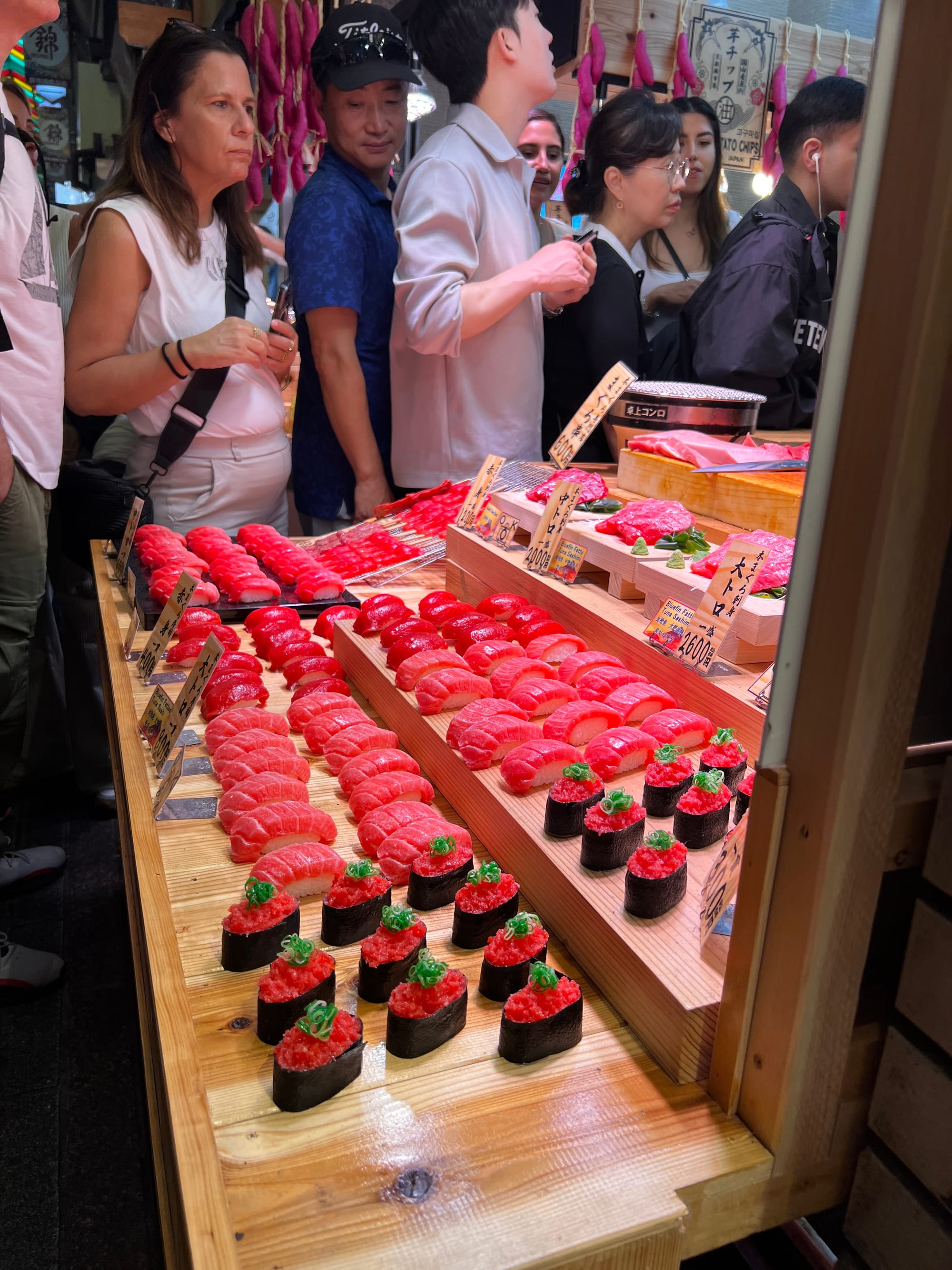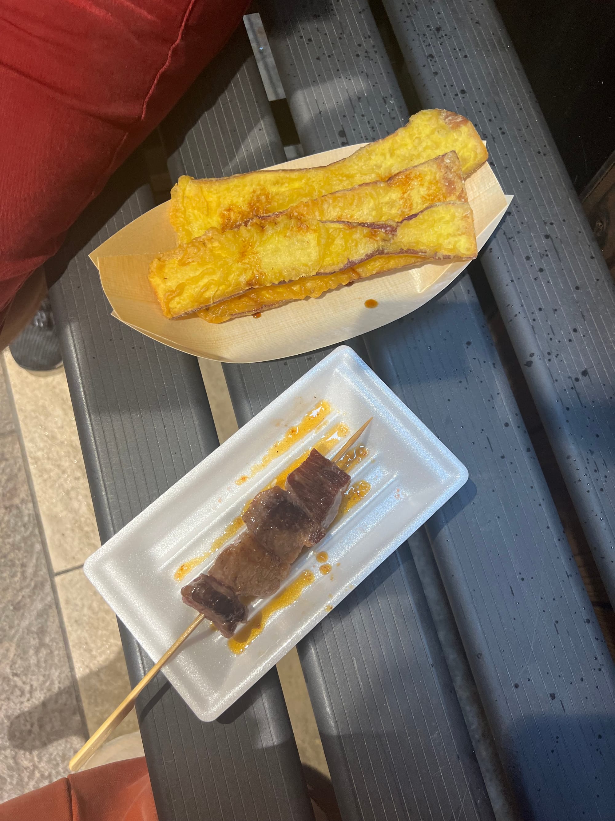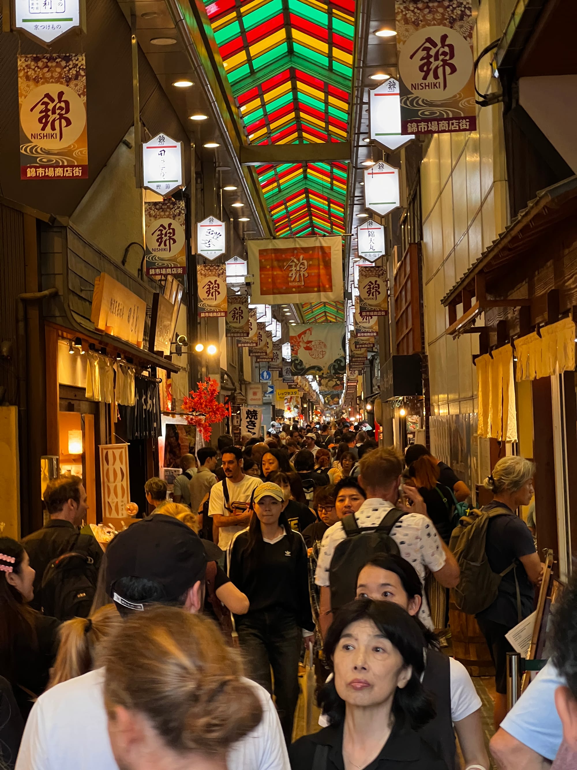 Z uwagi na pogorszenie się pogody i opady deszczu, musieliśmy nieco zmienić nasze plany i pomysleć o jakiejś atrakcji pod dachem. Nie ma ich jednak wiele na naszej liście w Kioto, toteż udaliśmy się do Nishiki Market, słynnego ponad 400-letniego japońskiego targu, na którym można zakupić wiele artykułów spożywczych, a także tradycyjne japońskie potrawy i pamiątki. Niestety na pomysł, aby właśnie tam schować się przed deszczem, wpadło wiele osób, co spowodowało, że zrobił się ogromny tłok, odbierający temu miejscu uroku. Udało nam się jednak skosztować kurczaka i batatów w tempurze oraz słynnej wołowiny kobe, która dosłownie rozpływa się w ustach, nie dziwi więc, że jest określana najlepszą wołowiną na świecie.