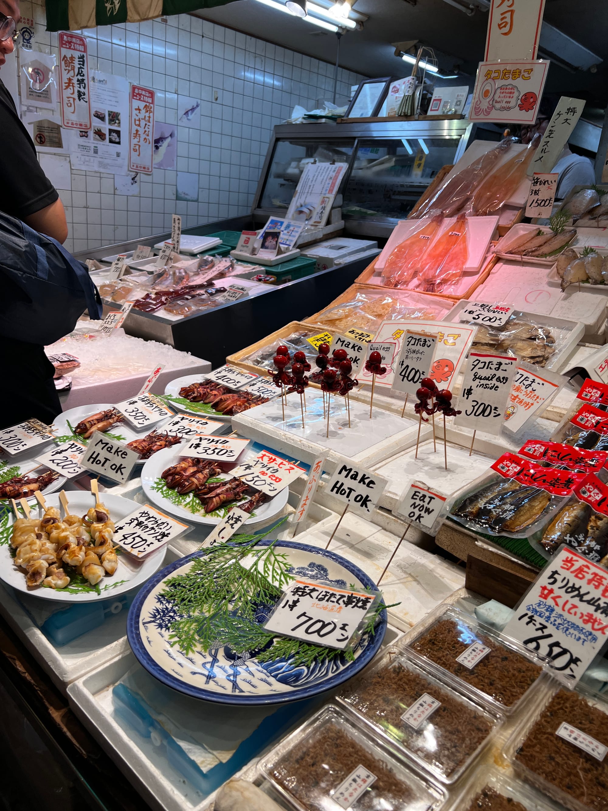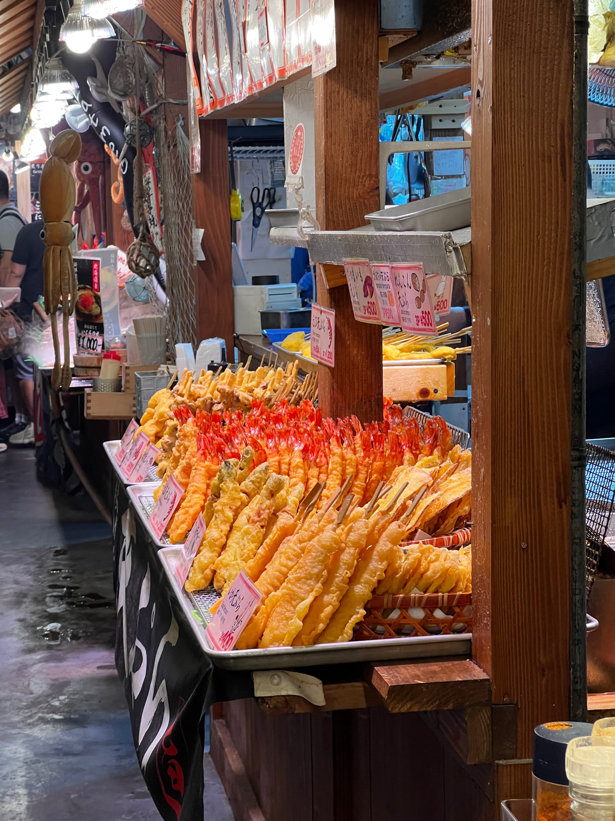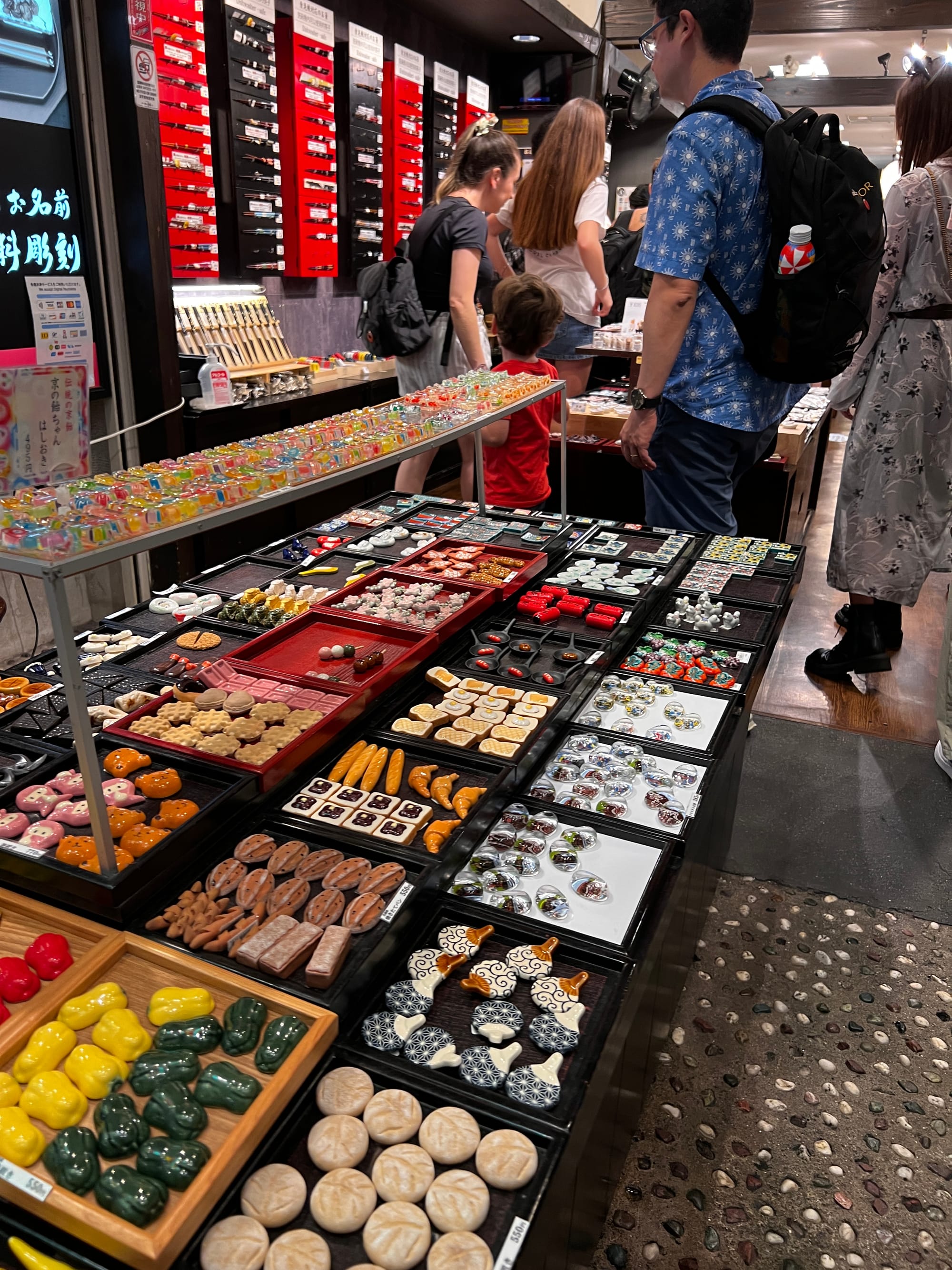 Z uwagi na pogorszenie się pogody i opady deszczu, musieliśmy nieco zmienić nasze plany i pomysleć o jakiejś atrakcji pod dachem. Nie ma ich jednak wiele na naszej liście w Kioto, toteż udaliśmy się do Nishiki Market, słynnego ponad 400-letniego japońskiego targu, na którym można zakupić wiele artykułów spożywczych, a także tradycyjne japońskie potrawy i pamiątki. Niestety na pomysł, aby właśnie tam schować się przed deszczem, wpadło wiele osób, co spowodowało, że zrobił się ogromny tłok, odbierający temu miejscu uroku. Udało nam się jednak skosztować kurczaka i batatów w tempurze oraz słynnej wołowiny kobe, która dosłownie rozpływa się w ustach, nie dziwi więc, że jest określana najlepszą wołowiną na świecie.