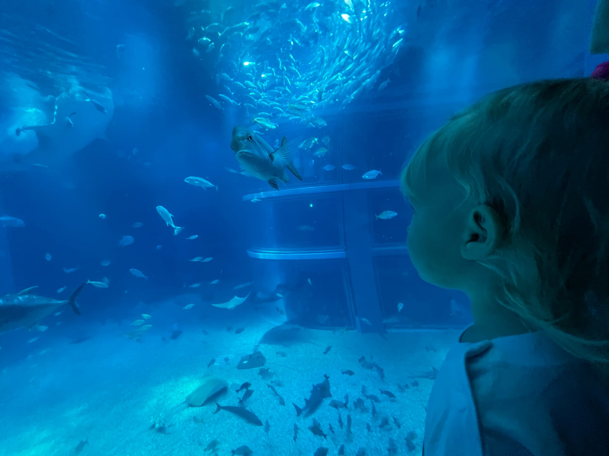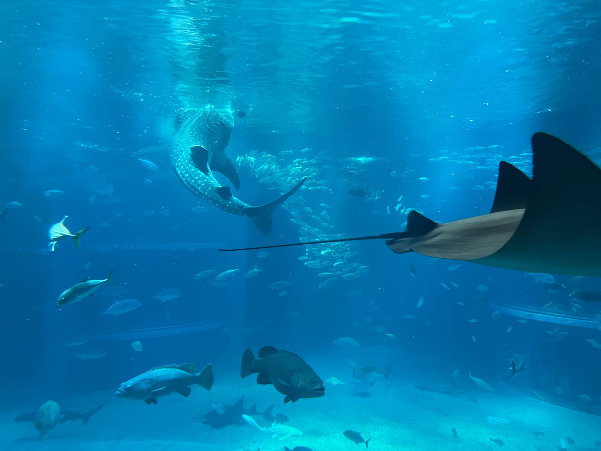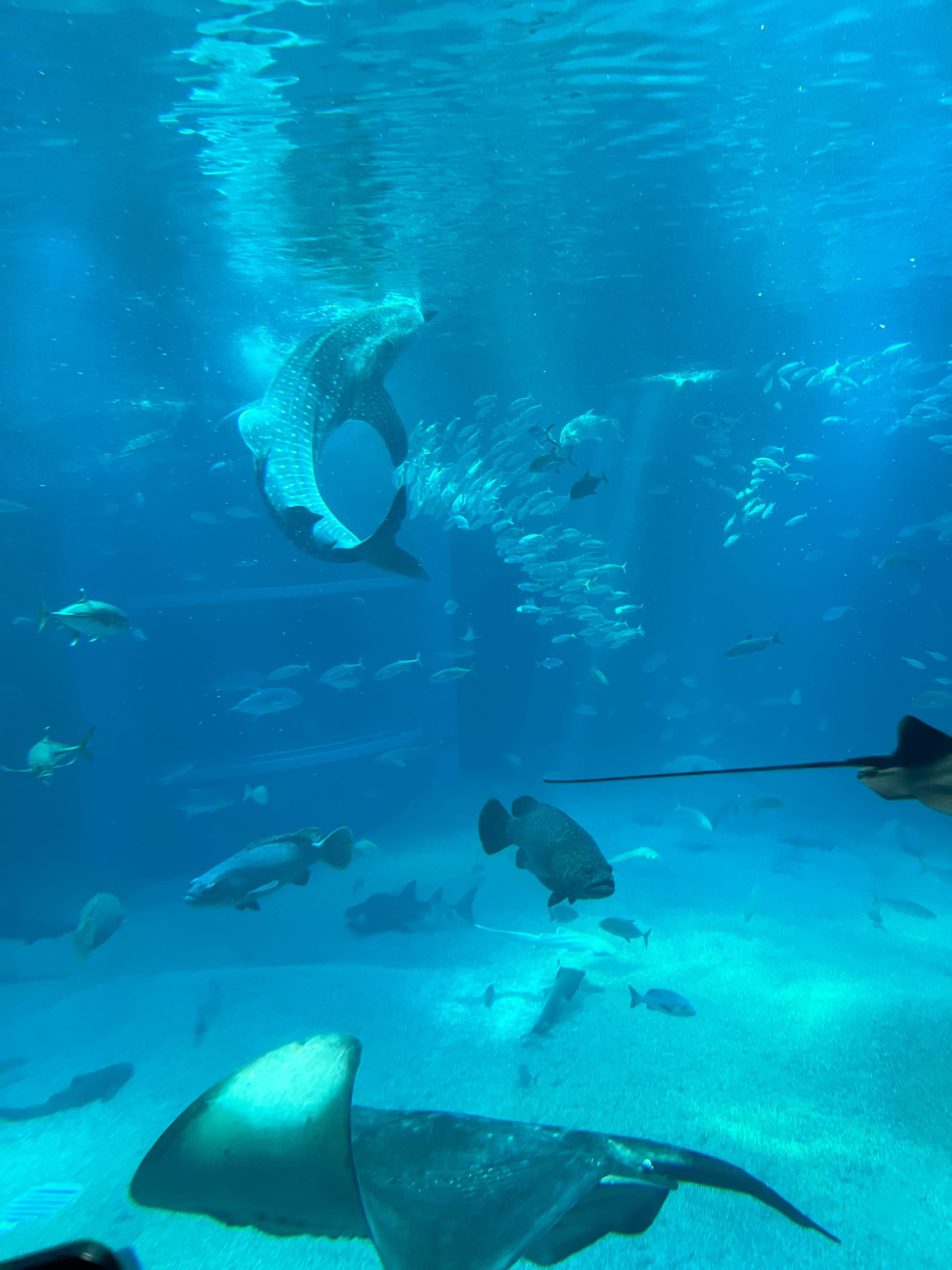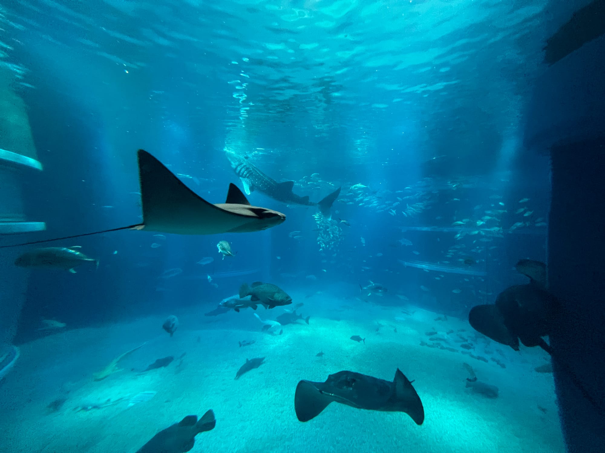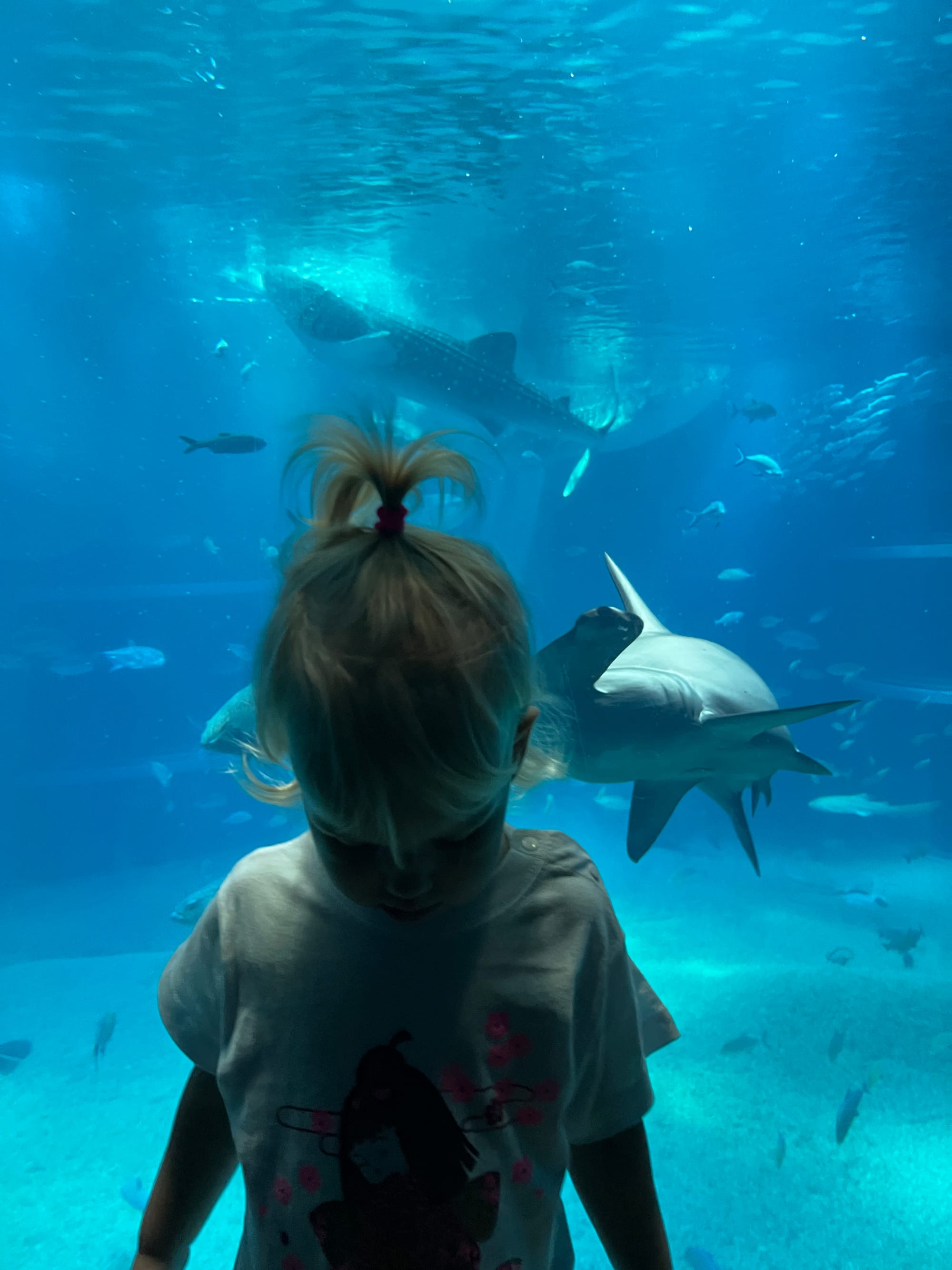 Początkowo w Akwarium było bardzo tłoczno, na szczęście jednak z czasem ludzie rozeszli się trochę po tym ośmiopiętrowym obiekcie i można było już swobodnej oglądać morskie stworzenia. Byliśmy pod dużym wrażeniem ogromnego akwarium, które zajmowało kilka pięter i w którym pływały takie imponujące osobniki jak rekiny wielorybie, rekiny młoty czy wielkie płaszczki. Zrobiliśmy trochę zdjęć z pobytu w Akwarium, jednak nie oddają one tego, jak efektownie wygląda to na żywo.