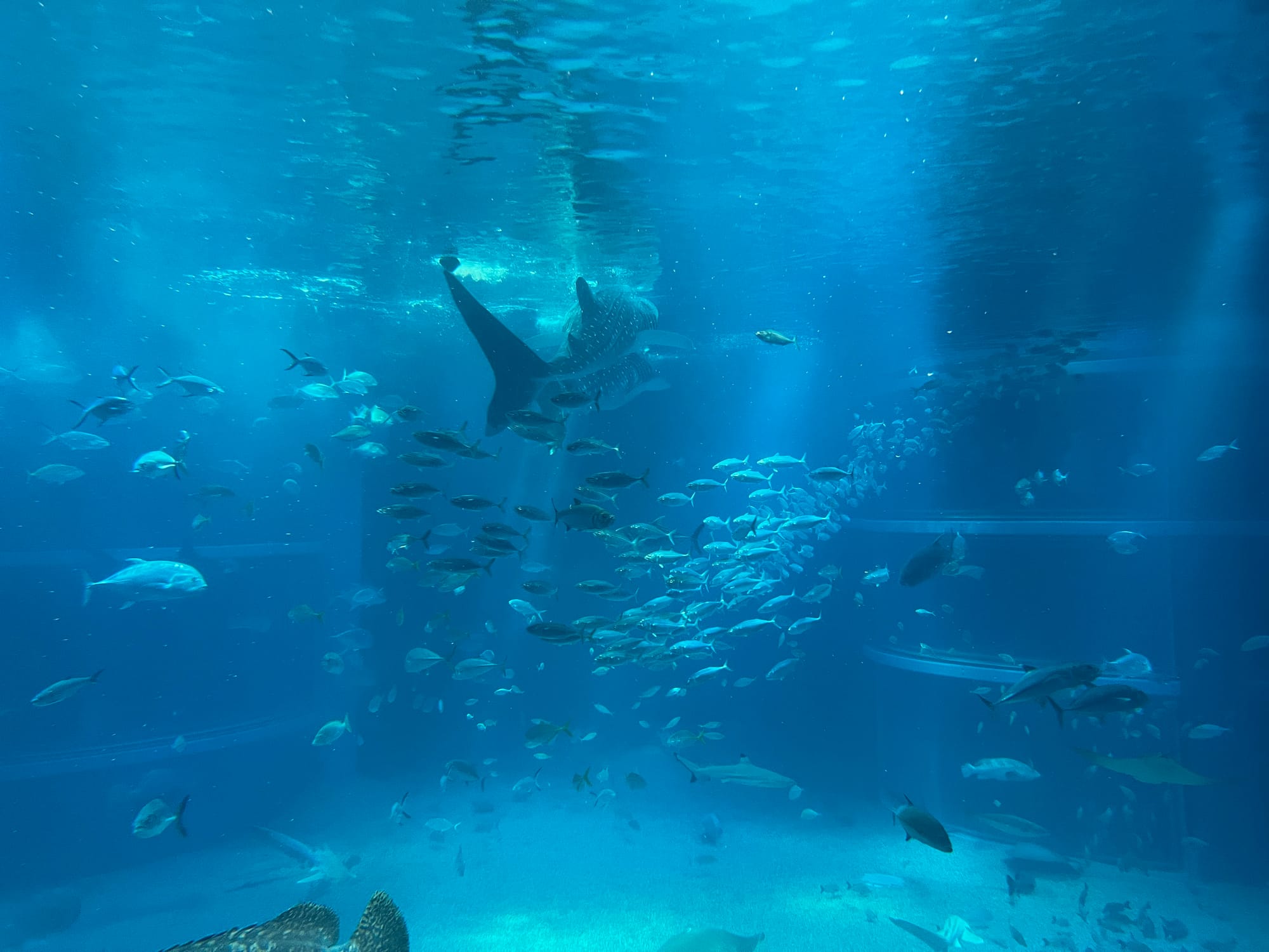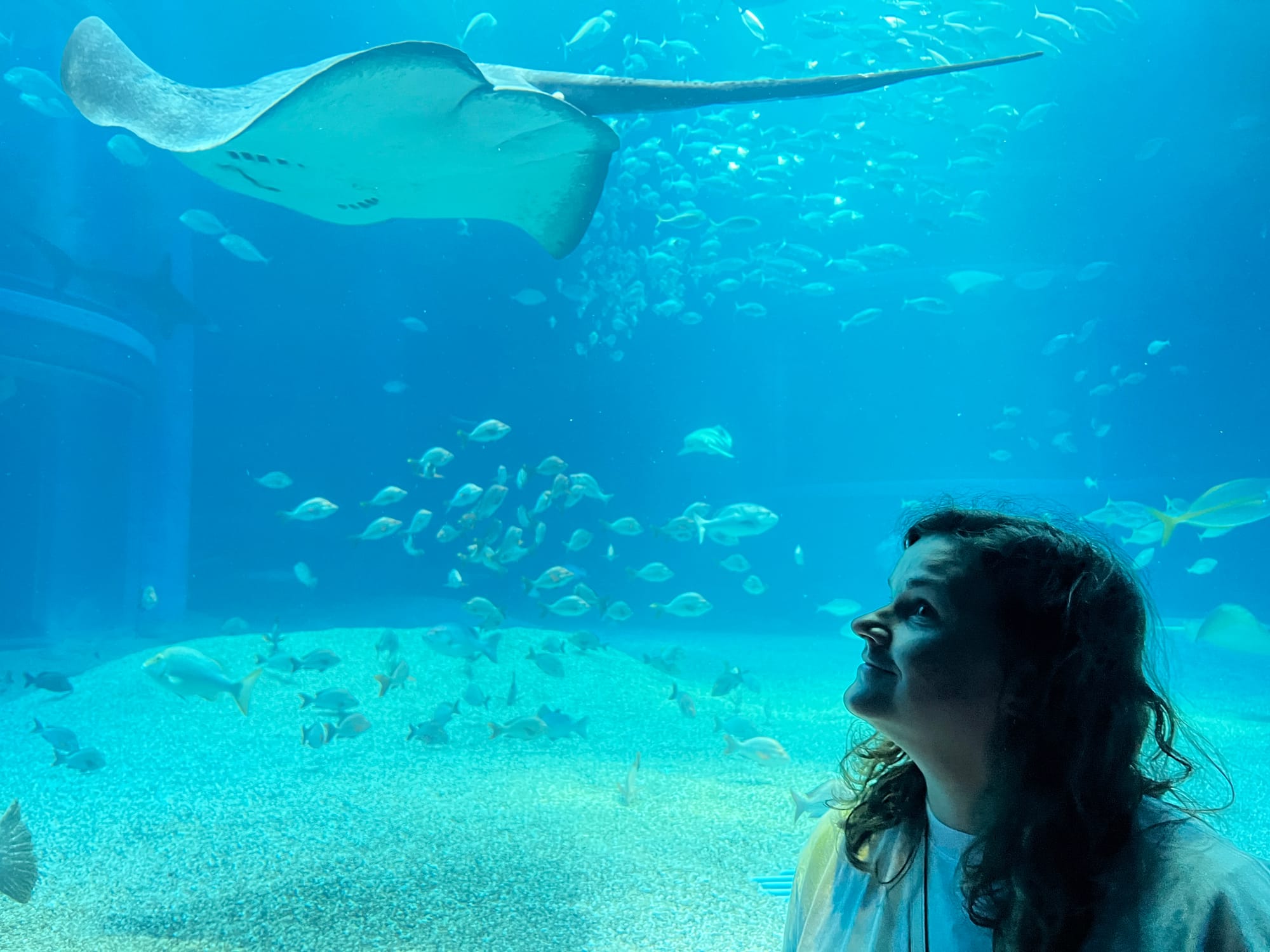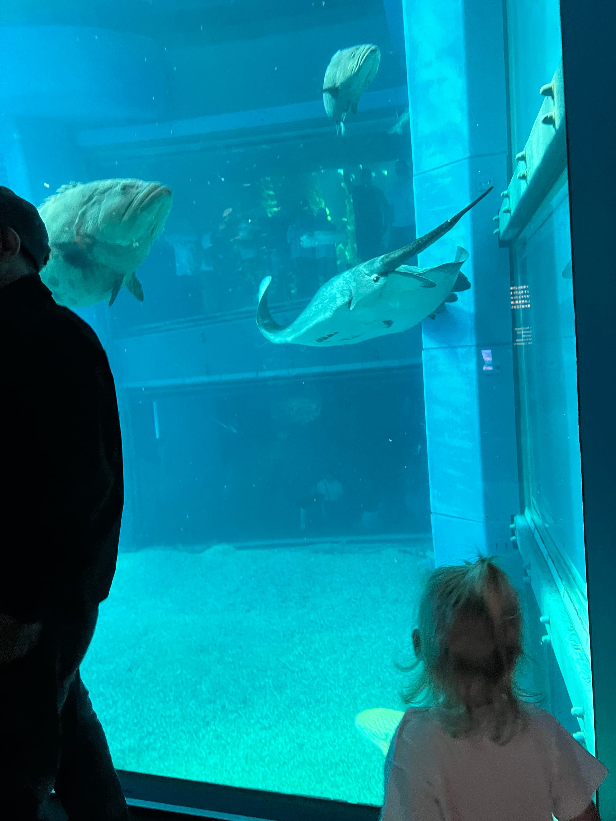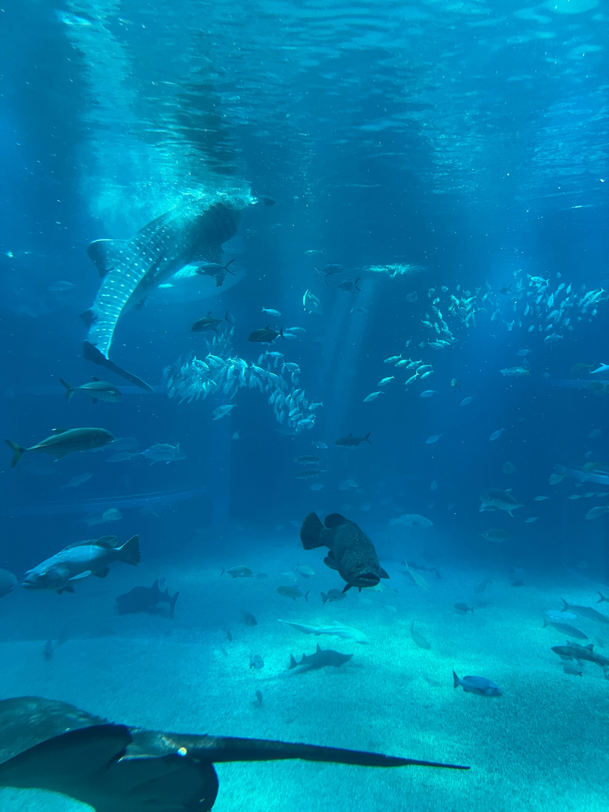 Początkowo w Akwarium było bardzo tłoczno, na szczęście jednak z czasem ludzie rozeszli się trochę po tym ośmiopiętrowym obiekcie i można było już swobodnej oglądać morskie stworzenia. Byliśmy pod dużym wrażeniem ogromnego akwarium, które zajmowało kilka pięter i w którym pływały takie imponujące osobniki jak rekiny wielorybie, rekiny młoty czy wielkie płaszczki. Zrobiliśmy trochę zdjęć z pobytu w Akwarium, jednak nie oddają one tego, jak efektownie wygląda to na żywo.