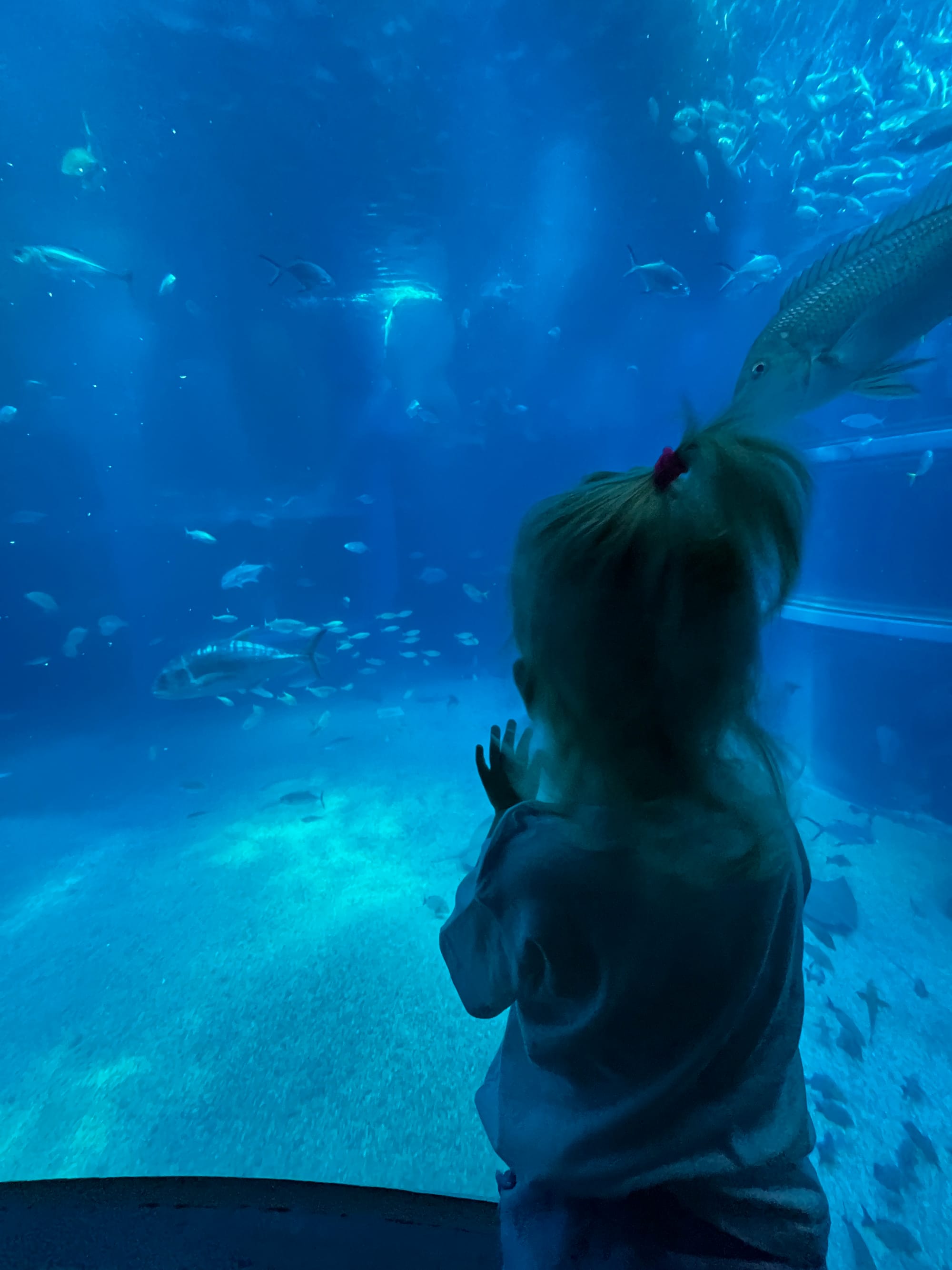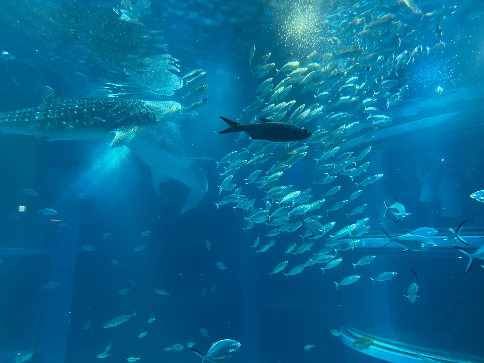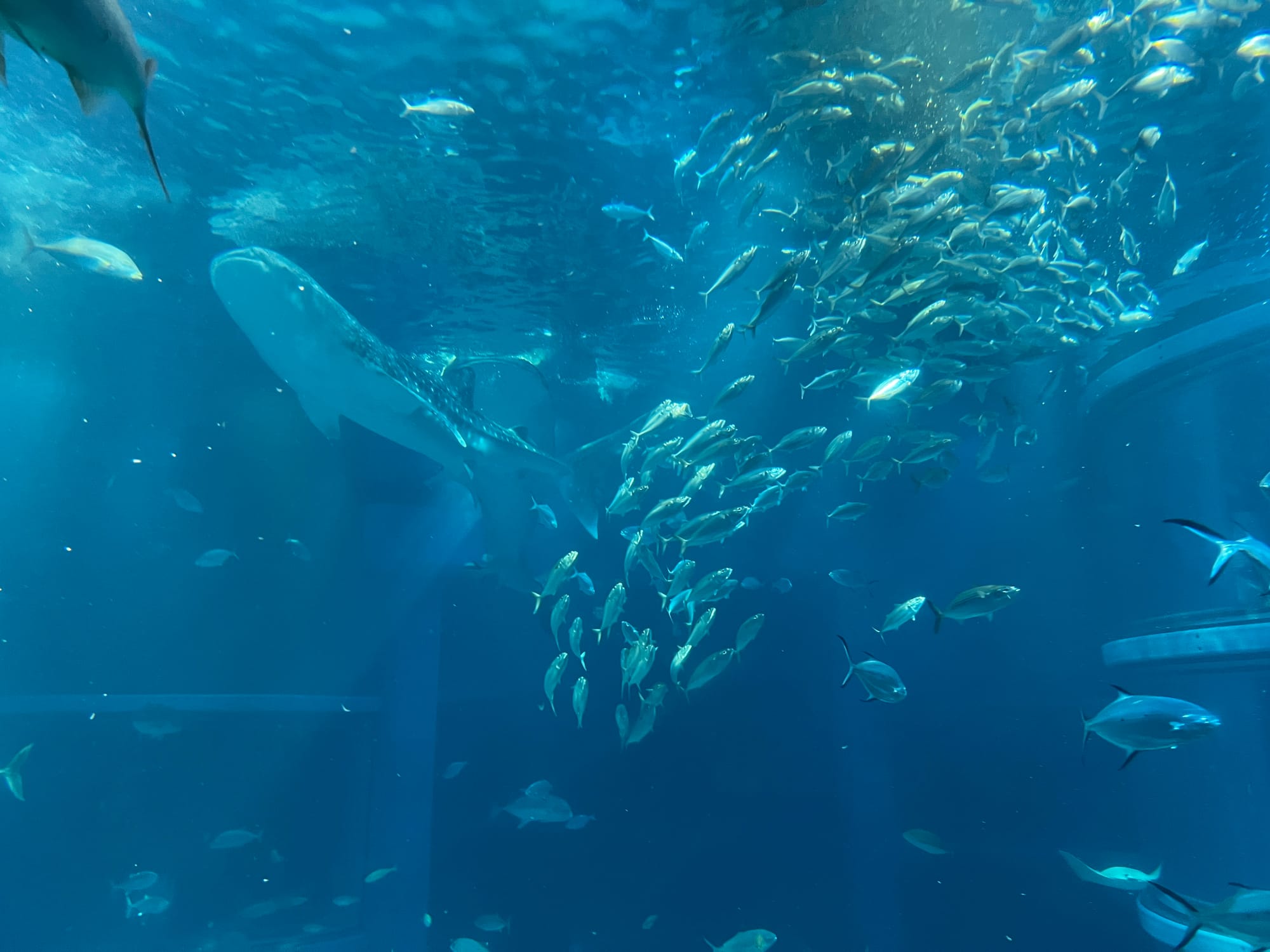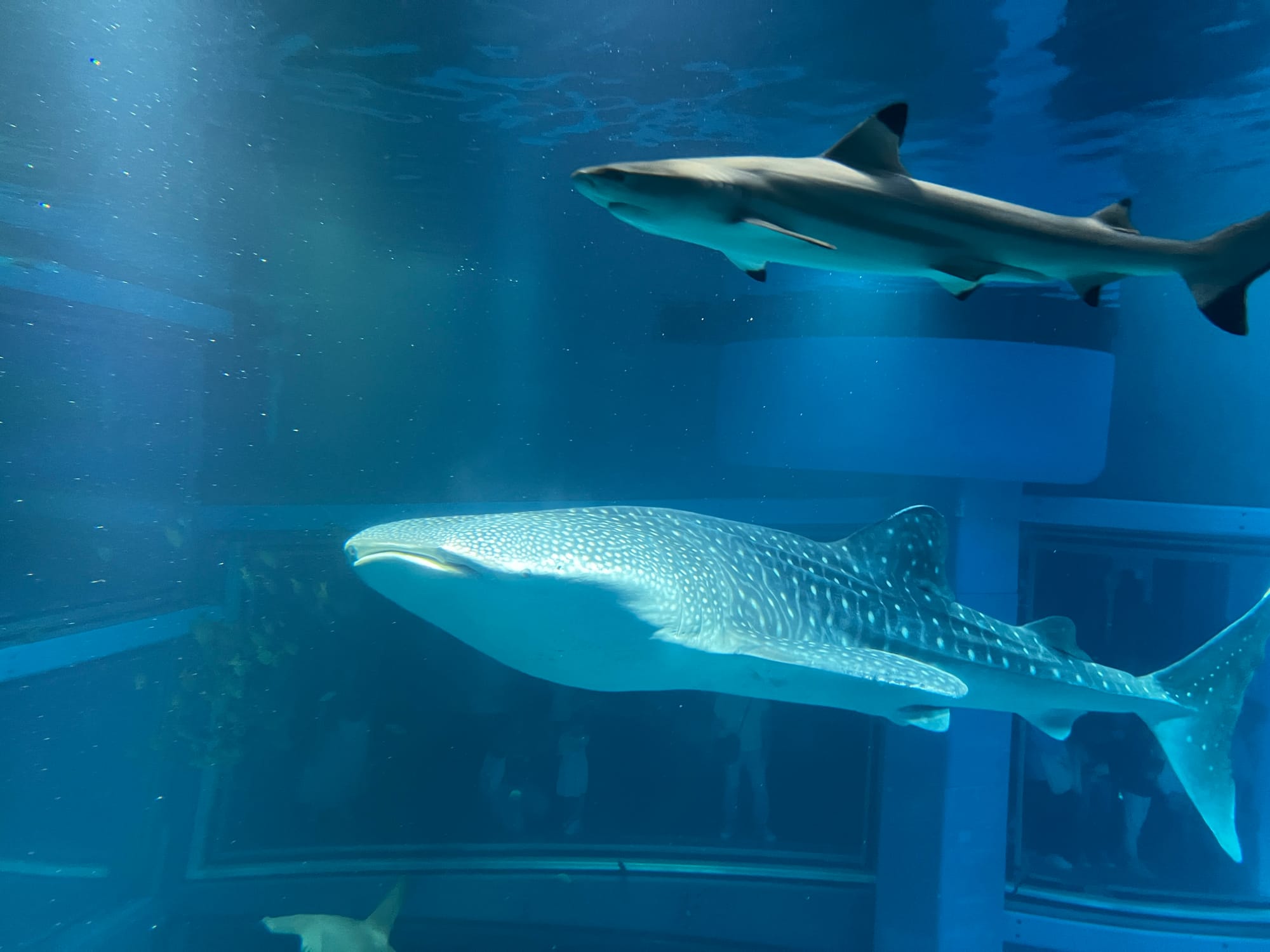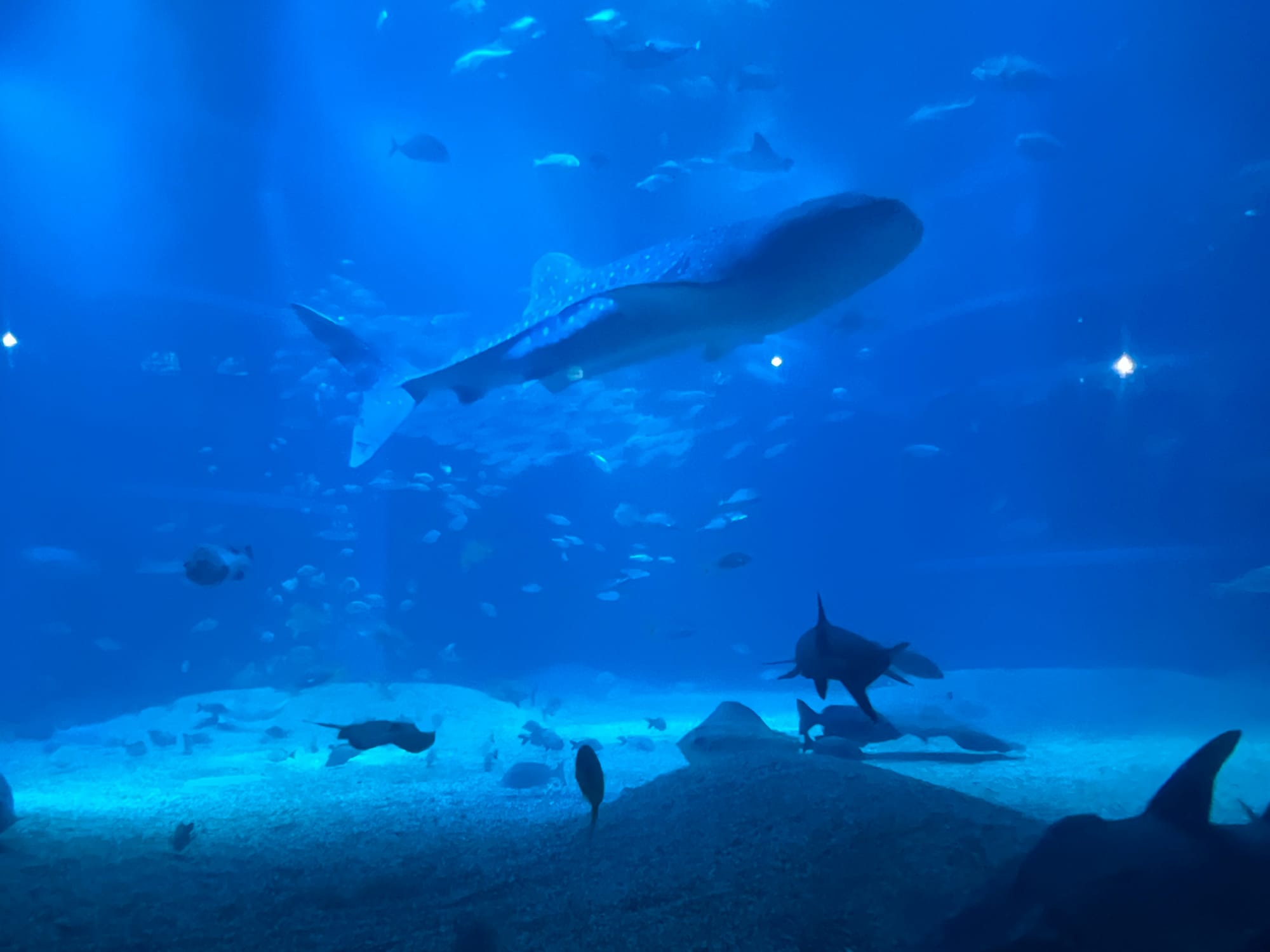 Początkowo w Akwarium było bardzo tłoczno, na szczęście jednak z czasem ludzie rozeszli się trochę po tym ośmiopiętrowym obiekcie i można było już swobodnej oglądać morskie stworzenia. Byliśmy pod dużym wrażeniem ogromnego akwarium, które zajmowało kilka pięter i w którym pływały takie imponujące osobniki jak rekiny wielorybie, rekiny młoty czy wielkie płaszczki. Zrobiliśmy trochę zdjęć z pobytu w Akwarium, jednak nie oddają one tego, jak efektownie wygląda to na żywo.