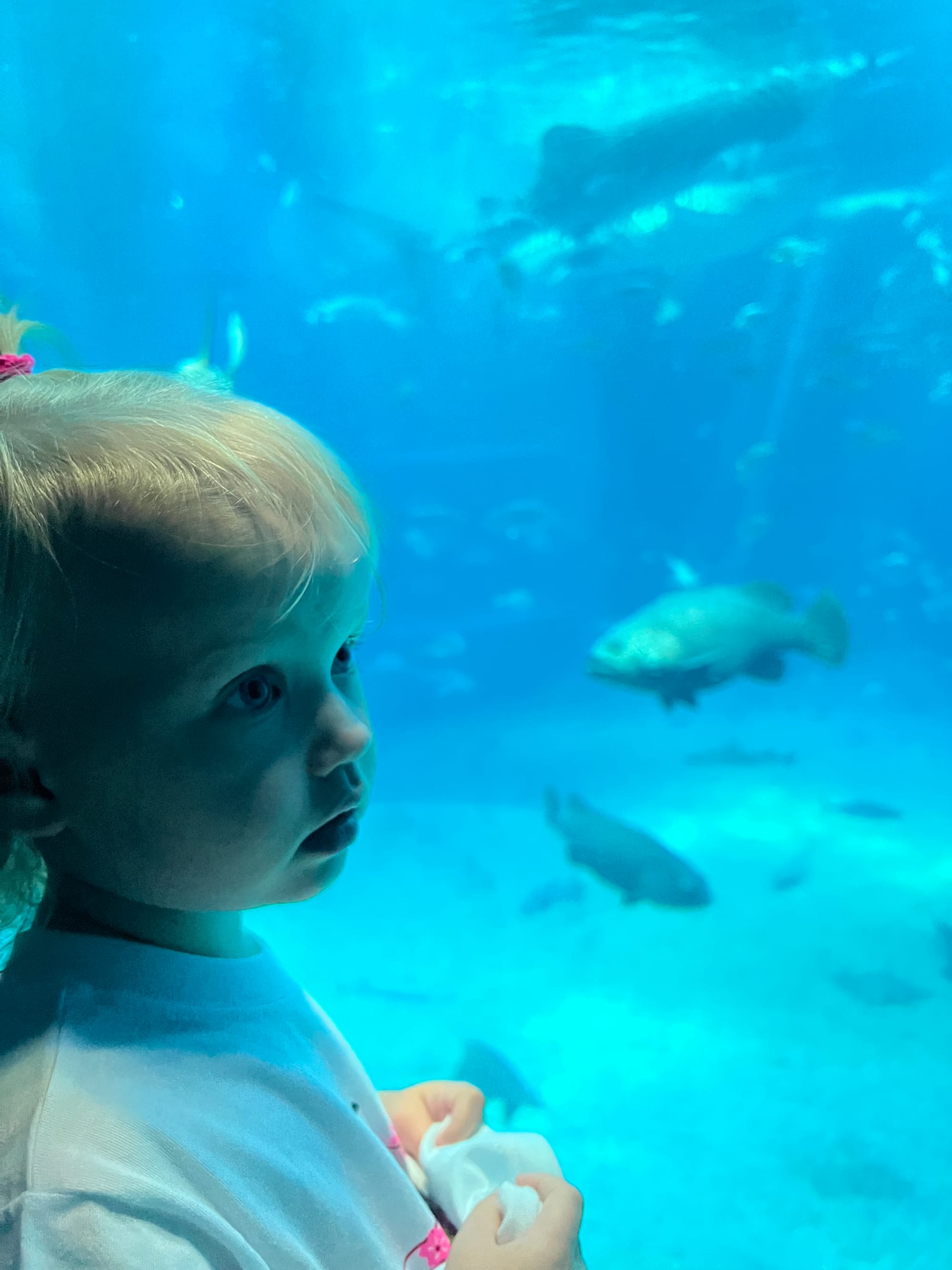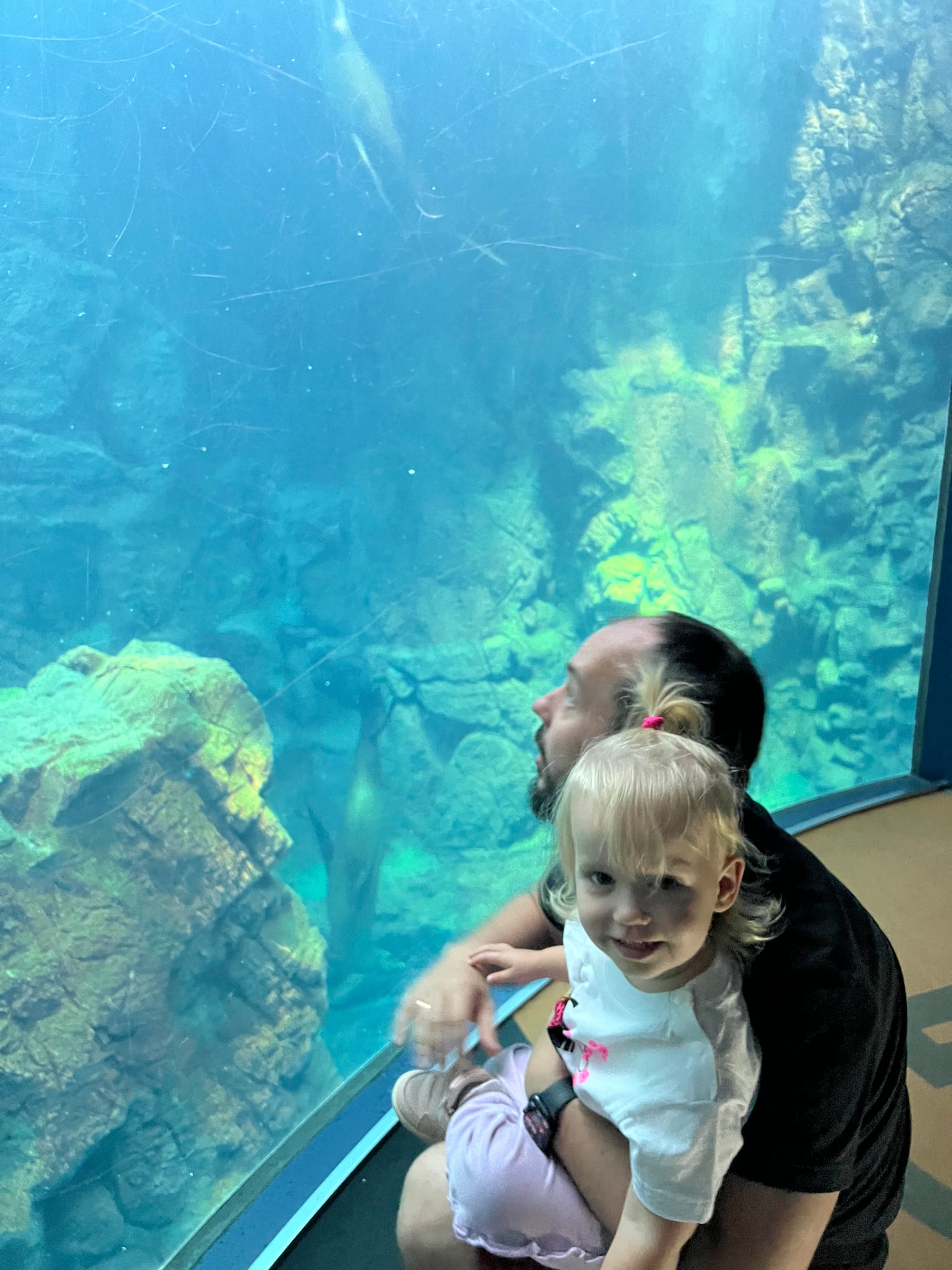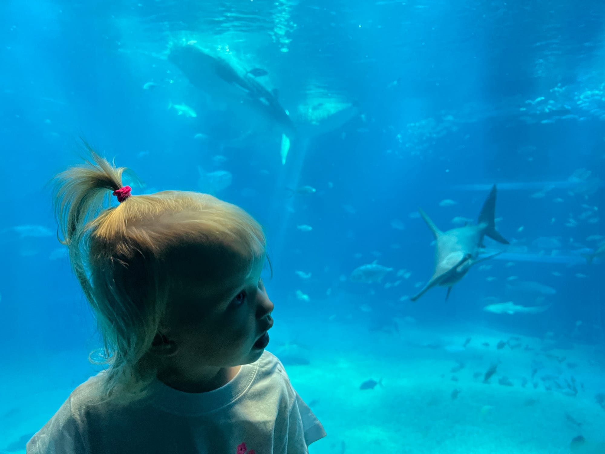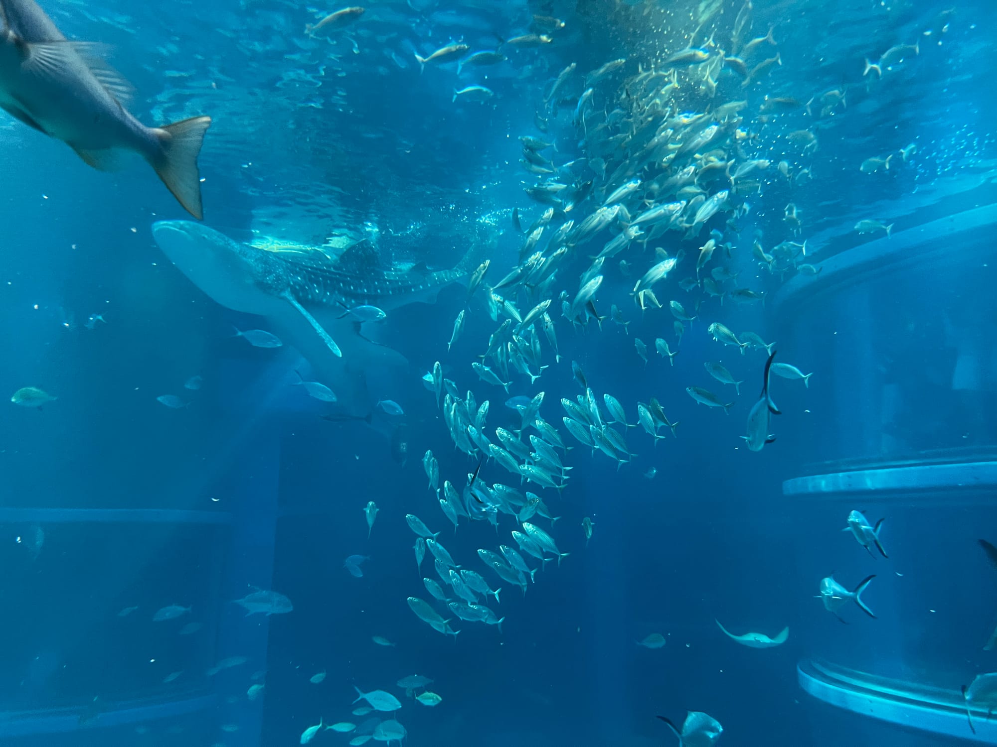 Początkowo w Akwarium było bardzo tłoczno, na szczęście jednak z czasem ludzie rozeszli się trochę po tym ośmiopiętrowym obiekcie i można było już swobodnej oglądać morskie stworzenia. Byliśmy pod dużym wrażeniem ogromnego akwarium, które zajmowało kilka pięter i w którym pływały takie imponujące osobniki jak rekiny wielorybie, rekiny młoty czy wielkie płaszczki. Zrobiliśmy trochę zdjęć z pobytu w Akwarium, jednak nie oddają one tego, jak efektownie wygląda to na żywo.