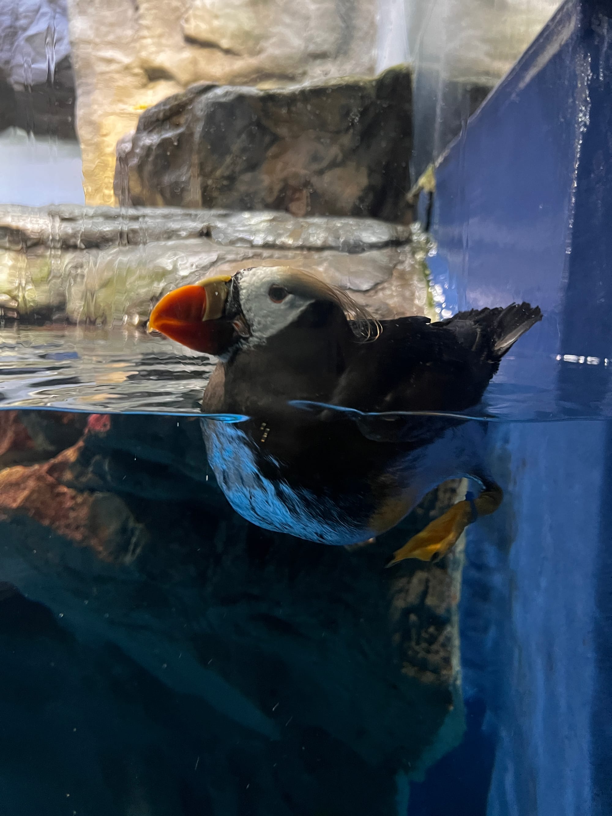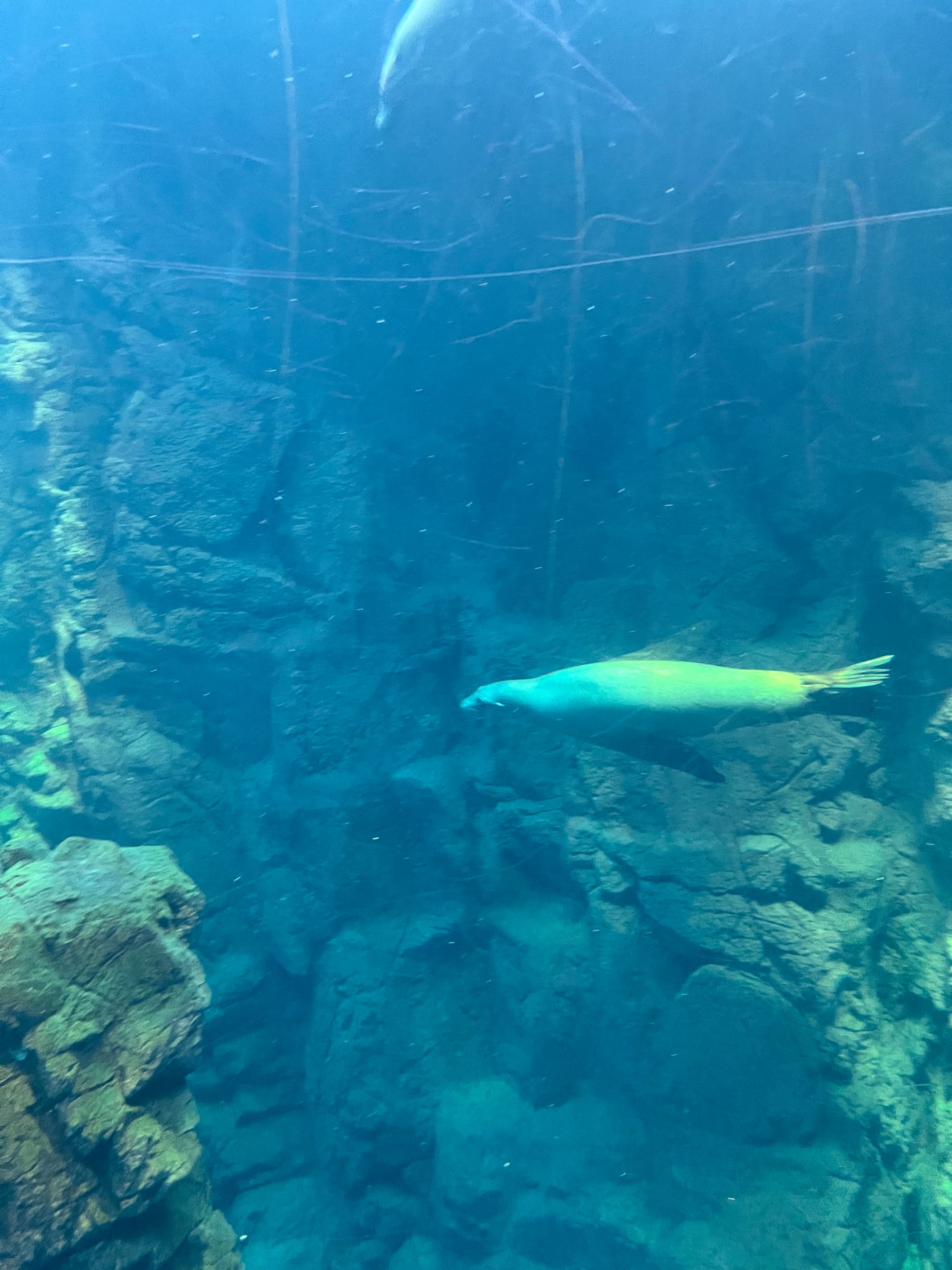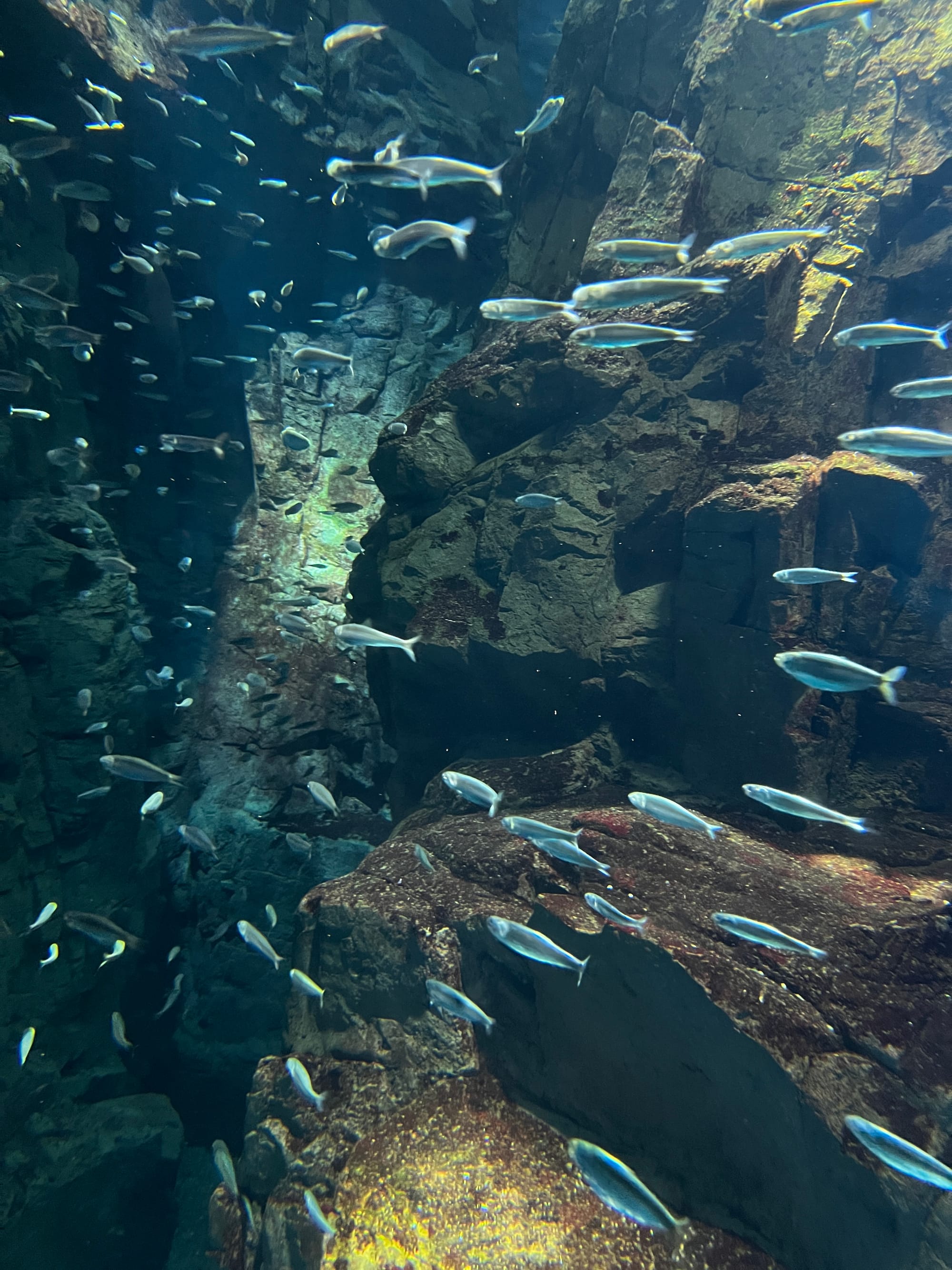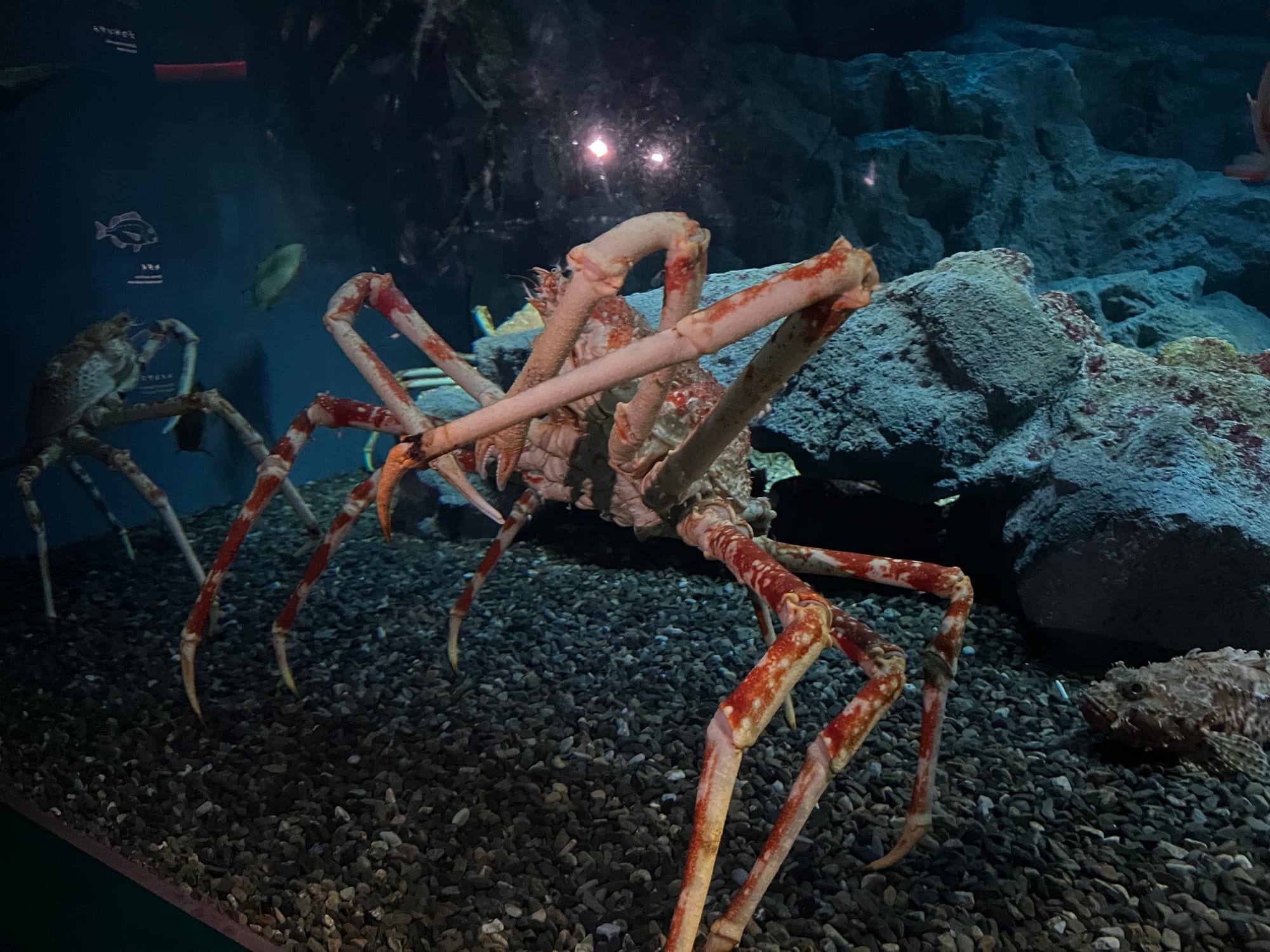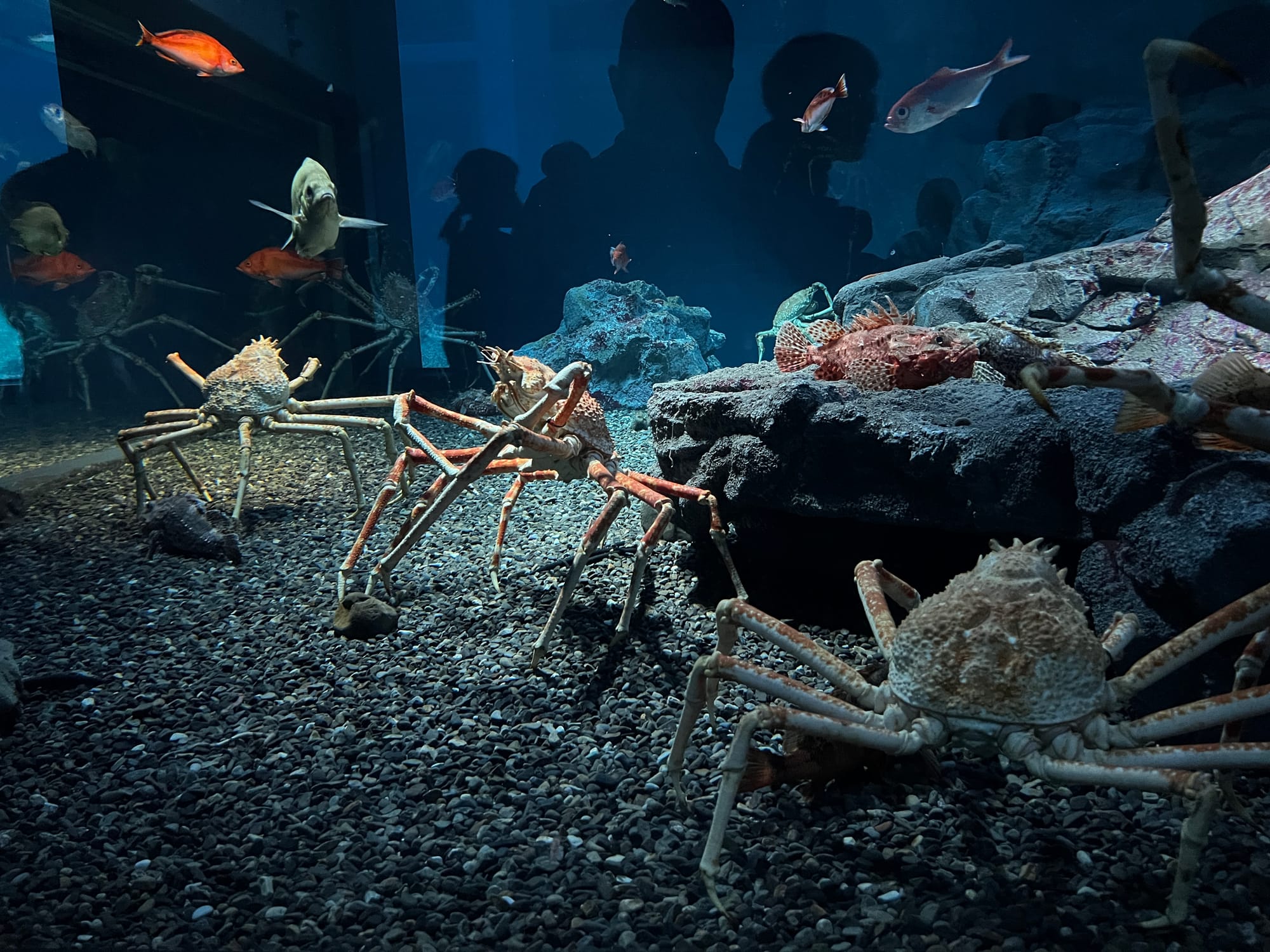 Początkowo w Akwarium było bardzo tłoczno, na szczęście jednak z czasem ludzie rozeszli się trochę po tym ośmiopiętrowym obiekcie i można było już swobodnej oglądać morskie stworzenia. Byliśmy pod dużym wrażeniem ogromnego akwarium, które zajmowało kilka pięter i w którym pływały takie imponujące osobniki jak rekiny wielorybie, rekiny młoty czy wielkie płaszczki. Zrobiliśmy trochę zdjęć z pobytu w Akwarium, jednak nie oddają one tego, jak efektownie wygląda to na żywo.