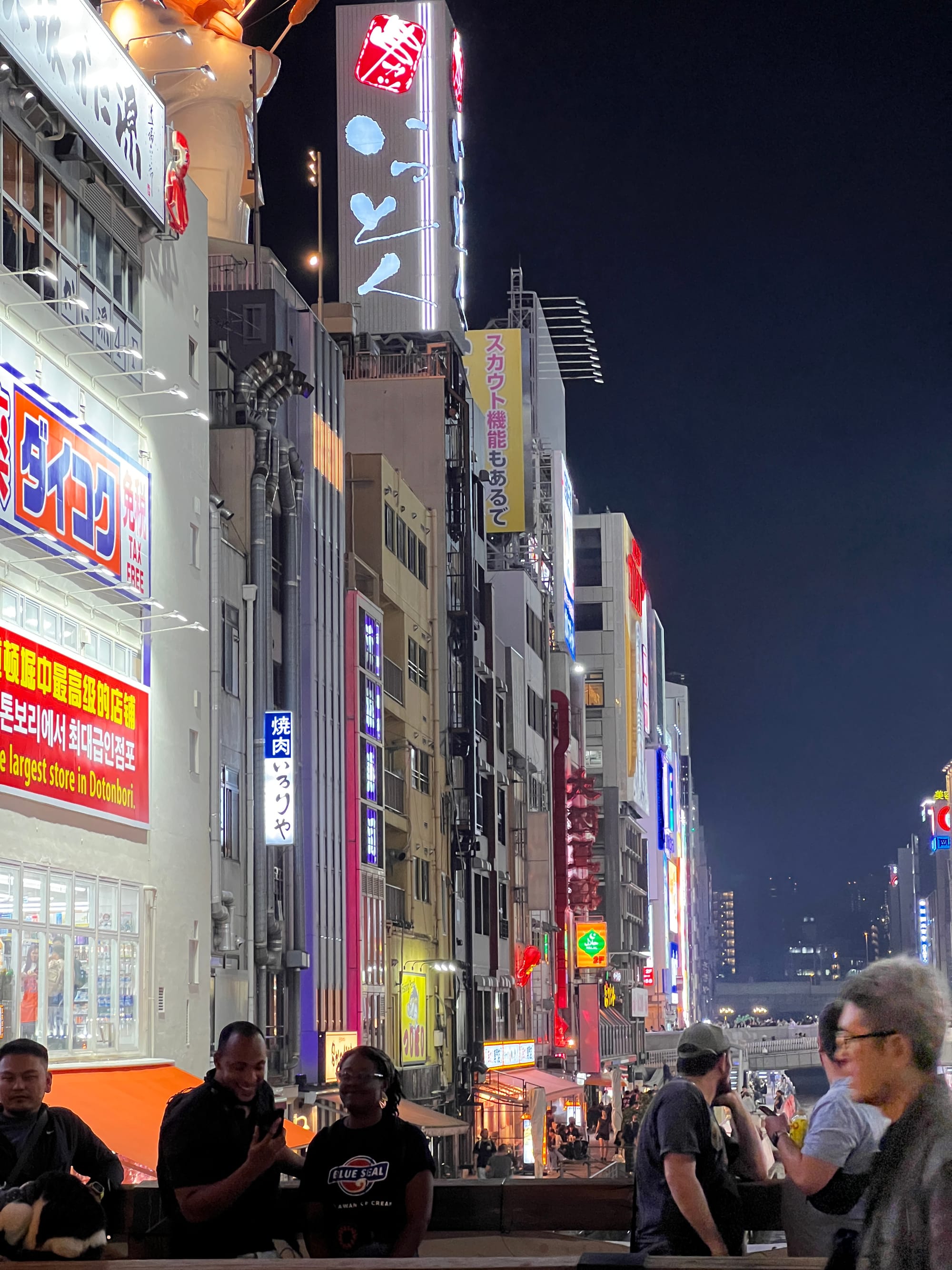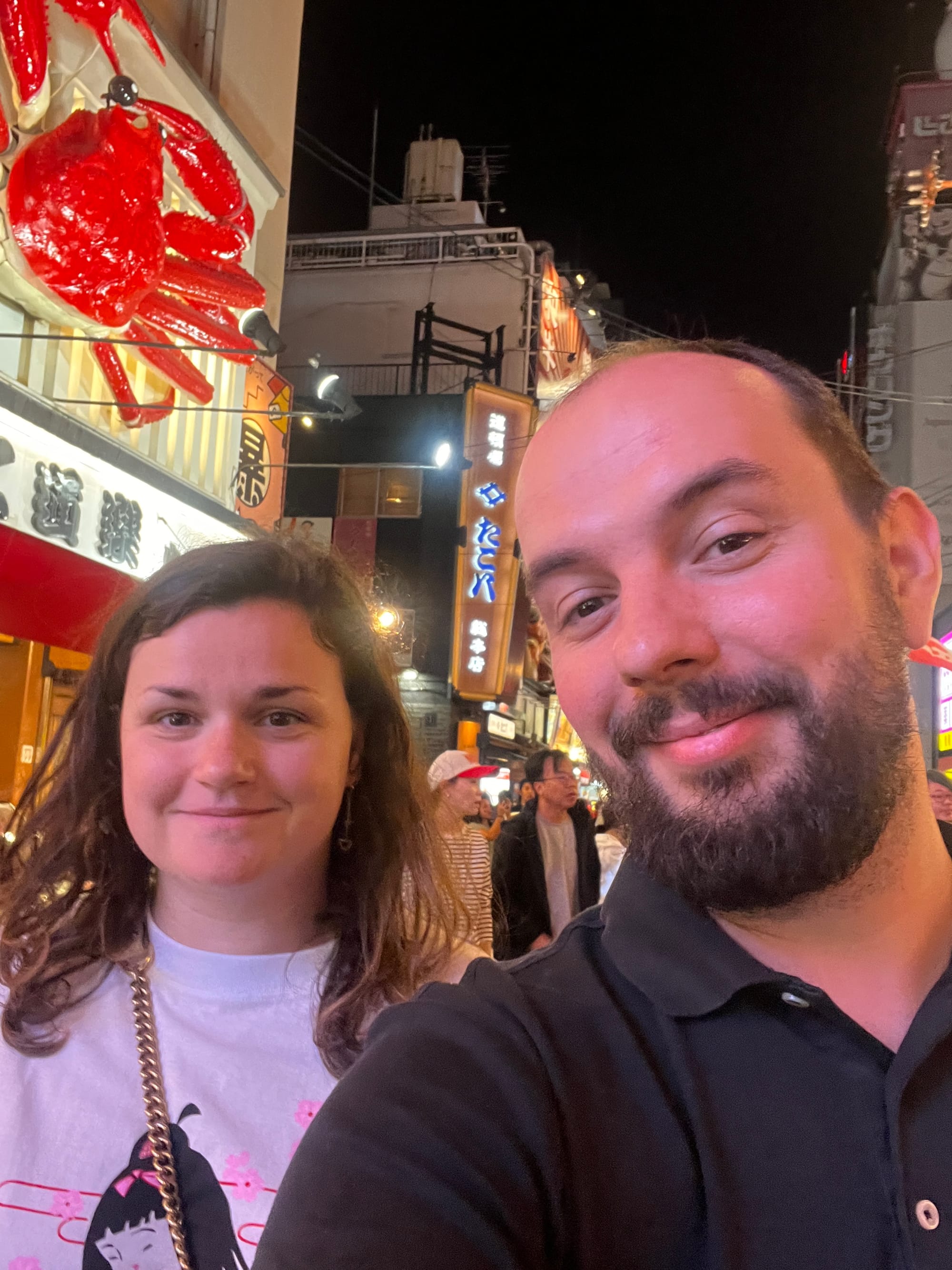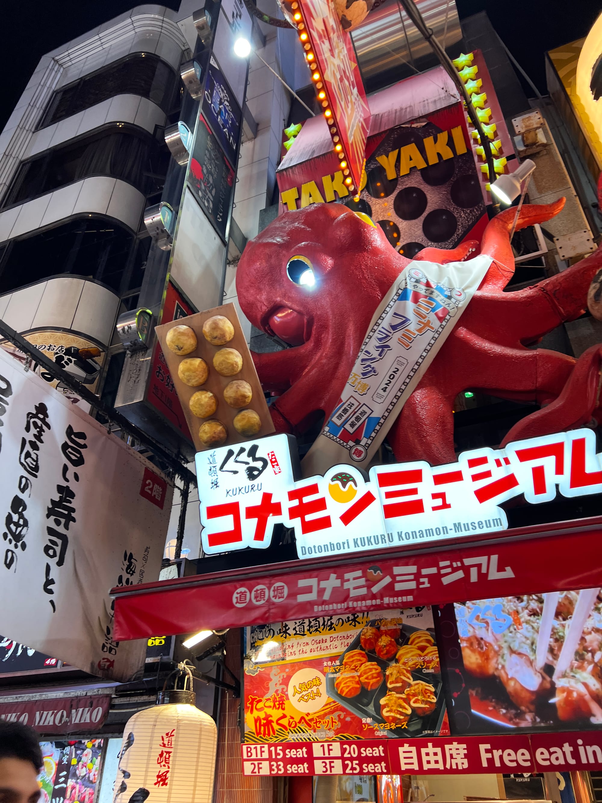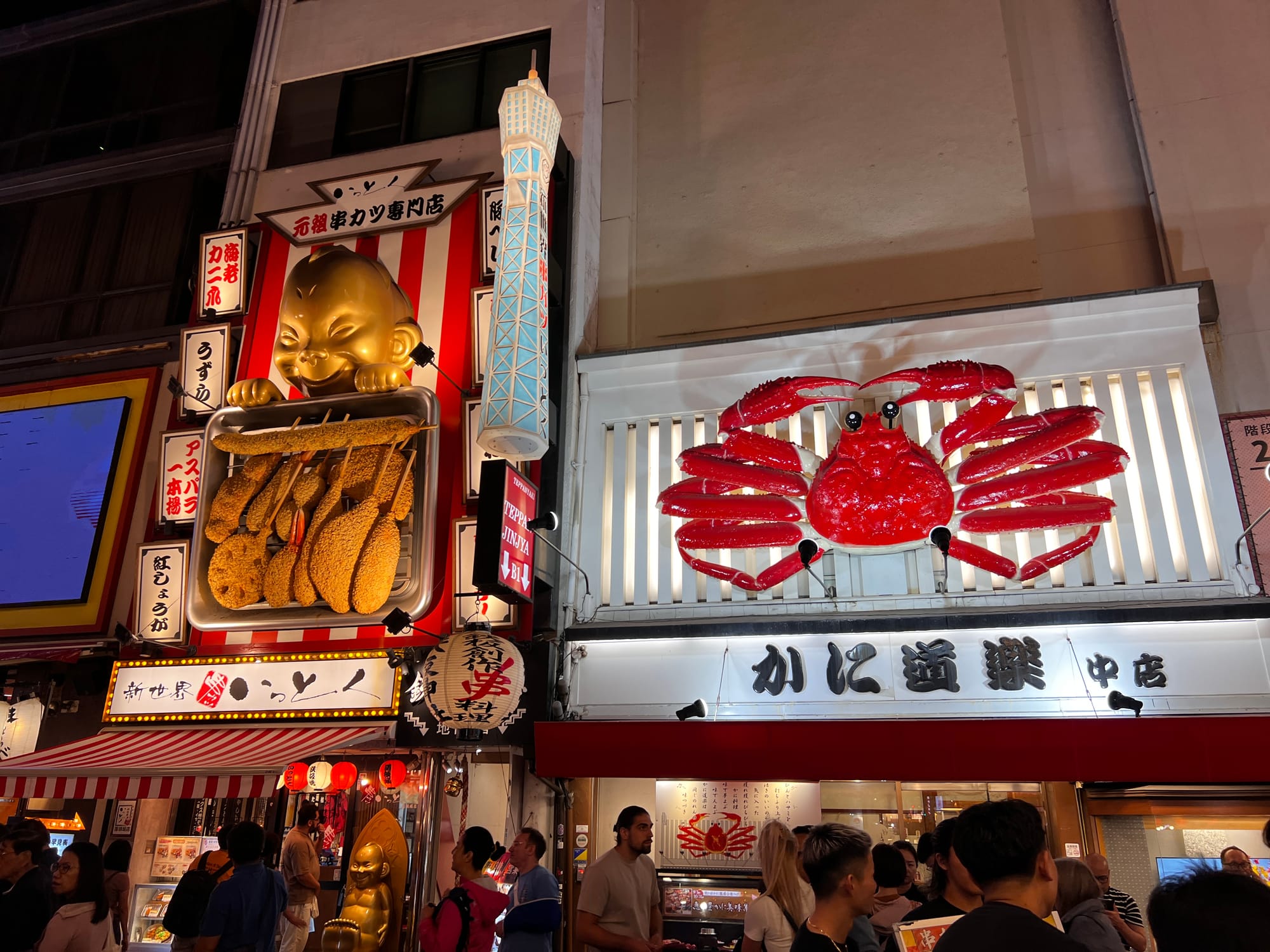 Po wizycie w Akwarium, udaliśmy się do hotelu, a następnie wyruszyliśmy do Dontobori. Jest to obszar Osaki, który słynie z neonów, sklepów, klubów i restauracji serwujących miejscowe przysmaki. Miejsce to jest kiczowate, jednak ma swój niepowtarzalny klimat, a dodatkowego uroku dodaje mu usytuowanie nad rzeczką o takiej samej nazwie.