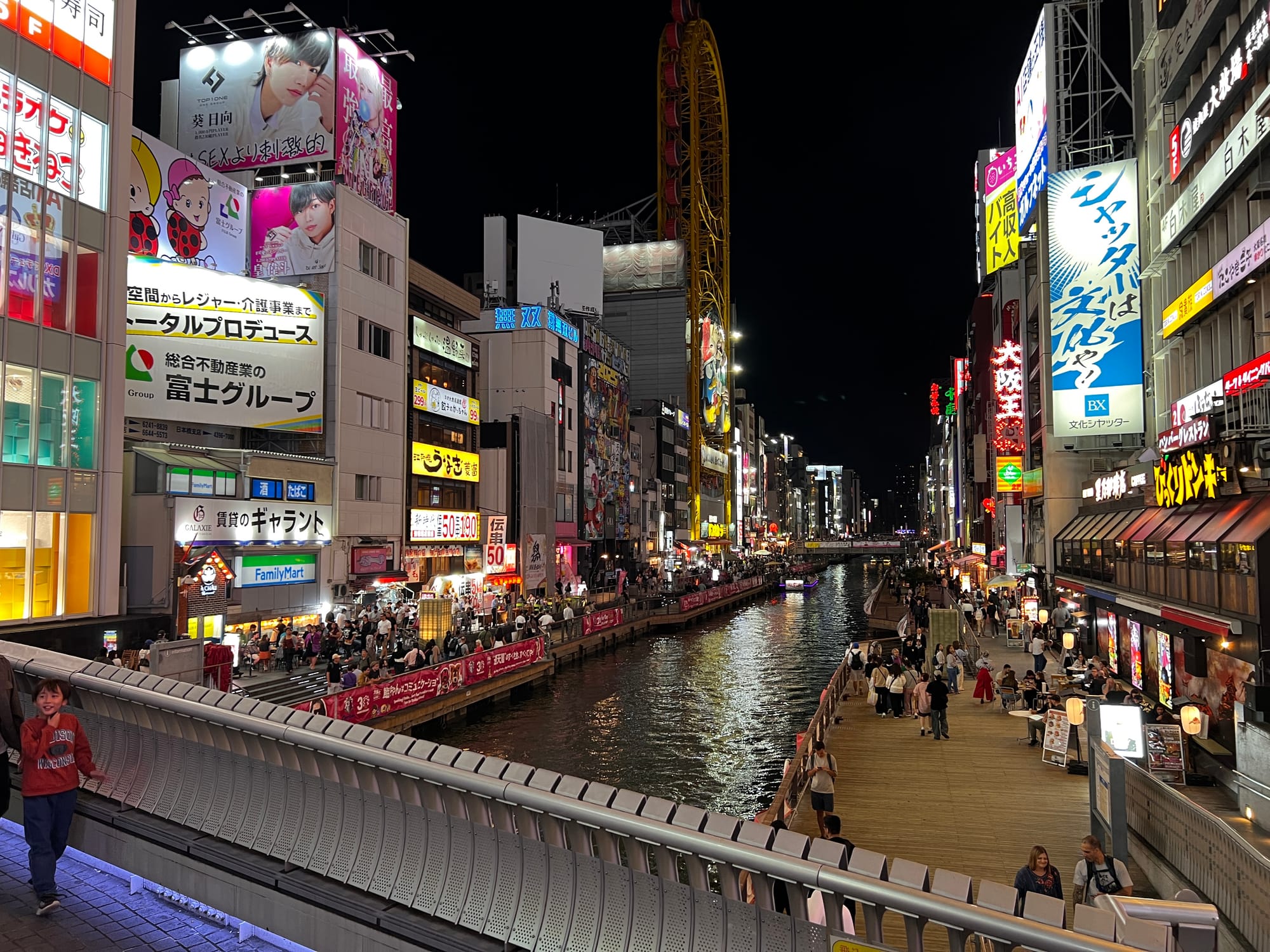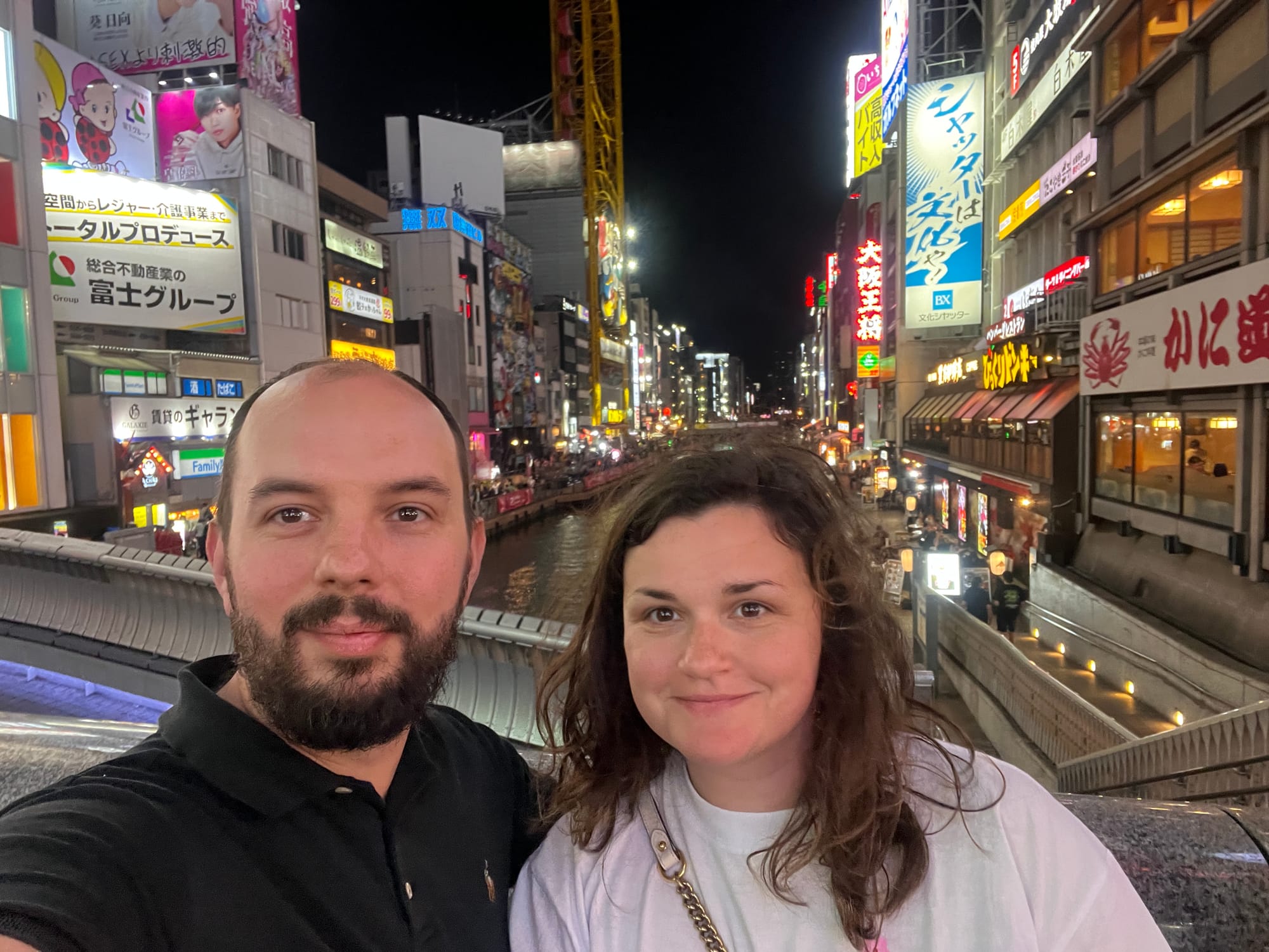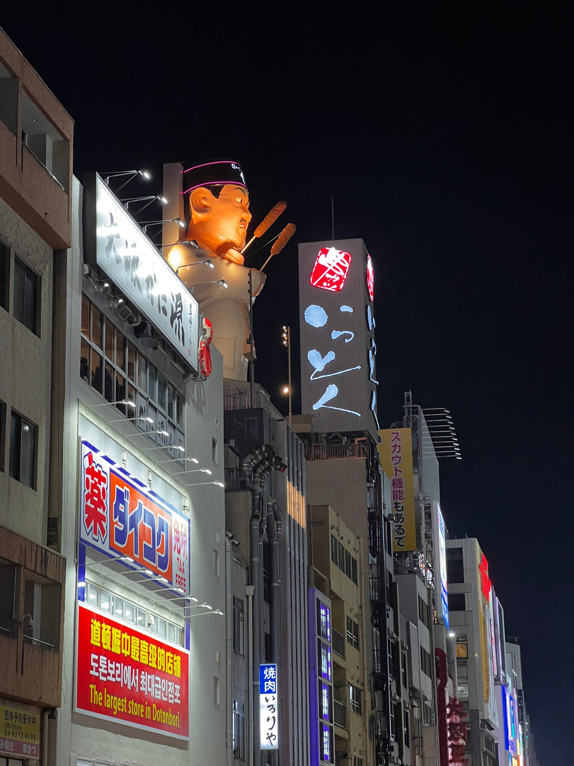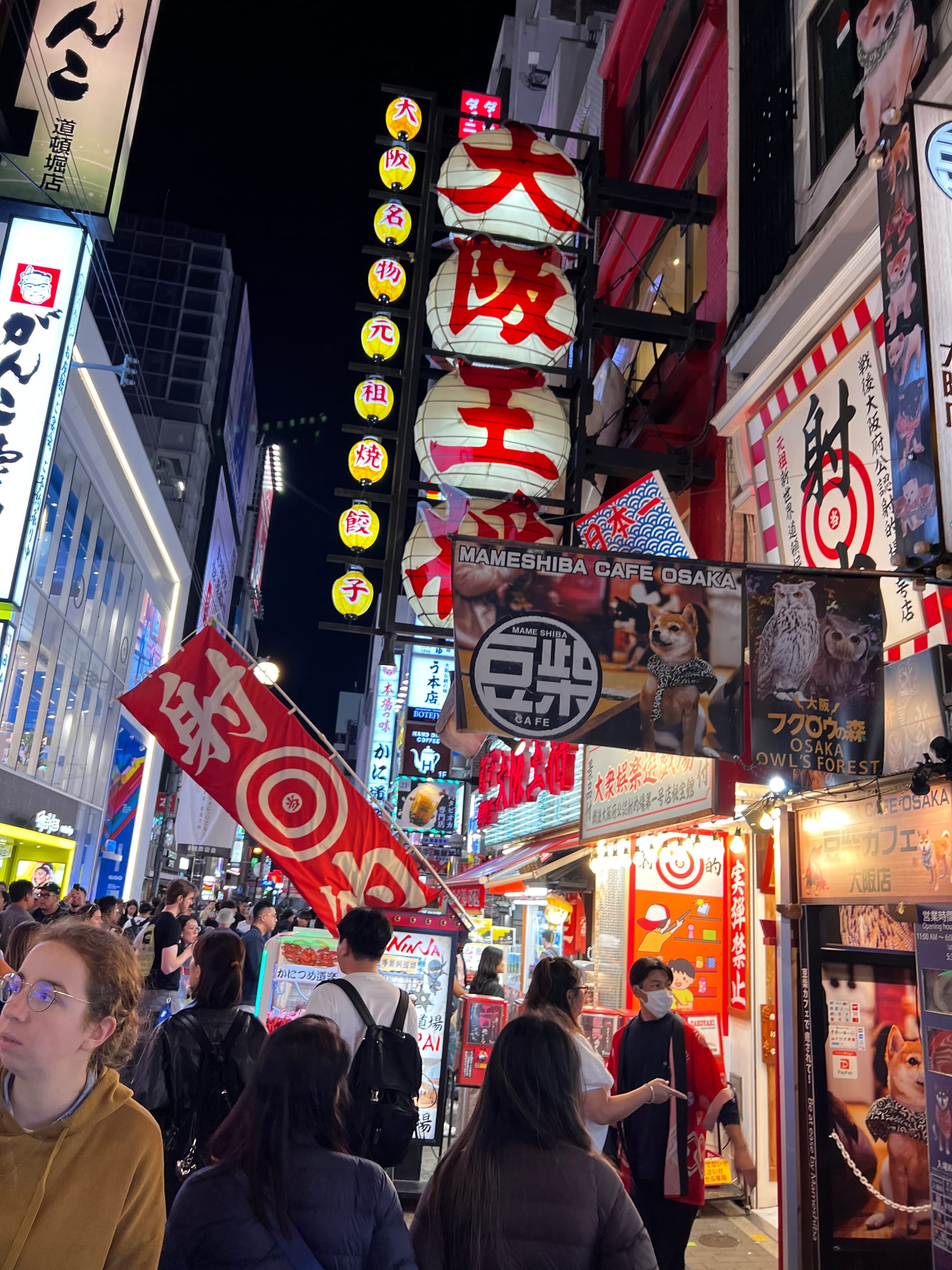 Po wizycie w Akwarium, udaliśmy się do hotelu, a następnie wyruszyliśmy do Dontobori. Jest to obszar Osaki, który słynie z neonów, sklepów, klubów i restauracji serwujących miejscowe przysmaki. Miejsce to jest kiczowate, jednak ma swój niepowtarzalny klimat, a dodatkowego uroku dodaje mu usytuowanie nad rzeczką o takiej samej nazwie.