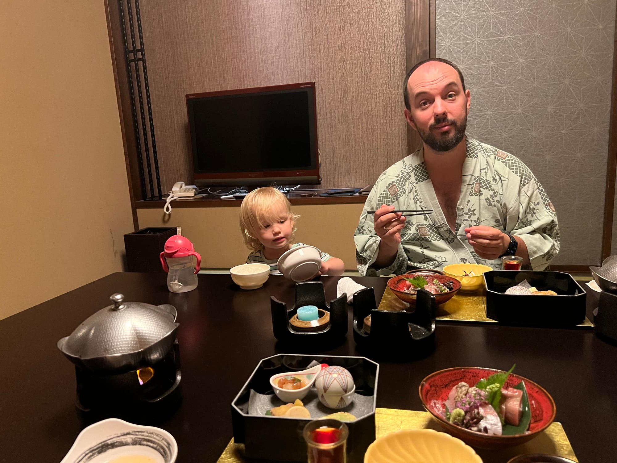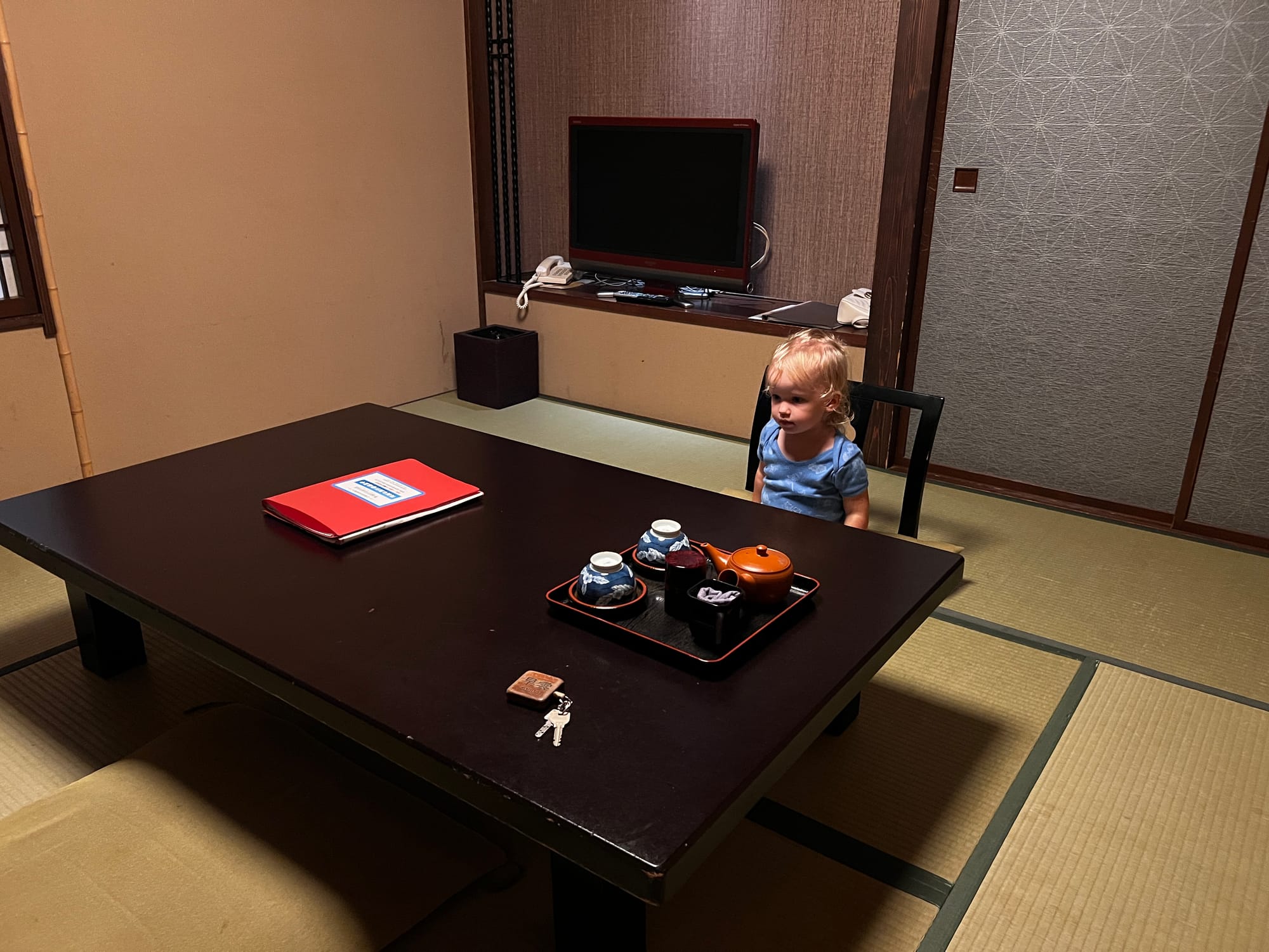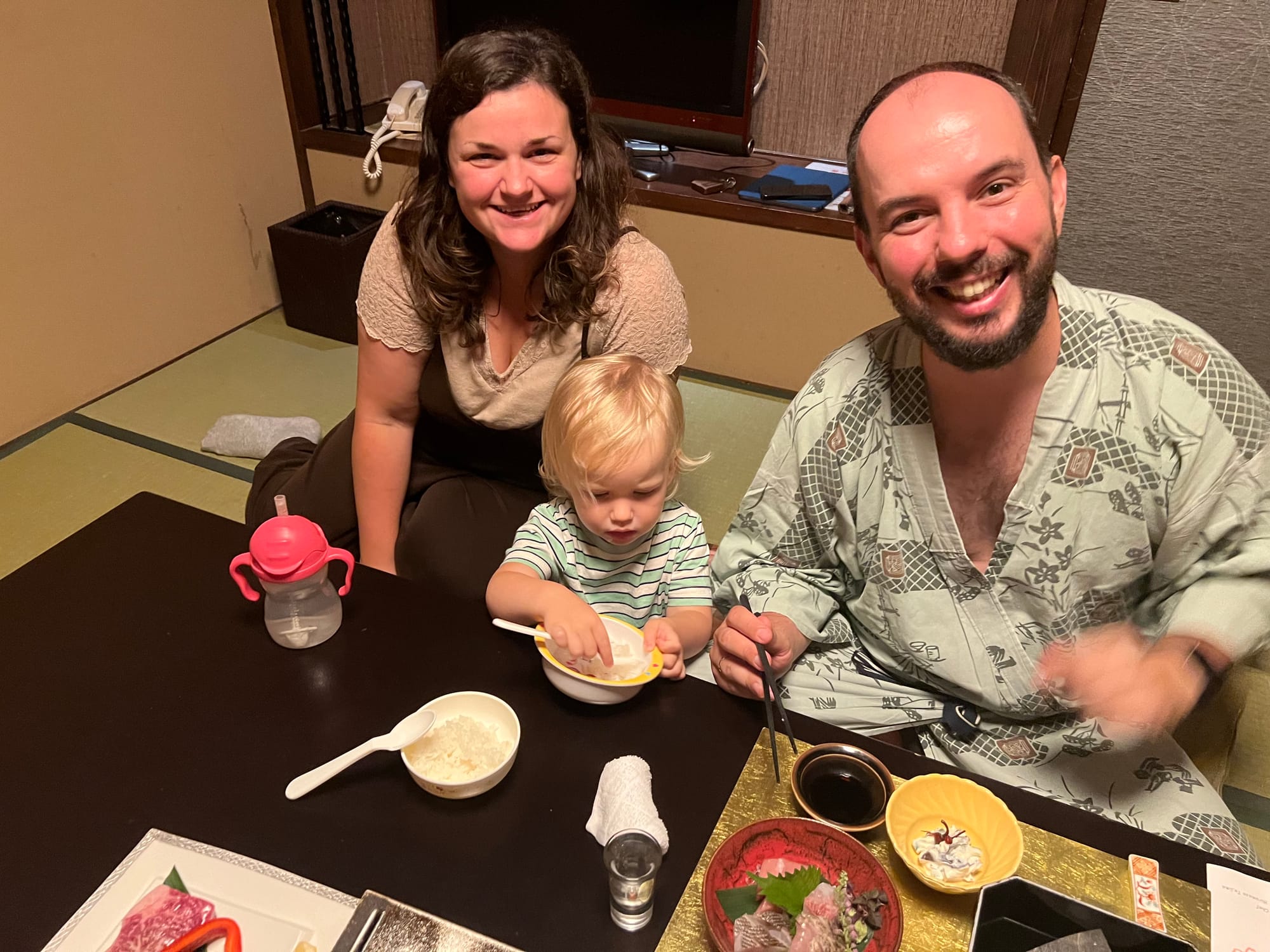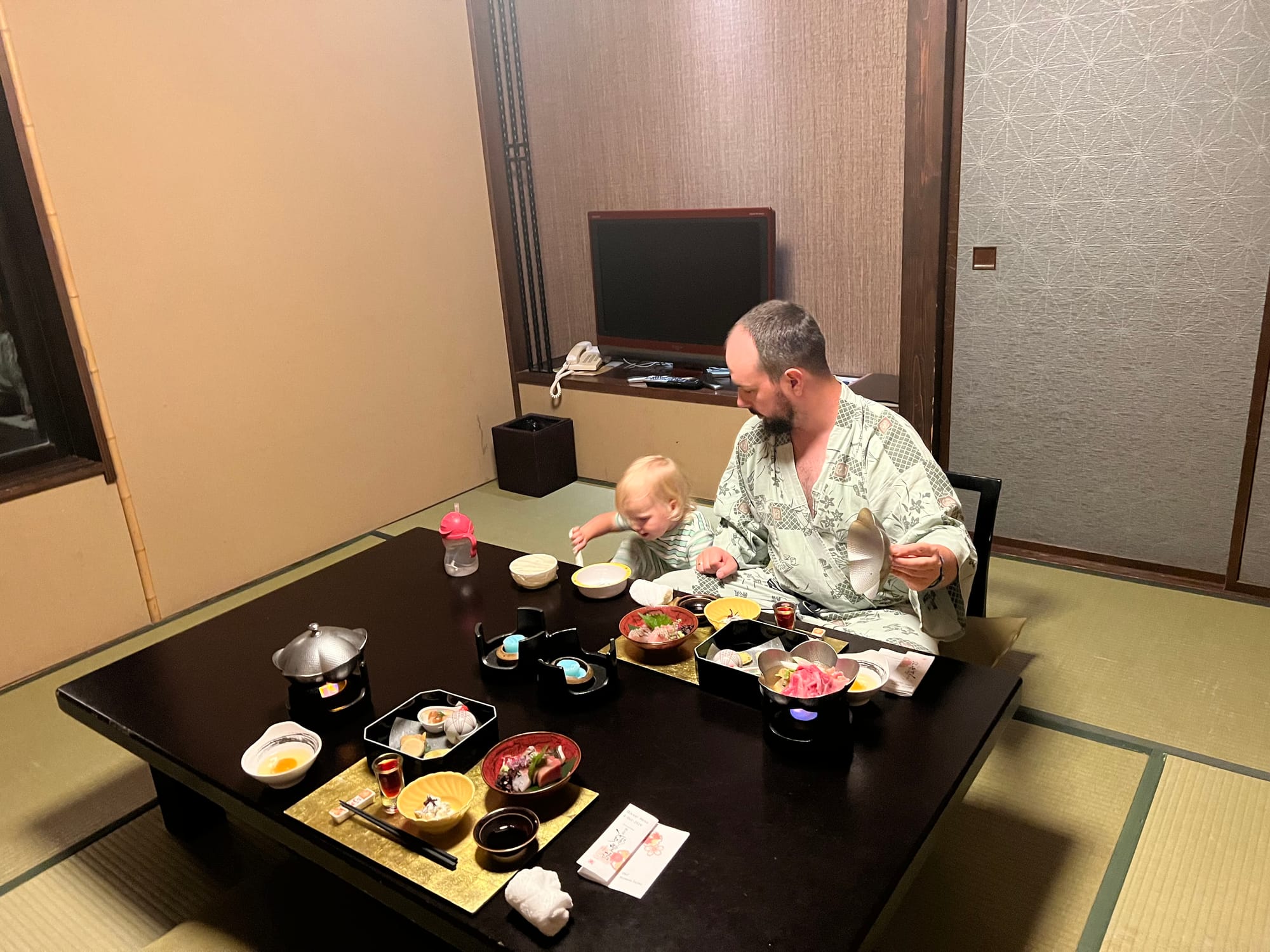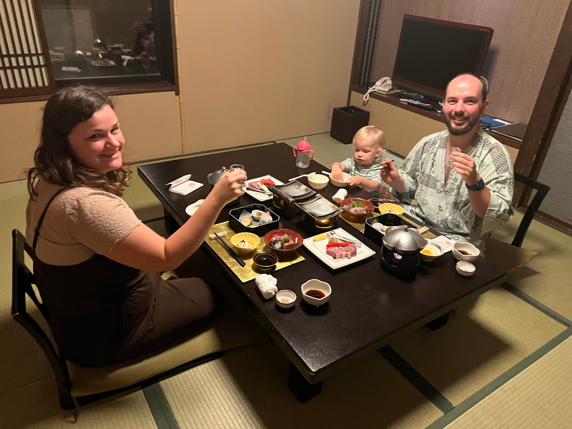Z naszego prywatnego onsenu skorzystaliśmy dotychczas jedynie odrobinę, bo Tosia, która poczuła zew wolności (nie mamy tutaj dla niej łóżeczka, wszyscy śpimy razem na futonach na podłodze), nie chciała się zdrzemnąć, tylko biegała po całym apartamencie. Mamy też obawy przed jej kąpielą w onsenie, gdyż woda jest naprawdę gorąca, a ona nie przywykła do takich gorących kąpieli. Czekamy więc, aż w końcu zaśnie 😉.