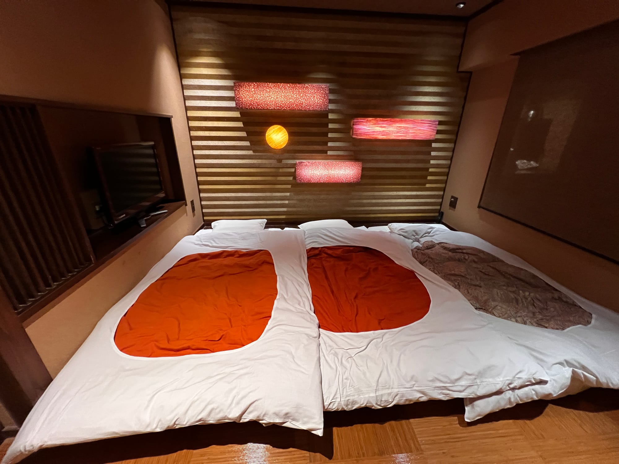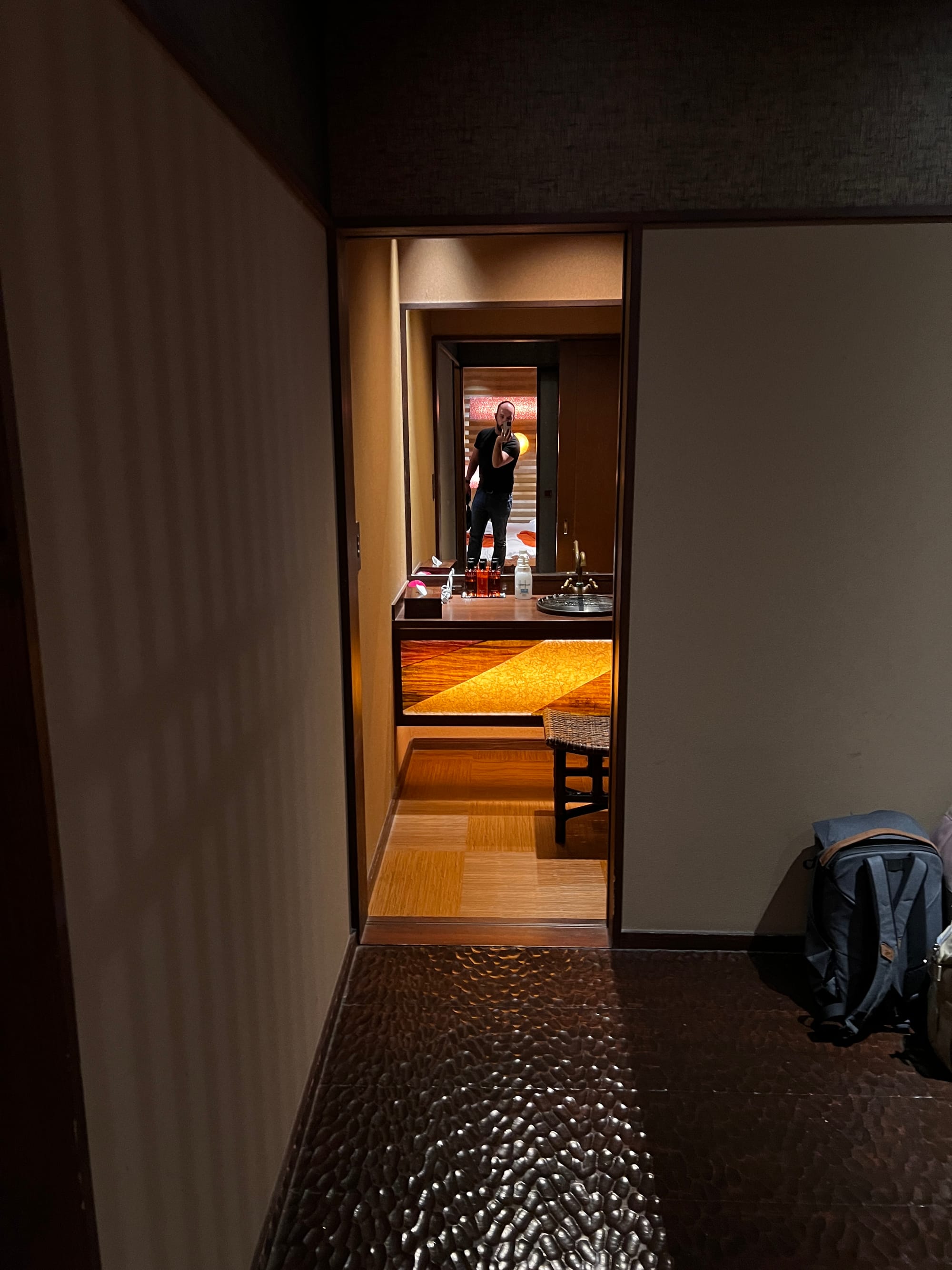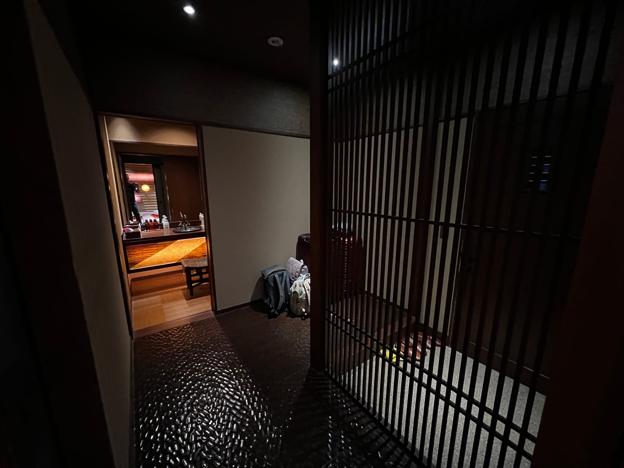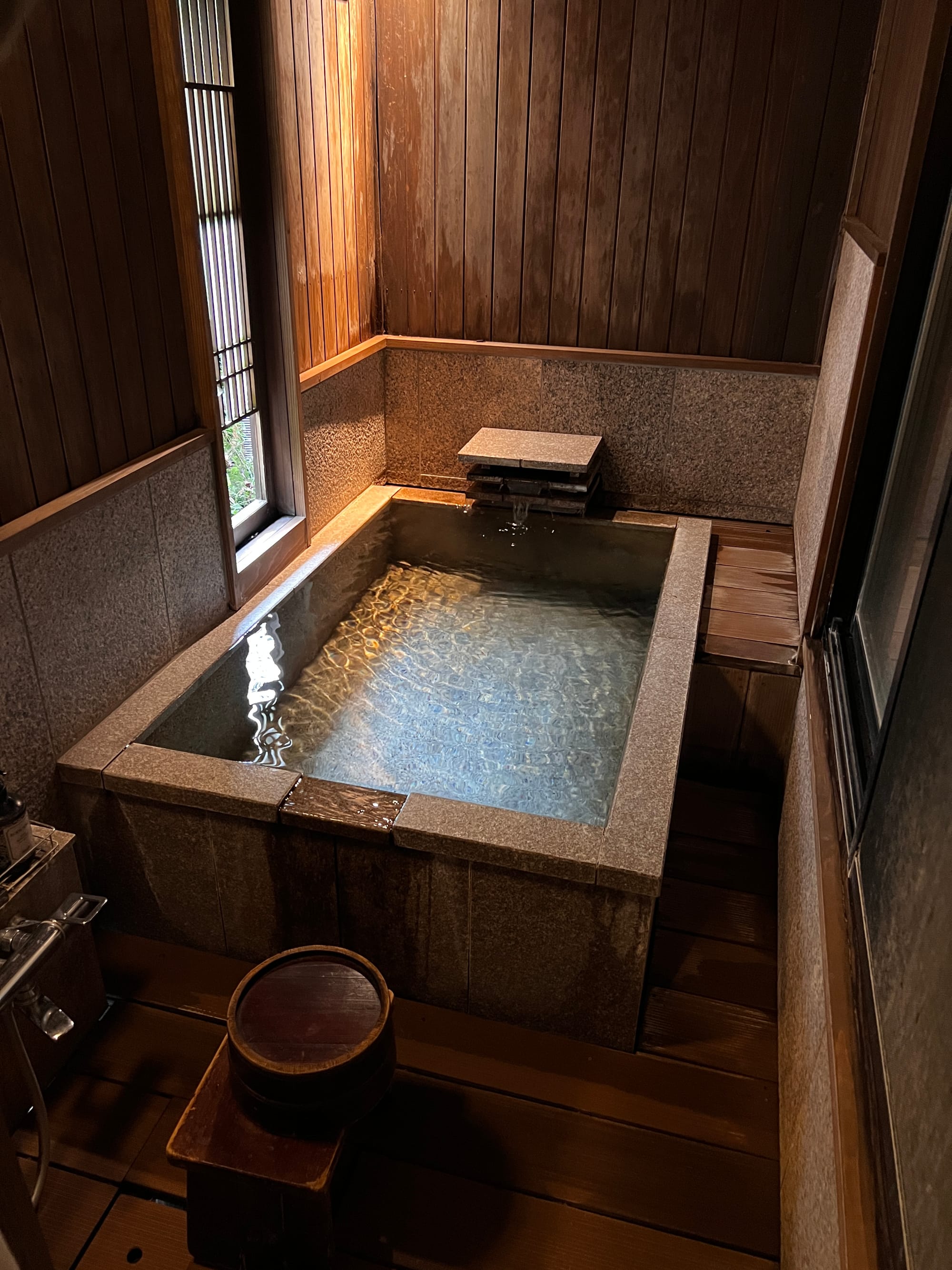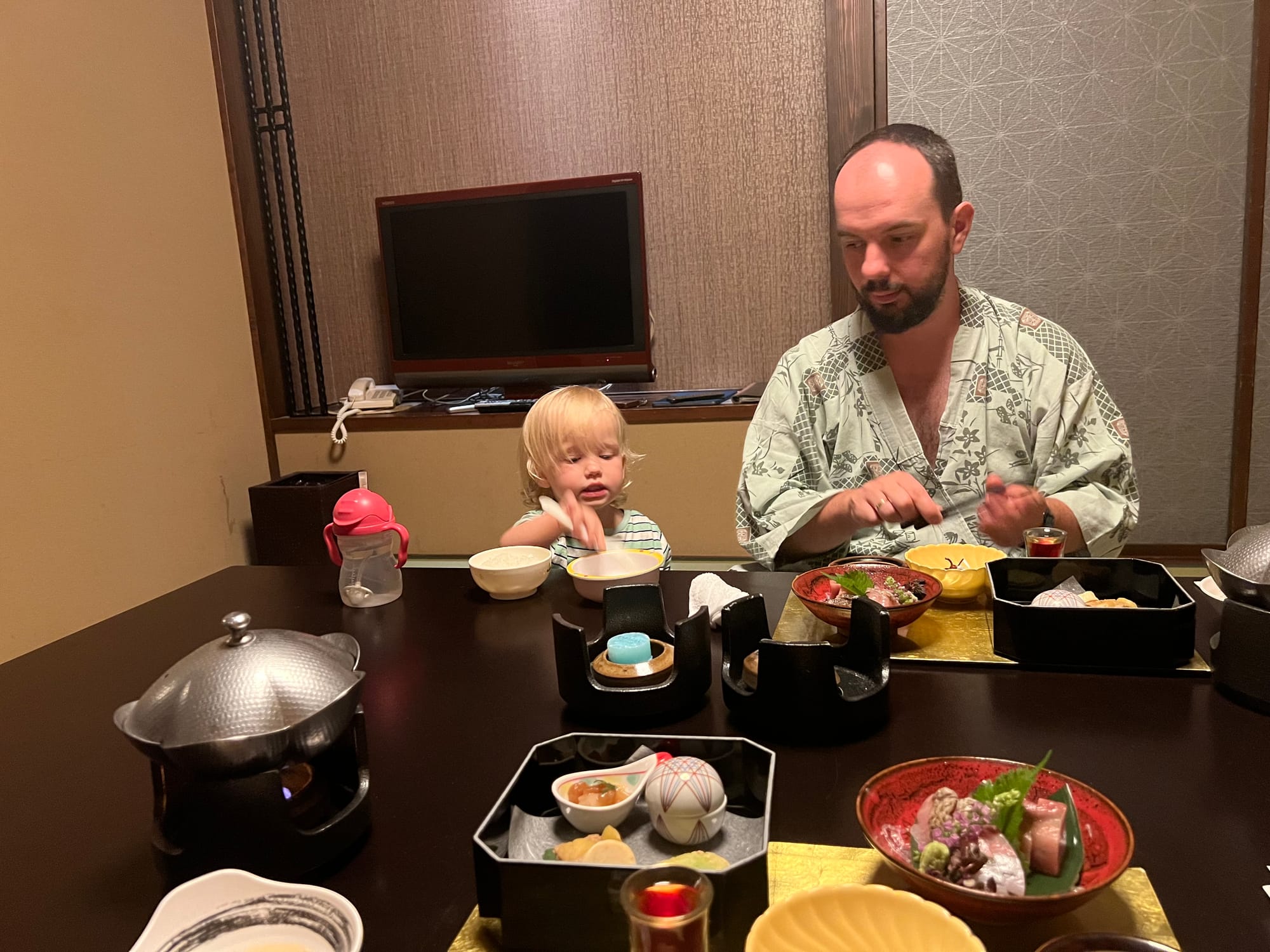 Z naszego prywatnego onsenu skorzystaliśmy dotychczas jedynie odrobinę, bo Tosia, która poczuła zew wolności (nie mamy tutaj dla niej łóżeczka, wszyscy śpimy razem na futonach na podłodze), nie chciała się zdrzemnąć, tylko biegała po całym apartamencie. Mamy też obawy przed jej kąpielą w onsenie, gdyż woda jest naprawdę gorąca, a ona nie przywykła do takich gorących kąpieli. Czekamy więc, aż w końcu zaśnie 😉.