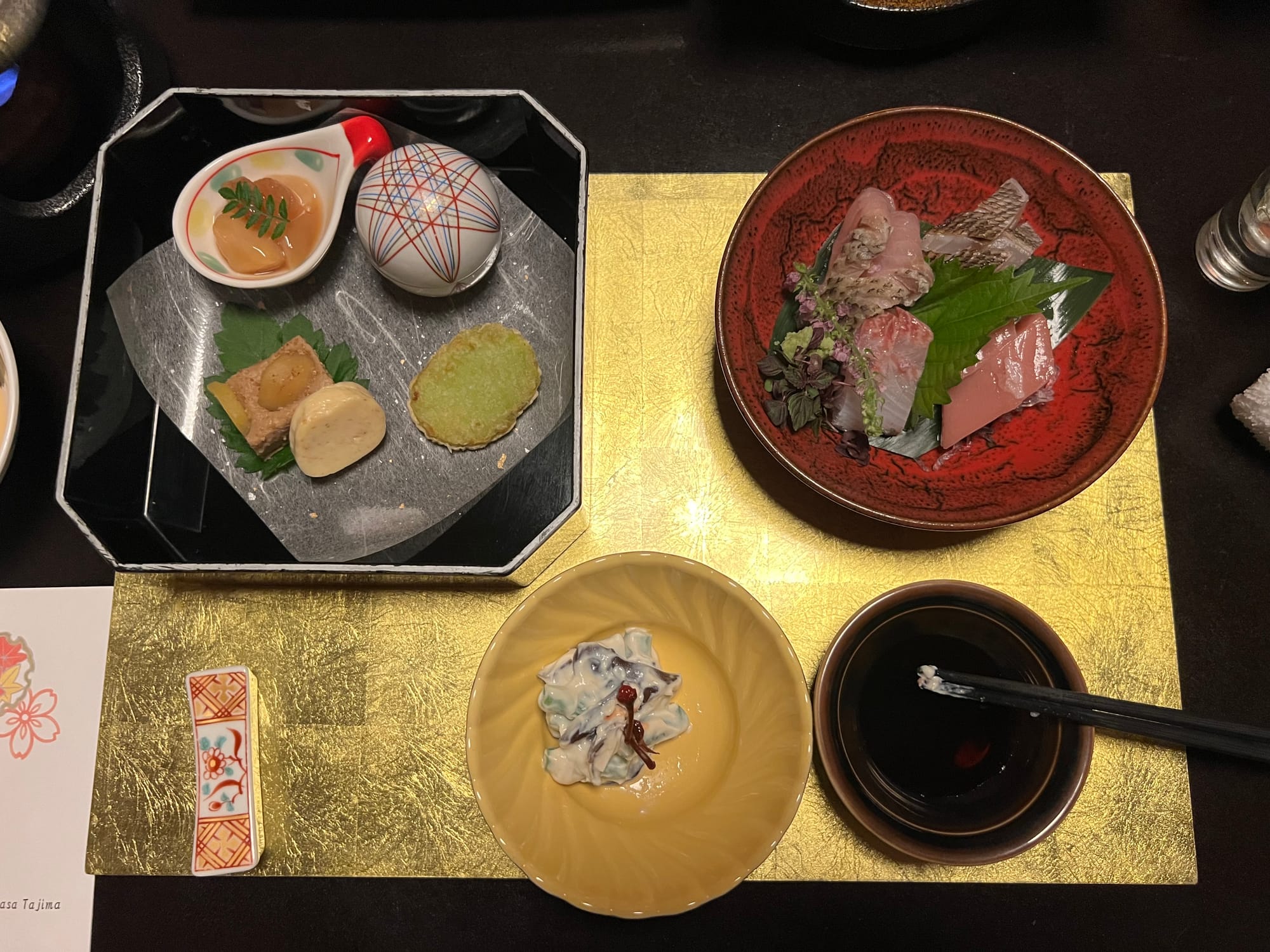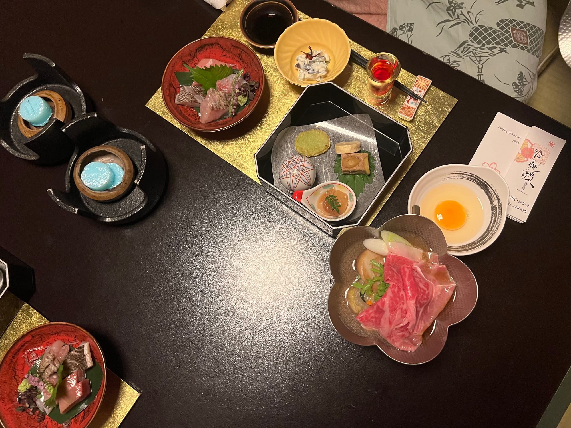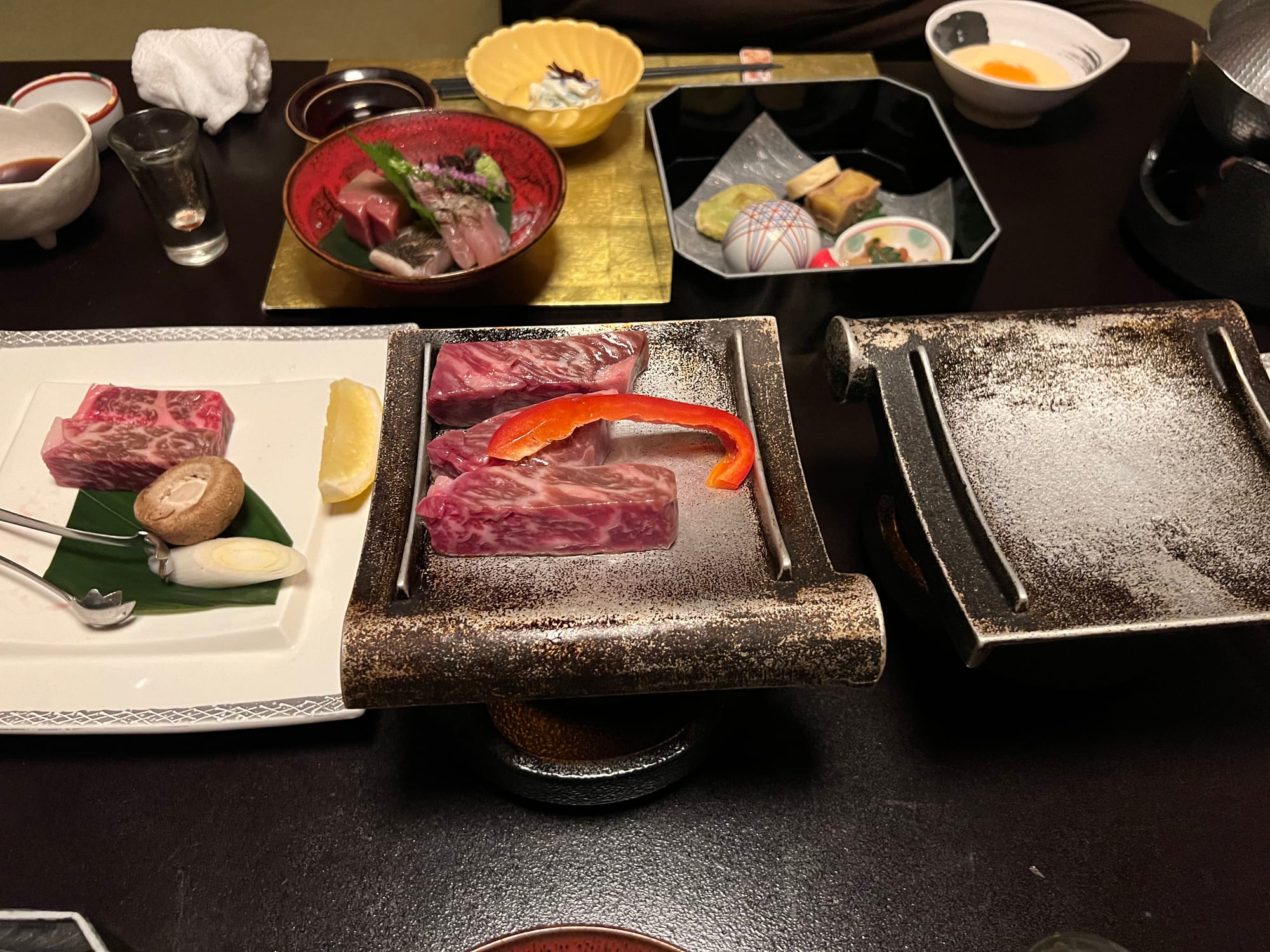 Przy wejściu do ryokanu musieliśmy zdjąć buty i zostawić je w korytarzu, następnie w celu przejścia do naszego apartamentu dostaliśmy kapcie, które należało zdjąć w korytarzu naszej prywatnej części, po której chodzi się boso, a jedynie w toalecie stoją uniwersalne kapcie, które zakłada się, kiedy się z niej korzysta. Otrzymaliśmy również yukaty, będące lekkim strojem kąpielowym lub domowym, przydatnym szczególnie podczas korzystania z onsenów. Adrian przyodział ją już do kolacji. A jeśli o kolacji mowa, to trzeba przyznać, że była ona obfita. Dostaliśmy właściwie większość tradycyjnych japońskich dań podczas jednego posiłku. Były i owoce morza, i surowe ryby, grillowany łosoś, trzy rodzaje zup, w tym zupa miso, surowa wołowina z warzywami, którą mogliśmy według uznania przygotować na rozgrzanym kamieniu, selekcja przekąsek i ciasto na deser. Pomijając fakt, że przy mojej niechęci do owoców morza, nie mialam ochoty próbować wszystkich dań, to i tak było tego wszystkiego najzwyczajniej zbyt wiele jak dla nas. Cala kolacja została dostarczona i pięknie podana w części dziennej naszego apartamentu. Początkowo, gdy przemiła starsza Japonka przyniosła nam pierwsze dania, myśleliśmy, że to wszystko i spokojnie byśmy się tym najedli, jednak pani co jakiś czas przynosiła kolejne potrawy, którym już nie robiliśmy zdjęć.