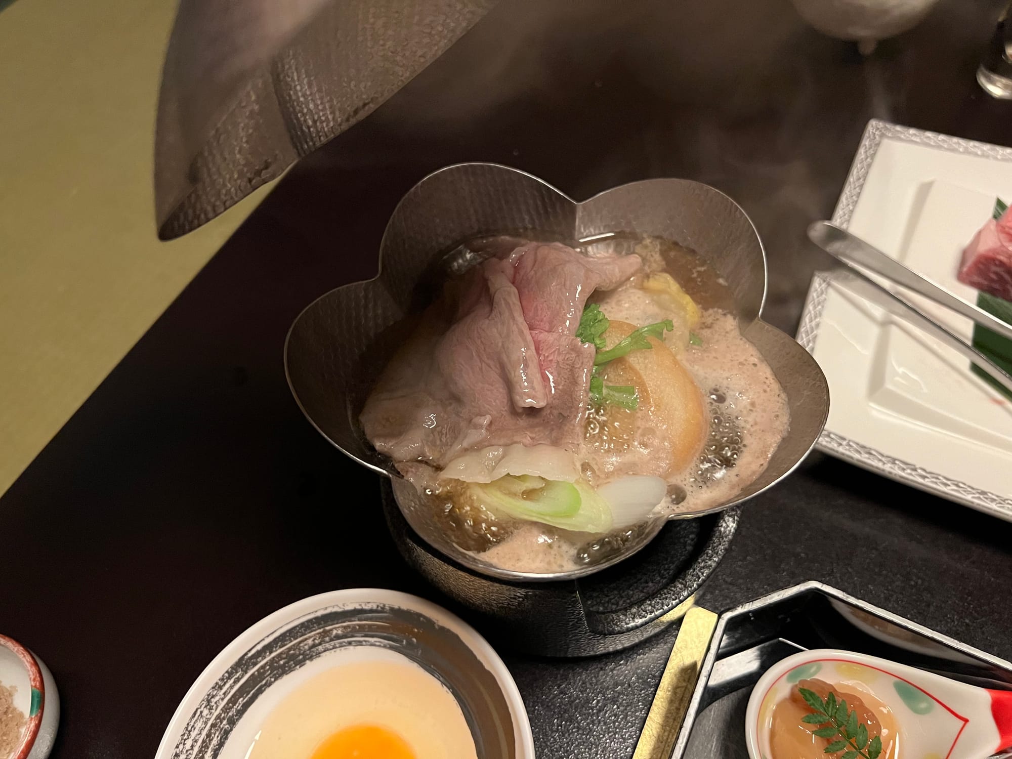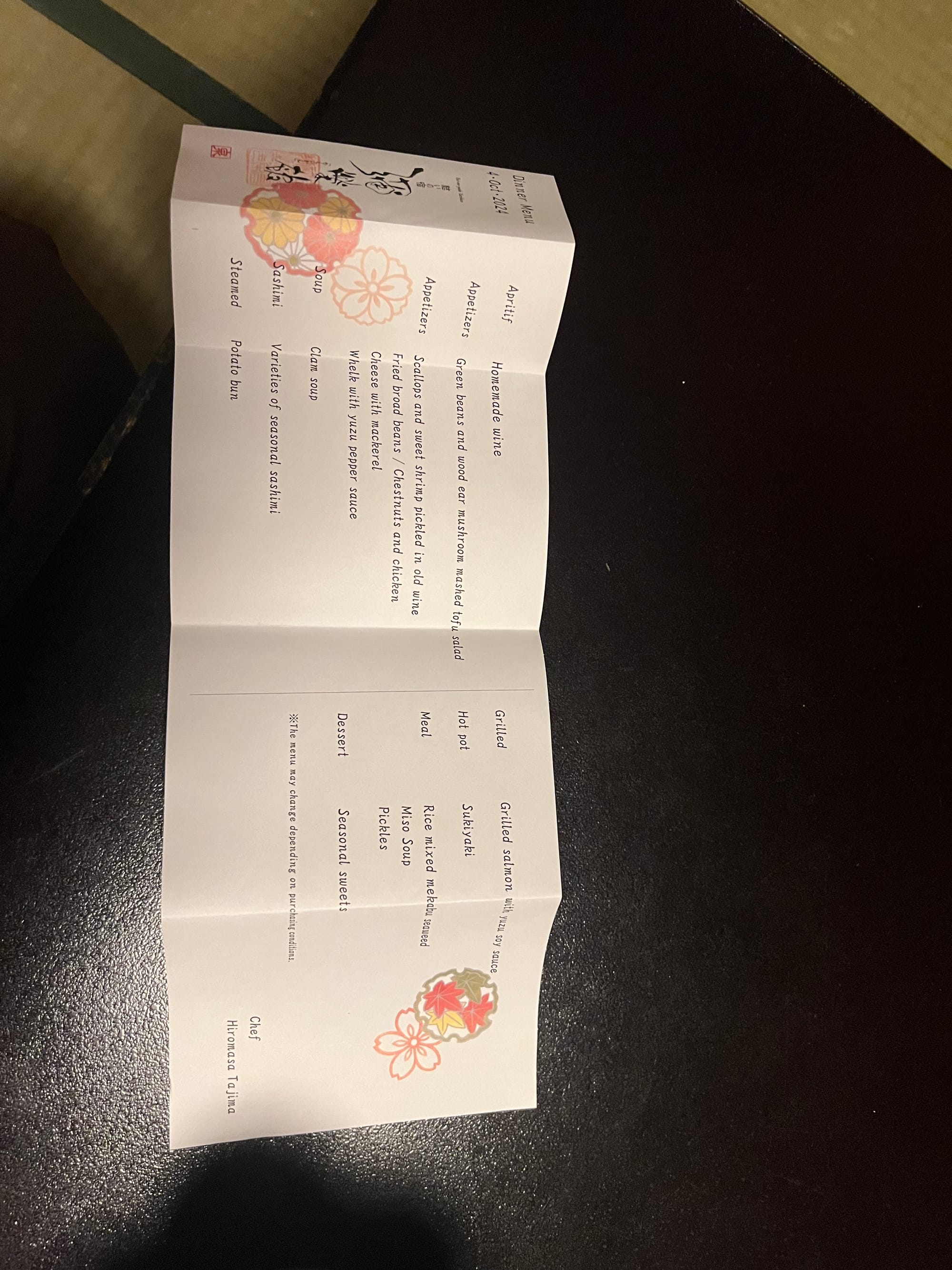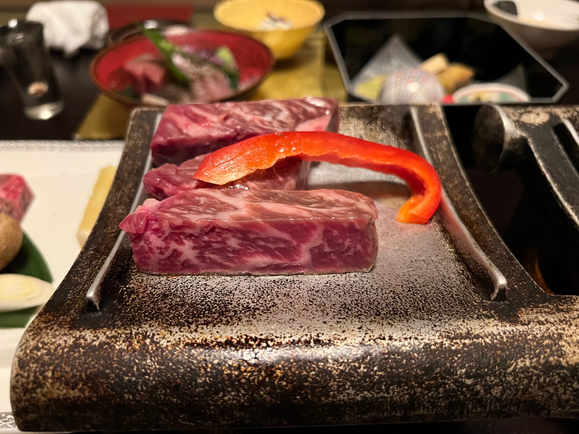 Przy wejściu do ryokanu musieliśmy zdjąć buty i zostawić je w korytarzu, następnie w celu przejścia do naszego apartamentu dostaliśmy kapcie, które należało zdjąć w korytarzu naszej prywatnej części, po której chodzi się boso, a jedynie w toalecie stoją uniwersalne kapcie, które zakłada się, kiedy się z niej korzysta. Otrzymaliśmy również yukaty, będące lekkim strojem kąpielowym lub domowym, przydatnym szczególnie podczas korzystania z onsenów. Adrian przyodział ją już do kolacji. A jeśli o kolacji mowa, to trzeba przyznać, że była ona obfita. Dostaliśmy właściwie większość tradycyjnych japońskich dań podczas jednego posiłku. Były i owoce morza, i surowe ryby, grillowany łosoś, trzy rodzaje zup, w tym zupa miso, surowa wołowina z warzywami, którą mogliśmy według uznania przygotować na rozgrzanym kamieniu, selekcja przekąsek i ciasto na deser. Pomijając fakt, że przy mojej niechęci do owoców morza, nie mialam ochoty próbować wszystkich dań, to i tak było tego wszystkiego najzwyczajniej zbyt wiele jak dla nas. Cala kolacja została dostarczona i pięknie podana w części dziennej naszego apartamentu. Początkowo, gdy przemiła starsza Japonka przyniosła nam pierwsze dania, myśleliśmy, że to wszystko i spokojnie byśmy się tym najedli, jednak pani co jakiś czas przynosiła kolejne potrawy, którym już nie robiliśmy zdjęć.