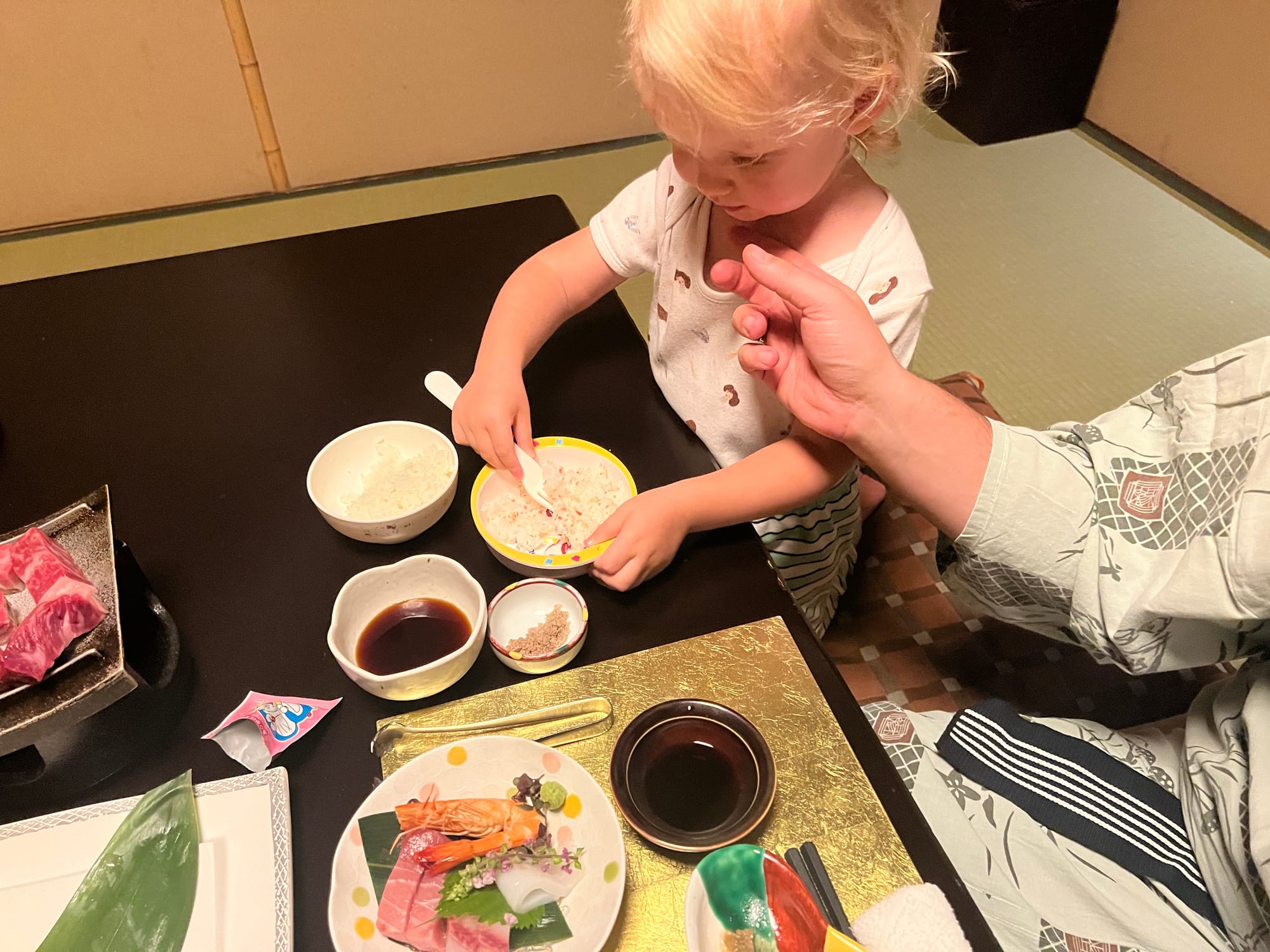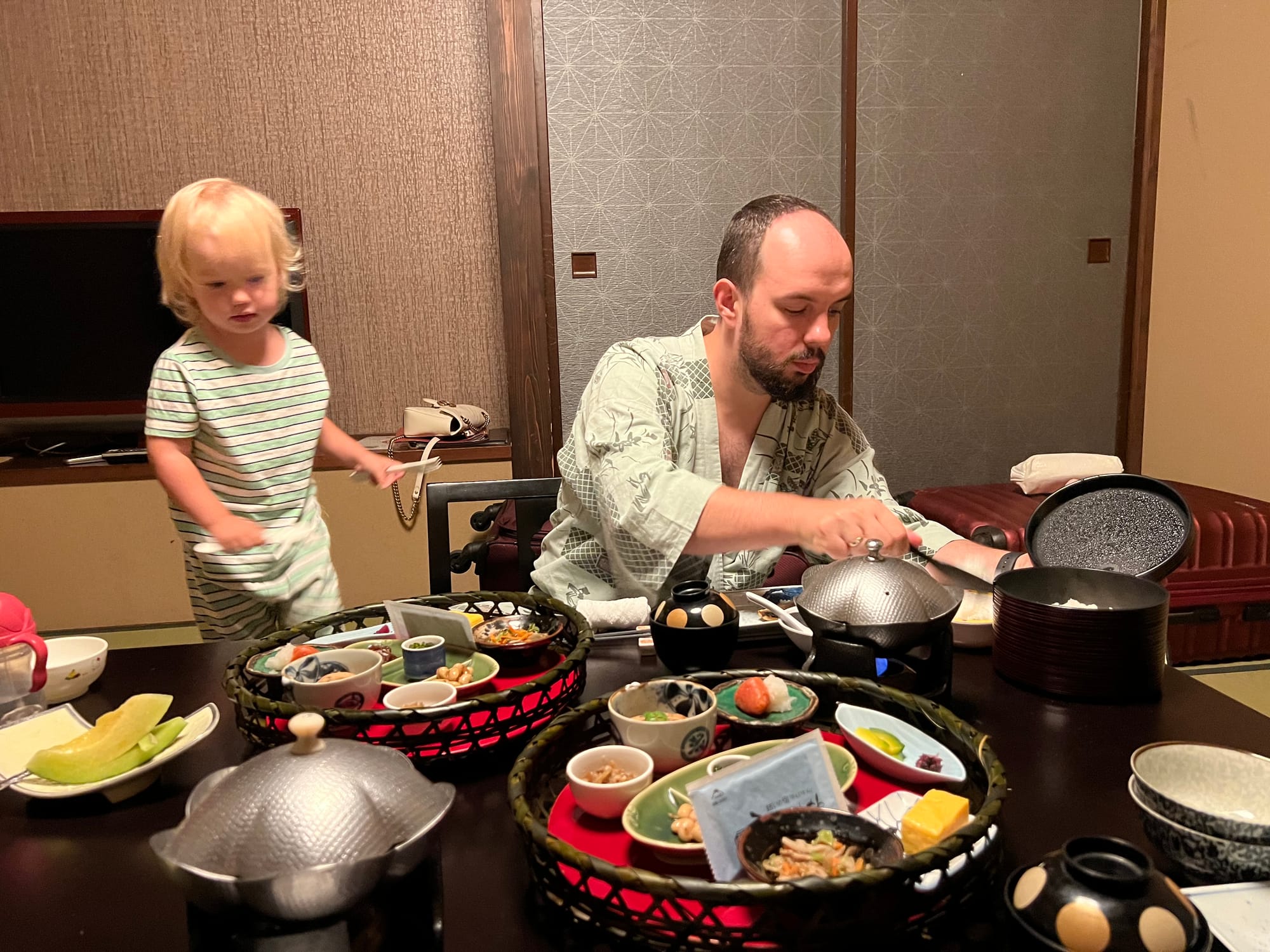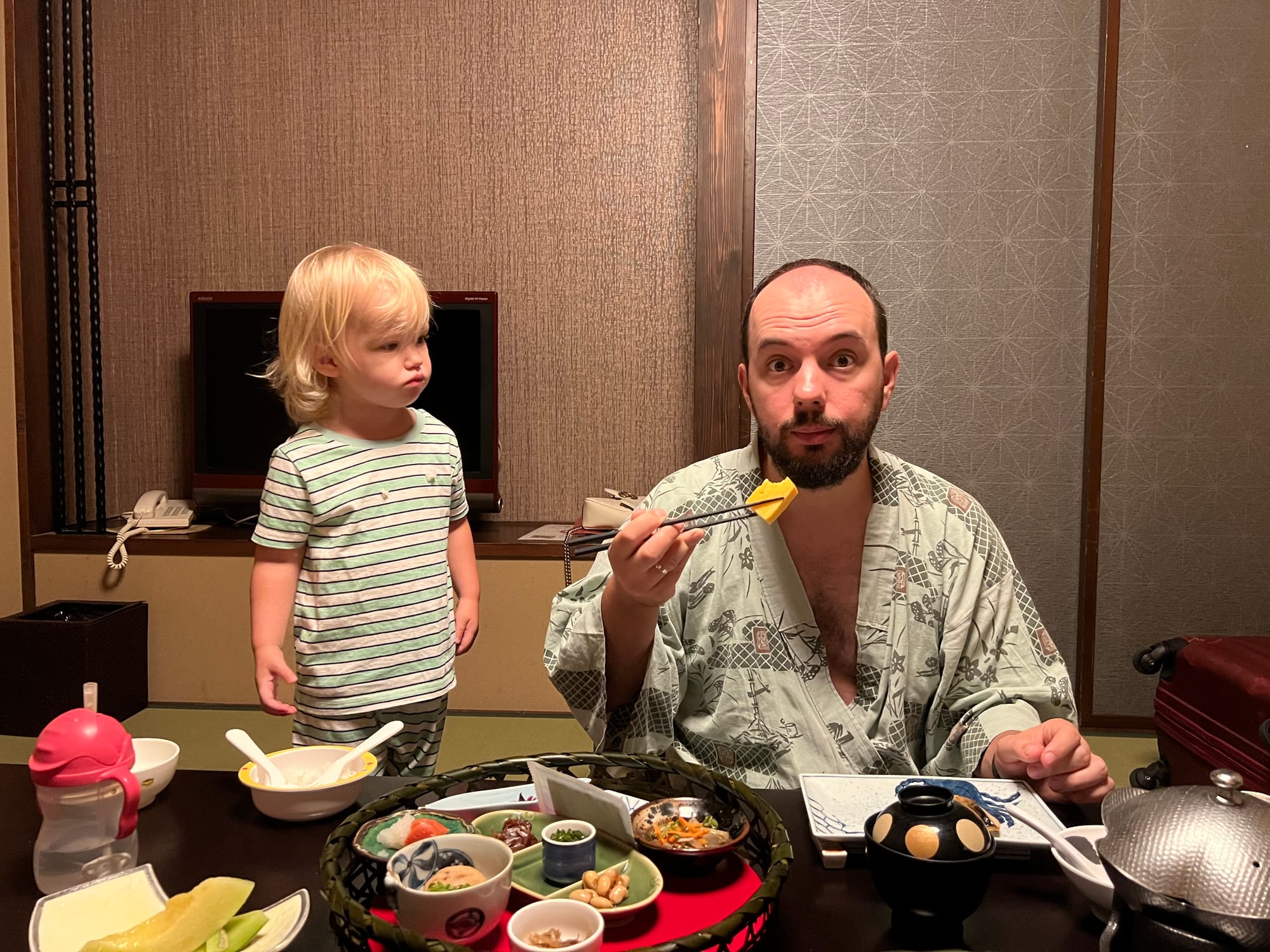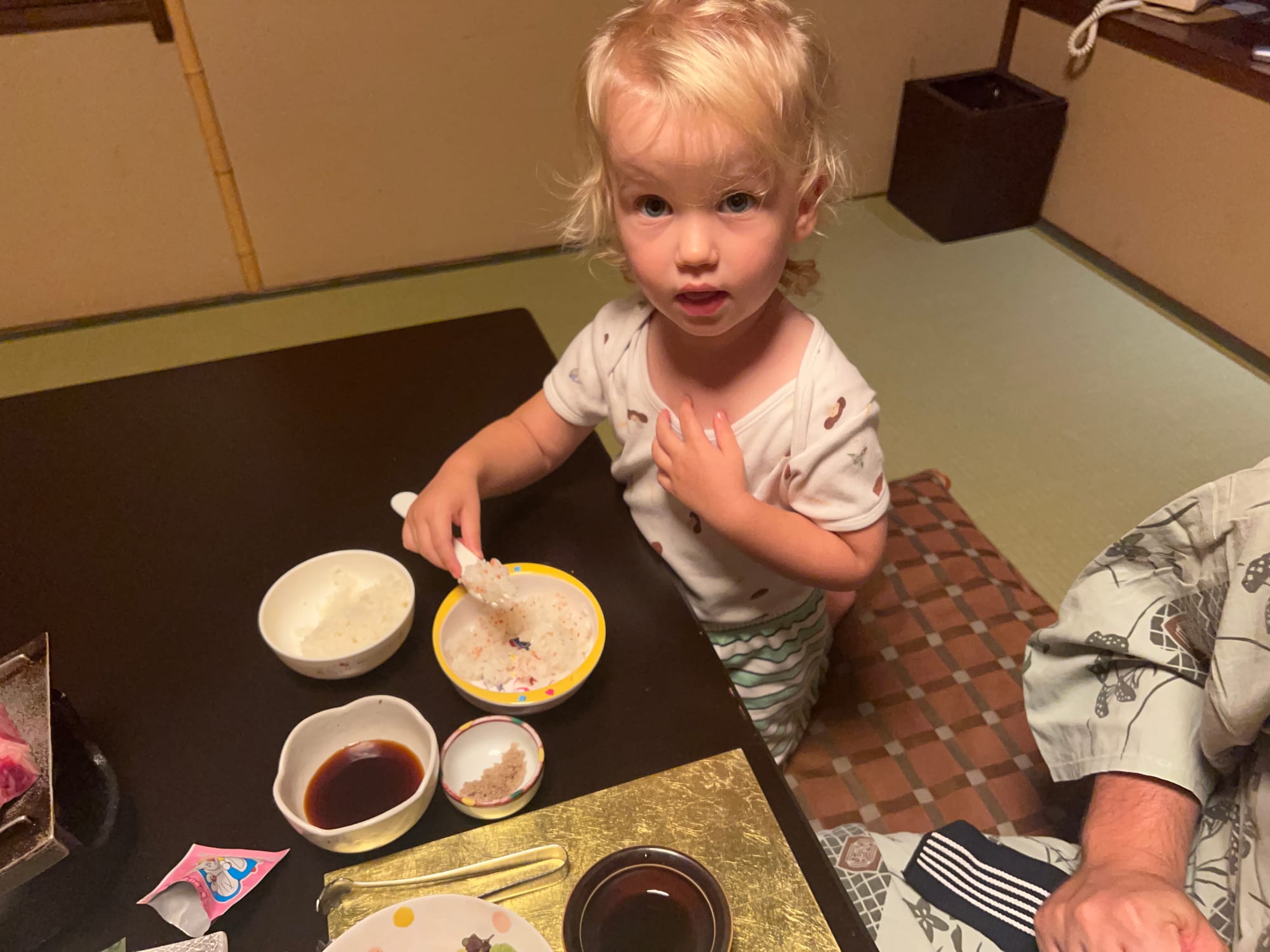 Nie mogliśmy dzisiaj poleniuchować, gdyż w ryokanie panują dosyć restrykcyjnie zasady co do godzin spożywania posiłków. Zamówiliśmy śniadanie najpóźniej jak było to możliwe, czyli na 8… Śniadanie, podobnie jak wczorajszą kolację, podano nam w naszym pokoju, więc przemila, starsza pani już od około 7:30 krzątała się w okolicy. Śniadanie było smaczne i pożywne, jednak nie potrafilibyśmy nazwać wszystkich jego elementów. Z całym przekonaniem możemy powiedzieć, że jednym z nich był biały ryż bez żadnych dodatków, którym Tosia się delektuje od początku wyjazdu. Była też między innymi wędzona rybka czy kawałek melona, którego ku naszej uciesze Tosia zgodziła się również sprobować.