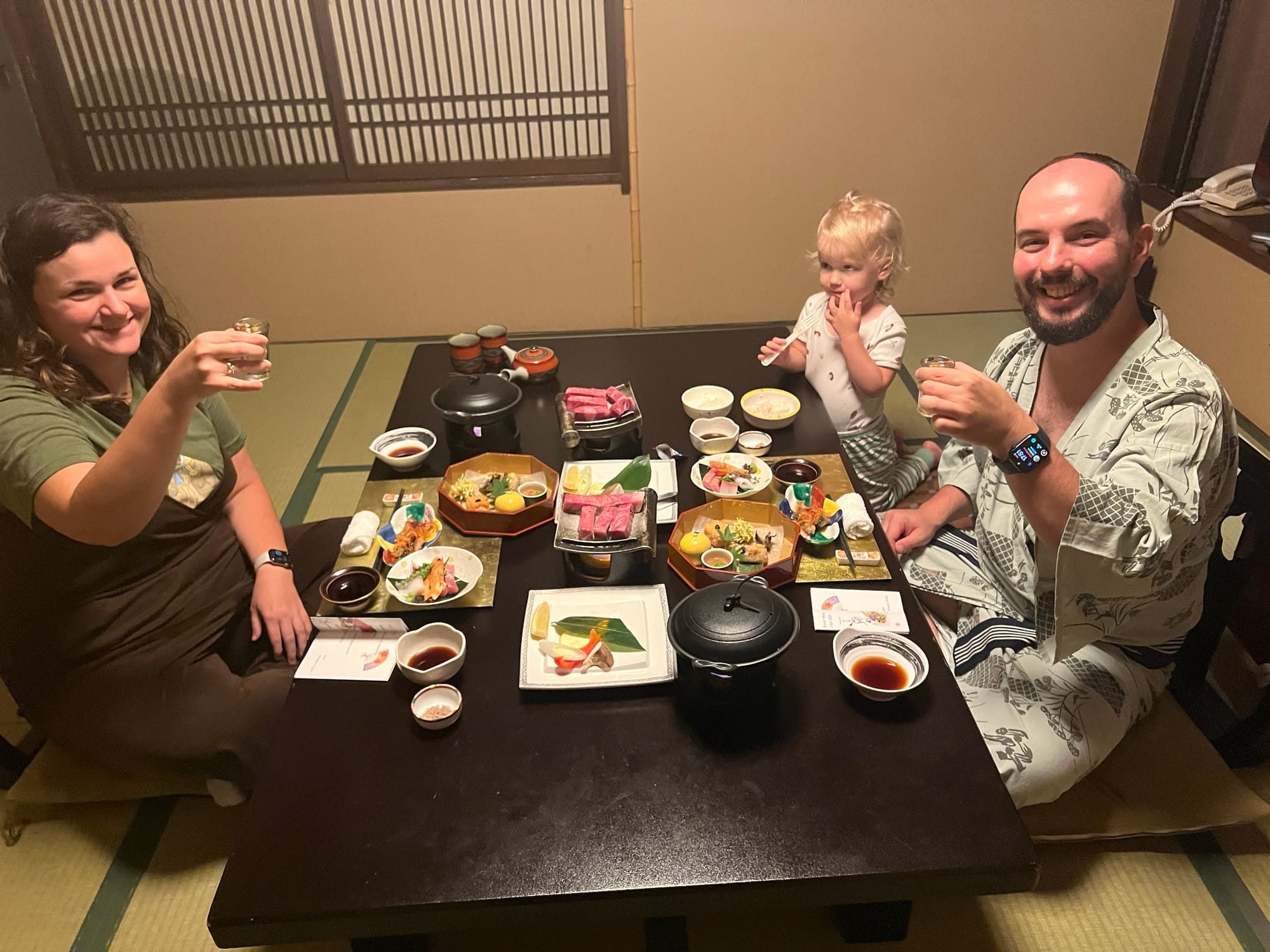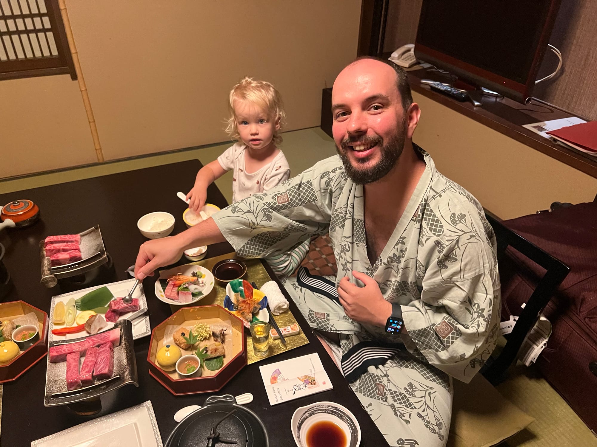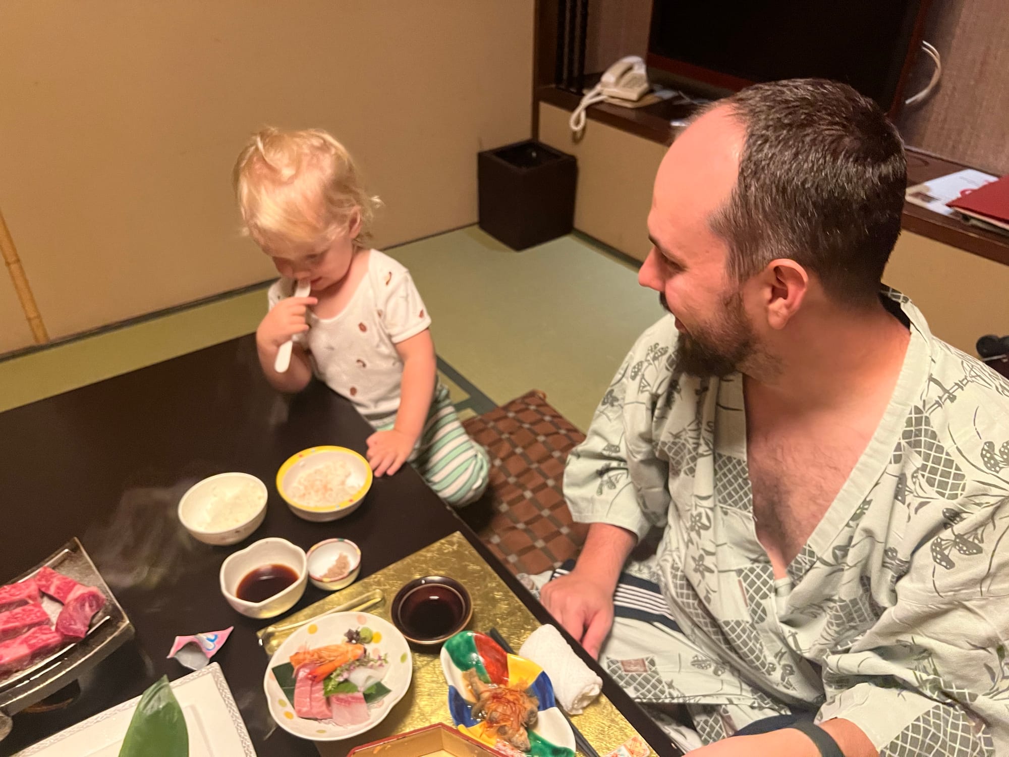 Nie mogliśmy dzisiaj poleniuchować, gdyż w ryokanie panują dosyć restrykcyjnie zasady co do godzin spożywania posiłków. Zamówiliśmy śniadanie najpóźniej jak było to możliwe, czyli na 8… Śniadanie, podobnie jak wczorajszą kolację, podano nam w naszym pokoju, więc przemila, starsza pani już od około 7:30 krzątała się w okolicy. Śniadanie było smaczne i pożywne, jednak nie potrafilibyśmy nazwać wszystkich jego elementów. Z całym przekonaniem możemy powiedzieć, że jednym z nich był biały ryż bez żadnych dodatków, którym Tosia się delektuje od początku wyjazdu. Była też między innymi wędzona rybka czy kawałek melona, którego ku naszej uciesze Tosia zgodziła się również sprobować.
