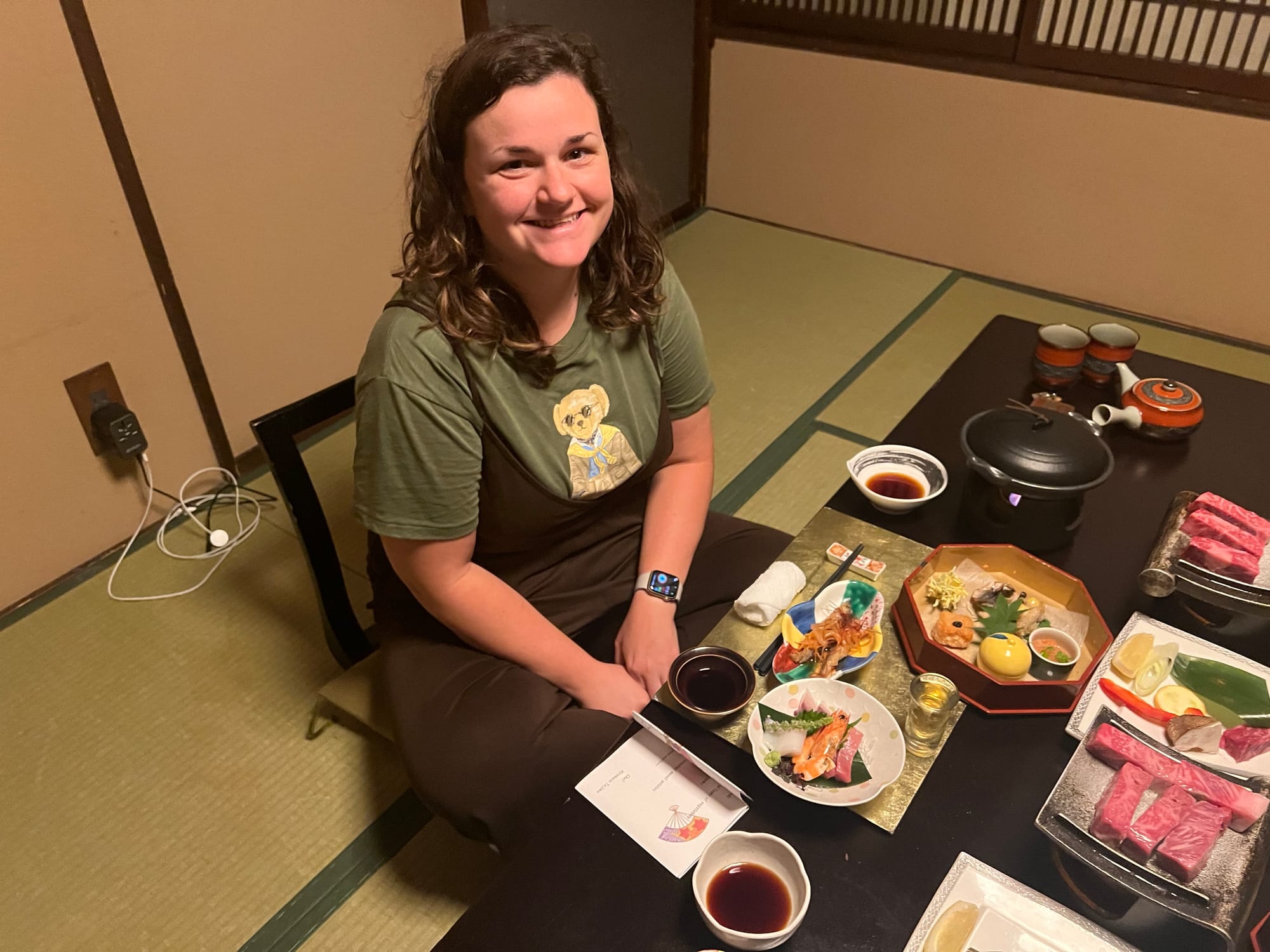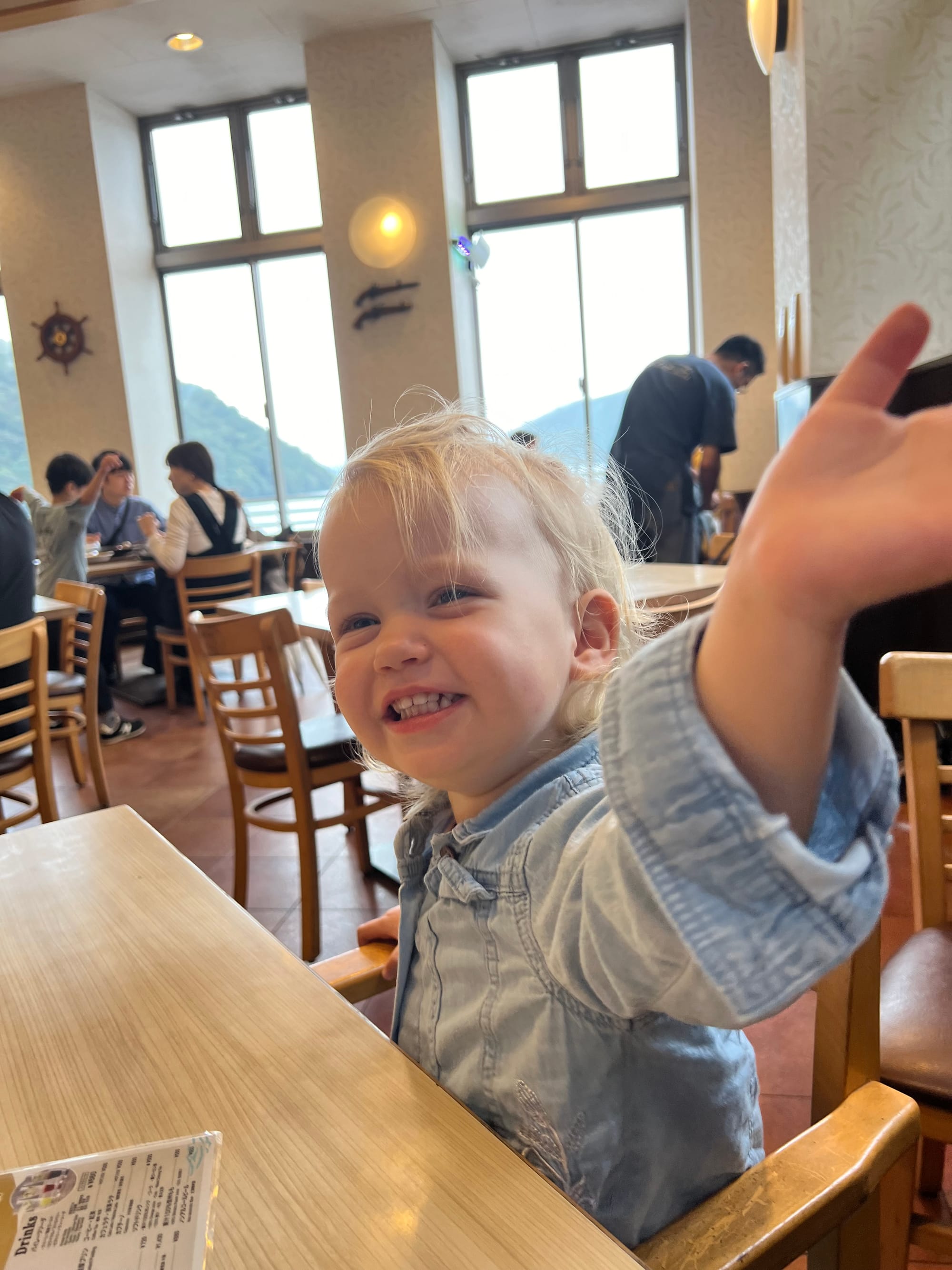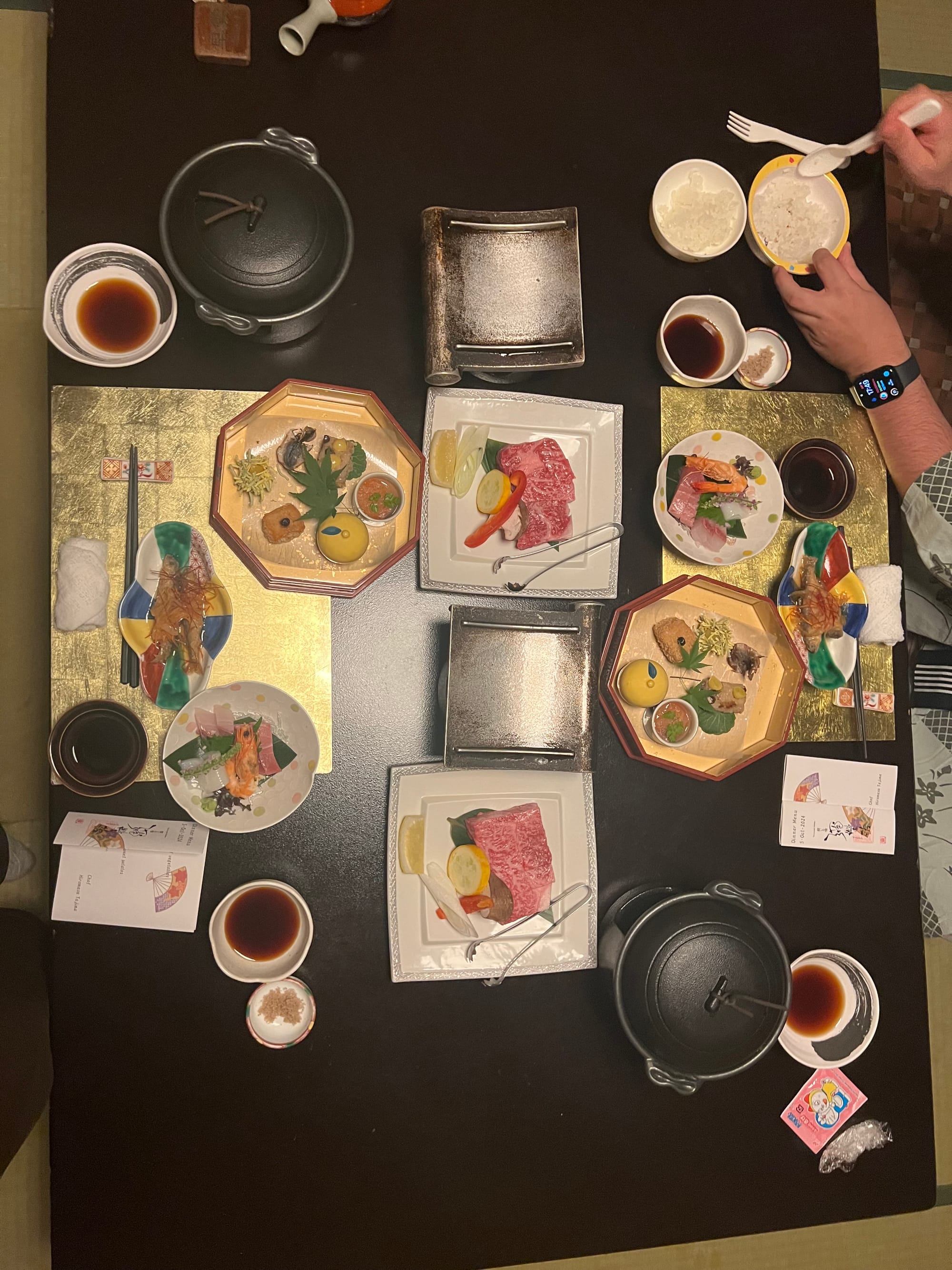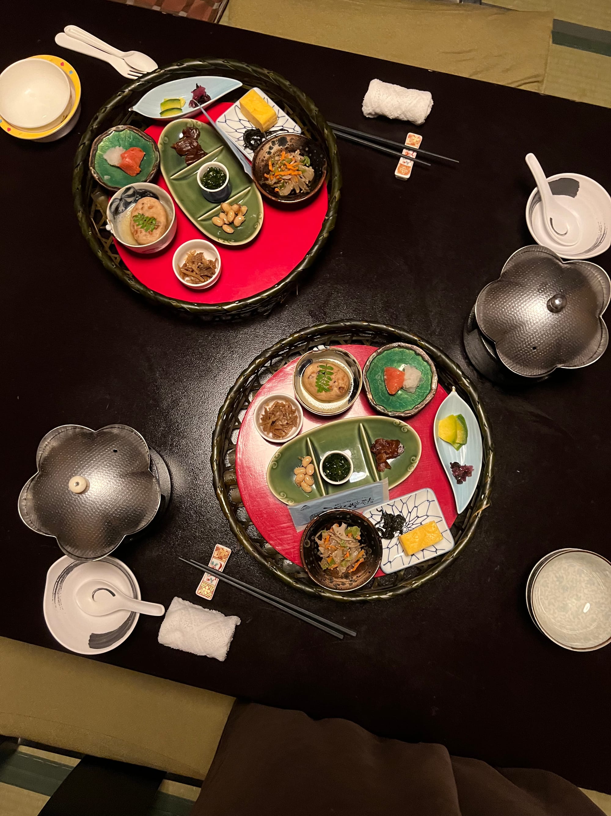 Nie mogliśmy dzisiaj poleniuchować, gdyż w ryokanie panują dosyć restrykcyjnie zasady co do godzin spożywania posiłków. Zamówiliśmy śniadanie najpóźniej jak było to możliwe, czyli na 8… Śniadanie, podobnie jak wczorajszą kolację, podano nam w naszym pokoju, więc przemila, starsza pani już od około 7:30 krzątała się w okolicy. Śniadanie było smaczne i pożywne, jednak nie potrafilibyśmy nazwać wszystkich jego elementów. Z całym przekonaniem możemy powiedzieć, że jednym z nich był biały ryż bez żadnych dodatków, którym Tosia się delektuje od początku wyjazdu. Była też między innymi wędzona rybka czy kawałek melona, którego ku naszej uciesze Tosia zgodziła się również sprobować.