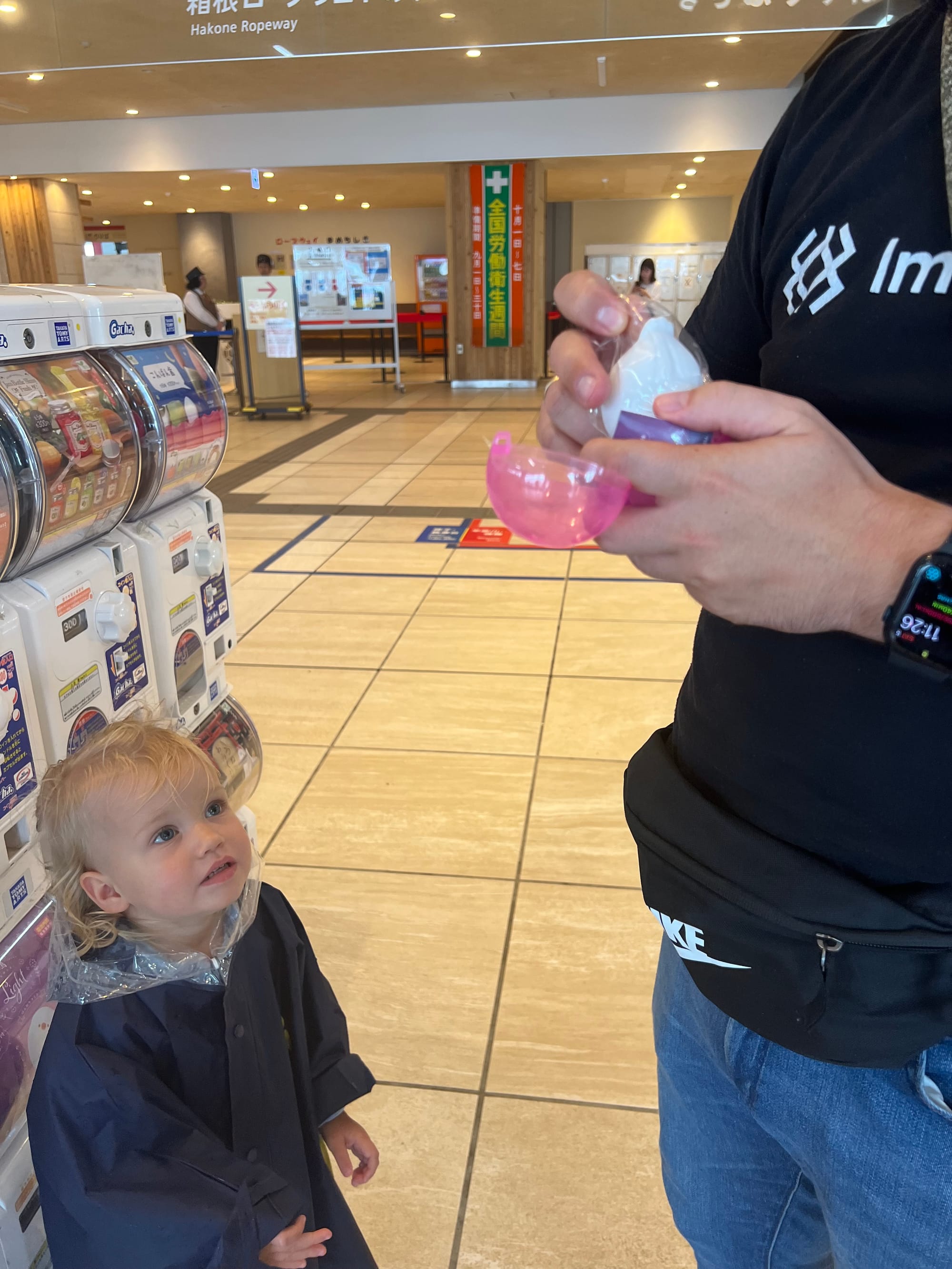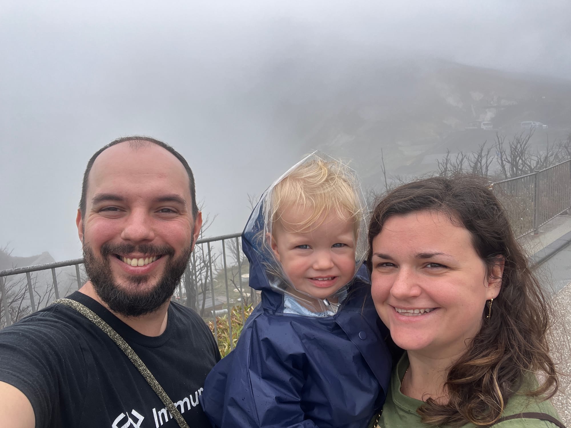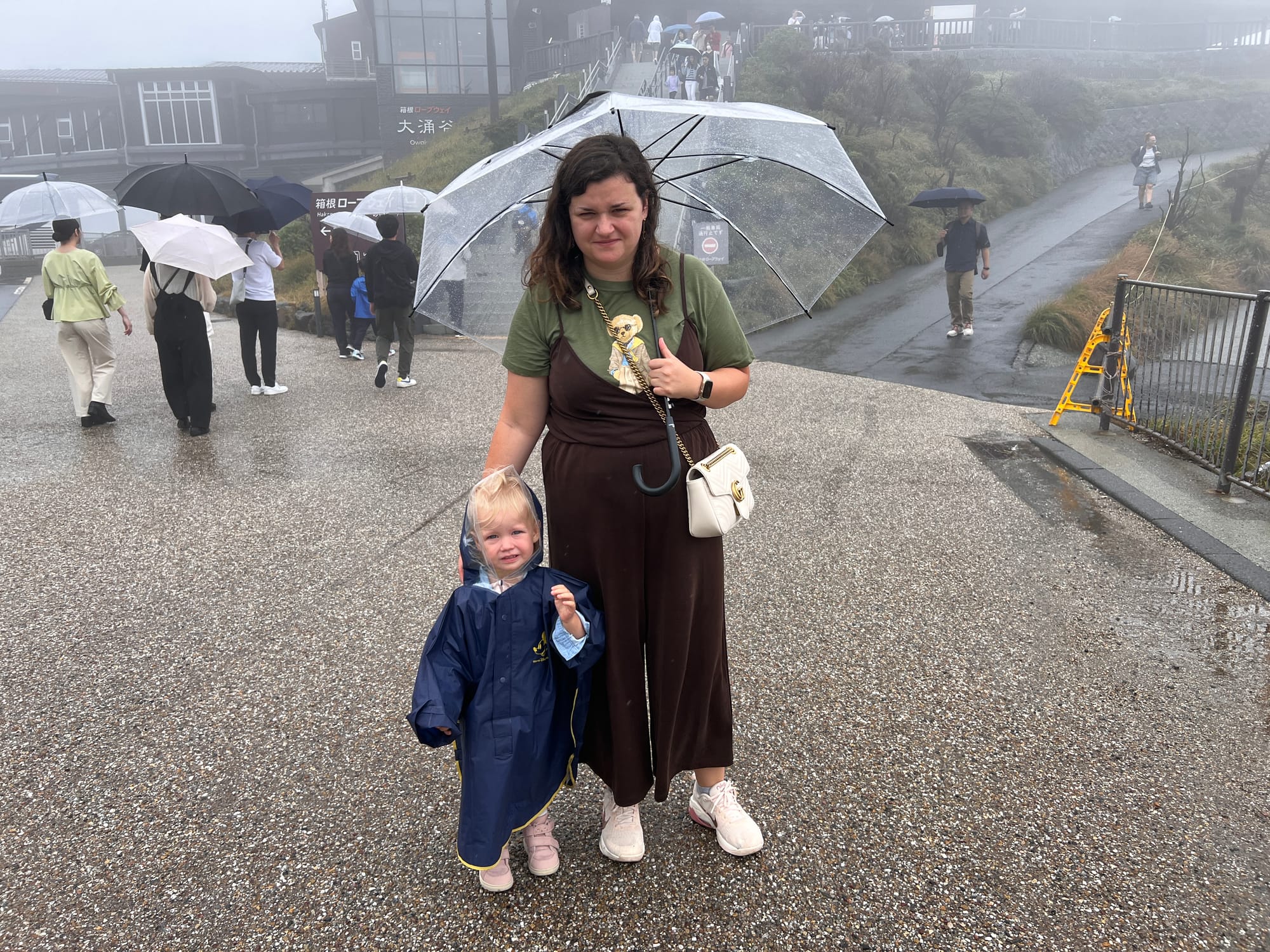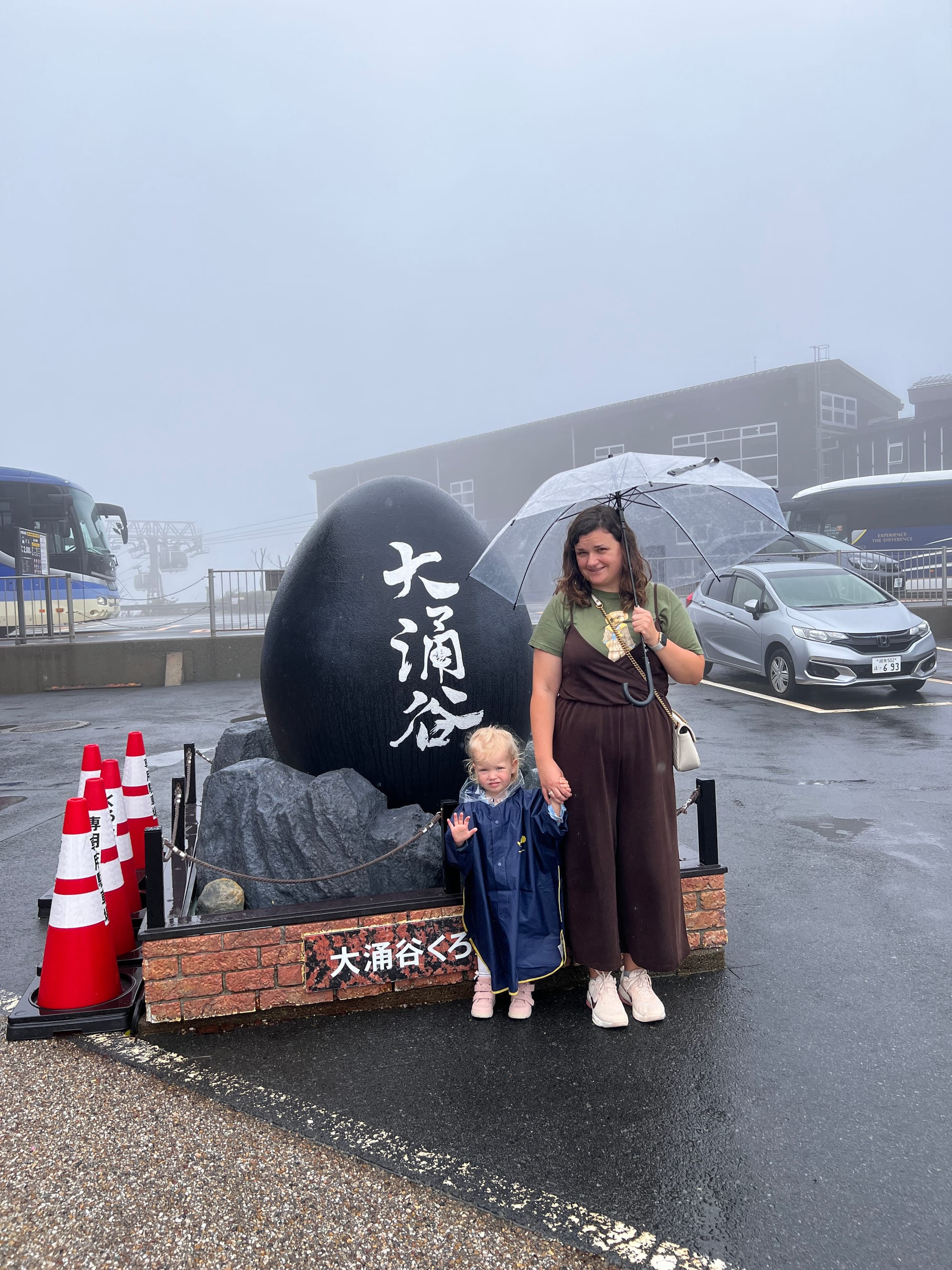 Warto dodać, że Owakudani jest doliną wulkaniczną, która powstała wokół krateru wulkanu, po jego wybuchu około 3000 lat temu. Jest to teren wciąż aktywny sejsmicznie, w obrębie którego występują gorące źródła, ale również właśnie opary siarki. Jako że nie jesteśmy ludźmi szczególnie odpornymi na przykre zapachy, co zresztą widać po naszych minach na większości powyższych zdjęć, wyskoczyliśmy tylko pstryknąć kilka fotek i czym prędzej uciekliśmy do budynku stacji kolejki, gdzie Tosia zażyczyła sobie jeszcze zabaweczkę z automatu, dokładnie wskazując którą.