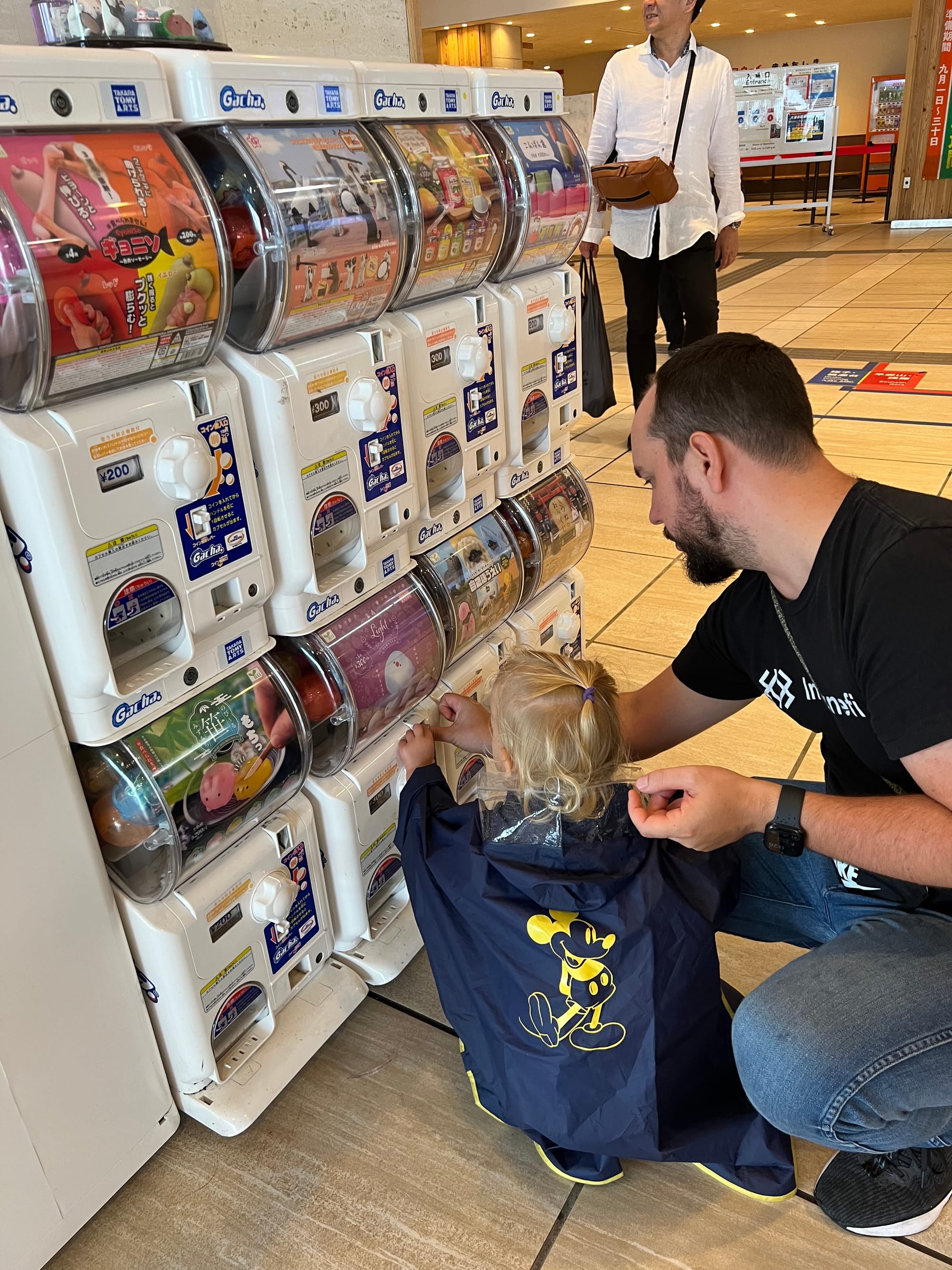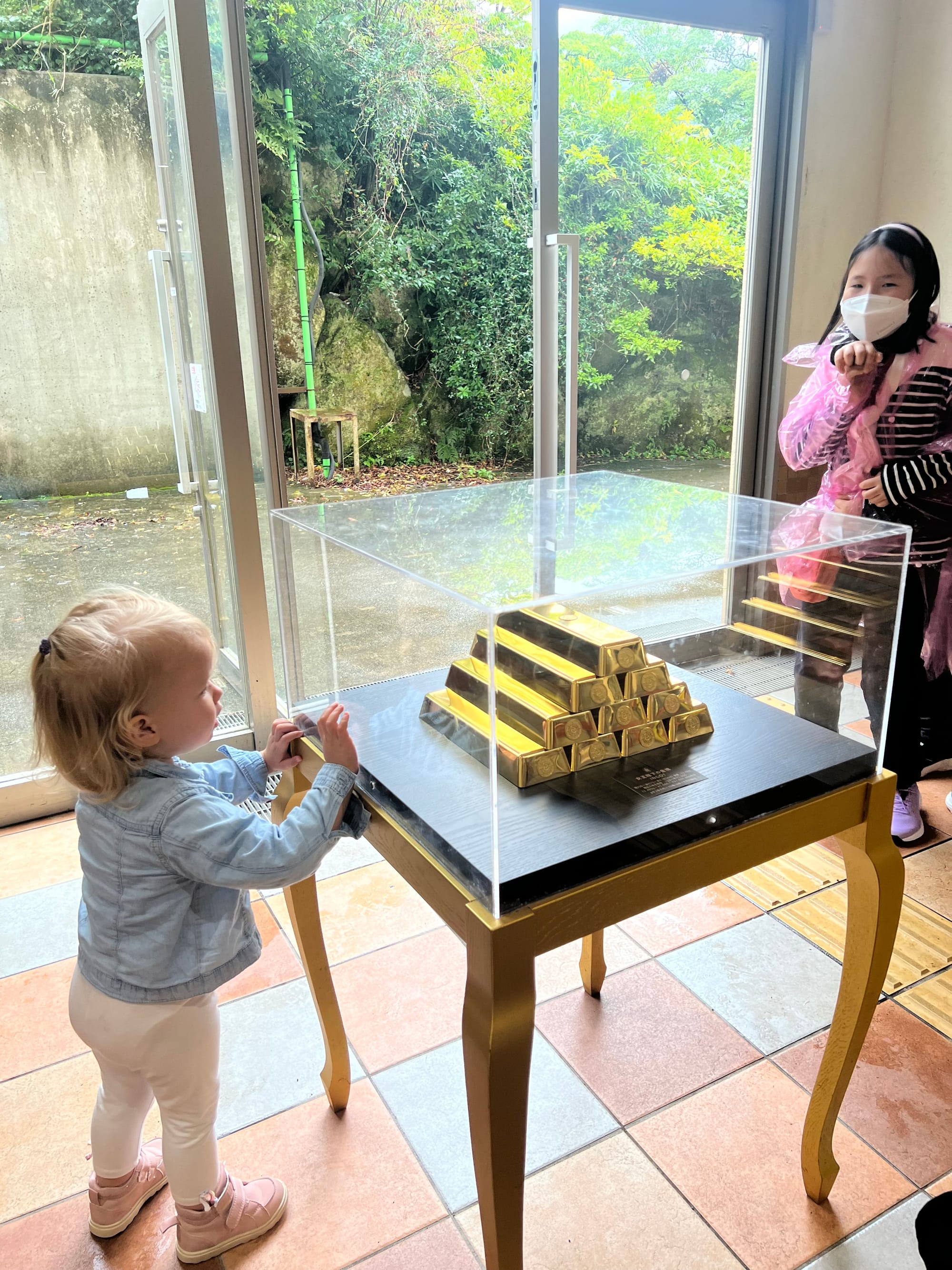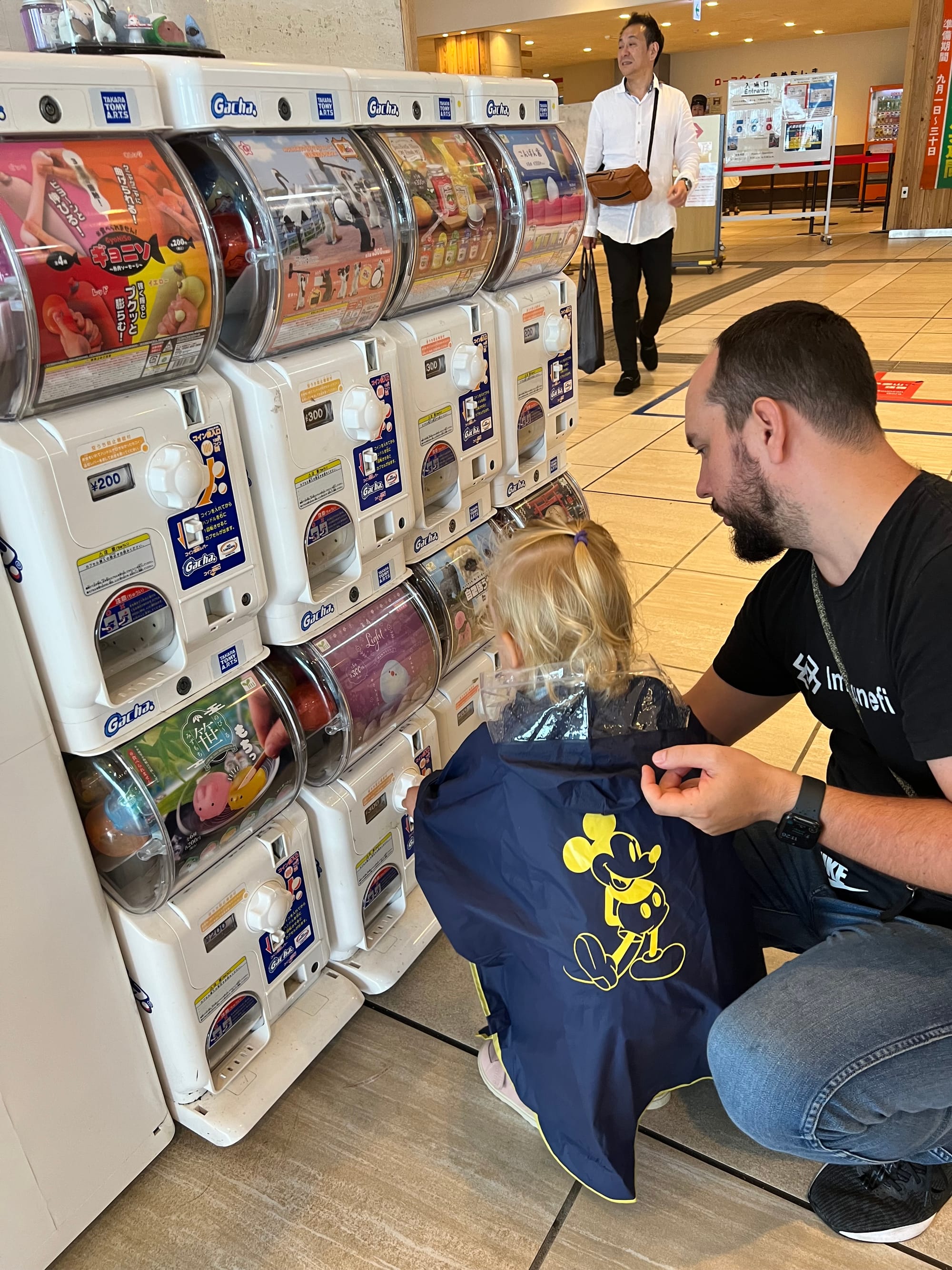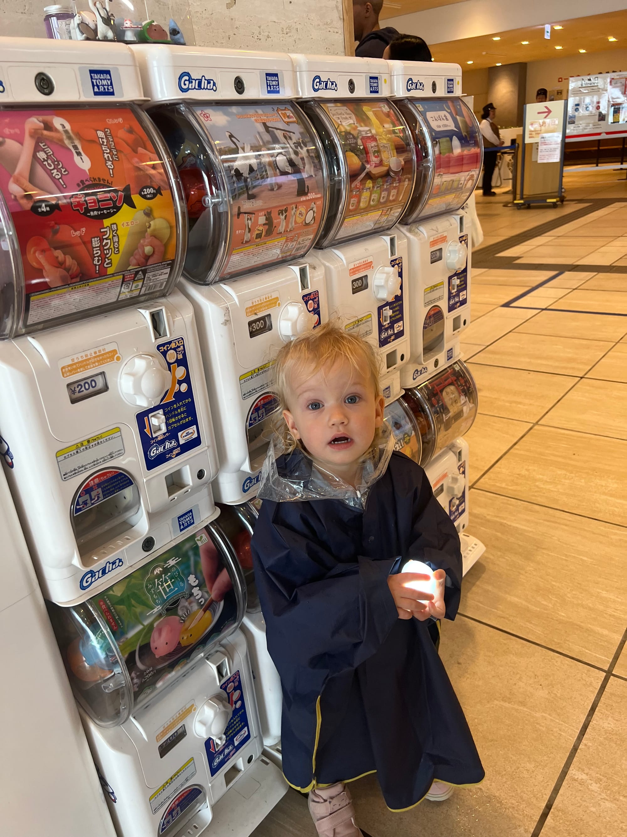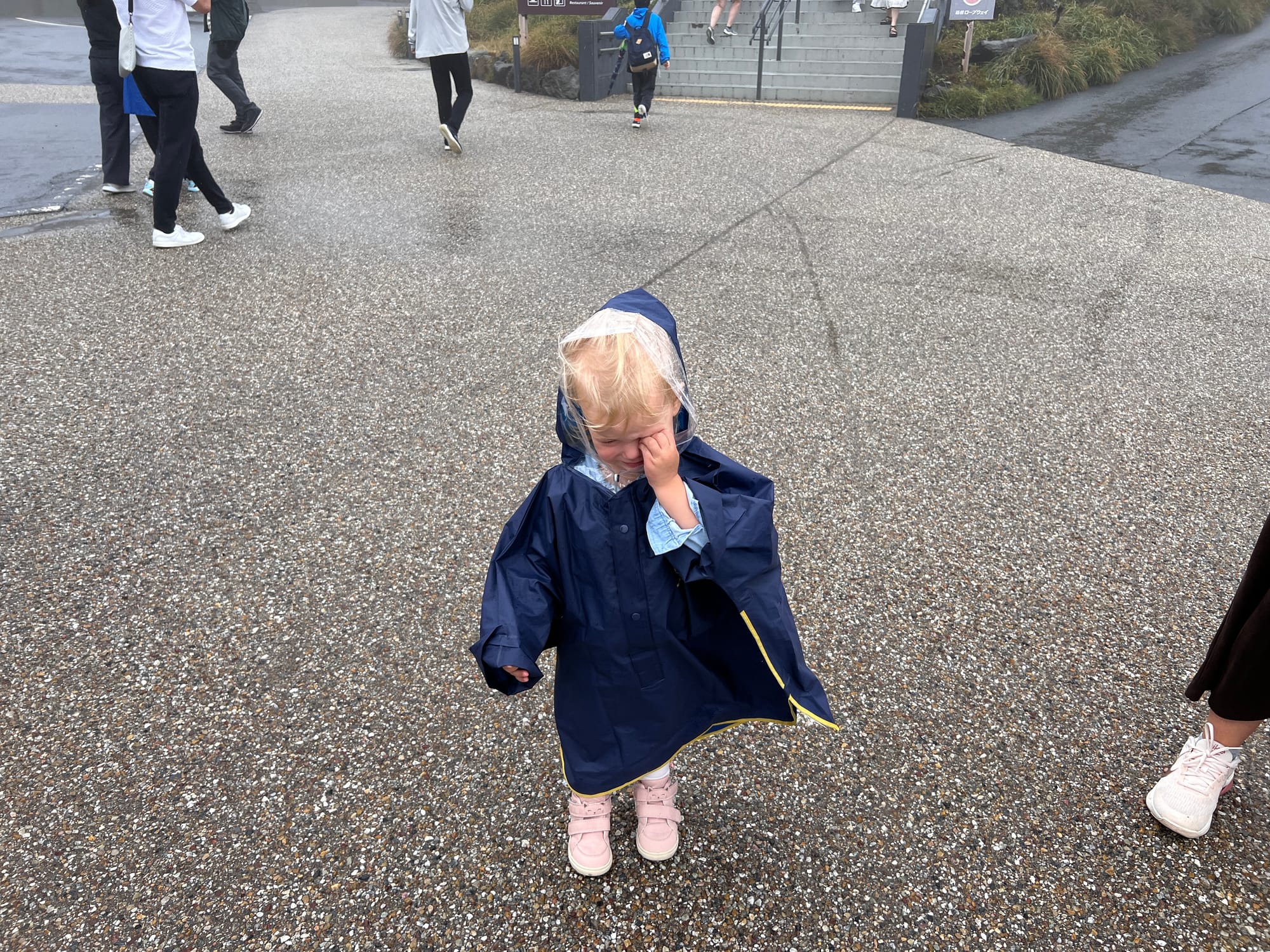 Warto dodać, że Owakudani jest doliną wulkaniczną, która powstała wokół krateru wulkanu, po jego wybuchu około 3000 lat temu. Jest to teren wciąż aktywny sejsmicznie, w obrębie którego występują gorące źródła, ale również właśnie opary siarki. Jako że nie jesteśmy ludźmi szczególnie odpornymi na przykre zapachy, co zresztą widać po naszych minach na większości powyższych zdjęć, wyskoczyliśmy tylko pstryknąć kilka fotek i czym prędzej uciekliśmy do budynku stacji kolejki, gdzie Tosia zażyczyła sobie jeszcze zabaweczkę z automatu, dokładnie wskazując którą.