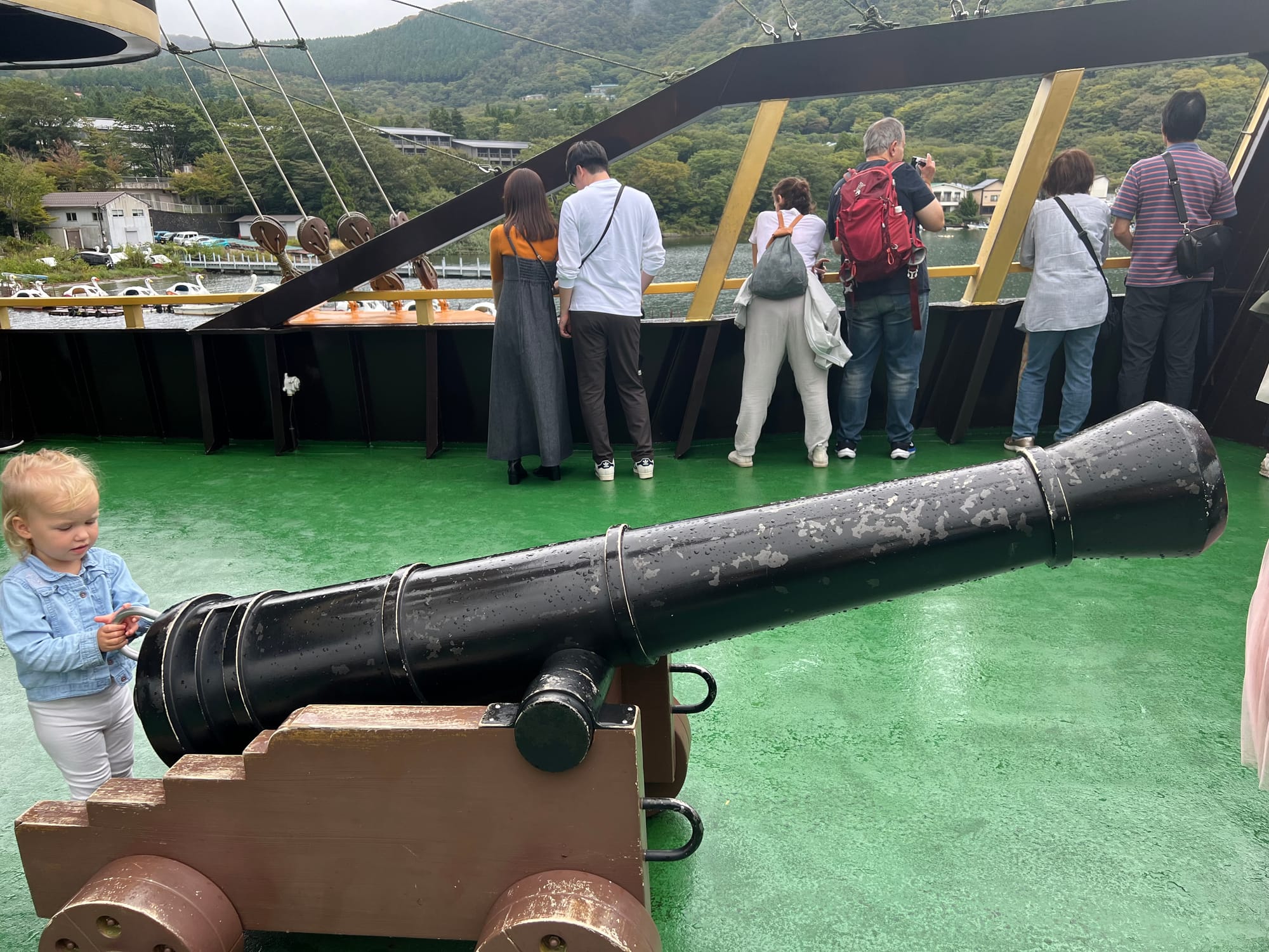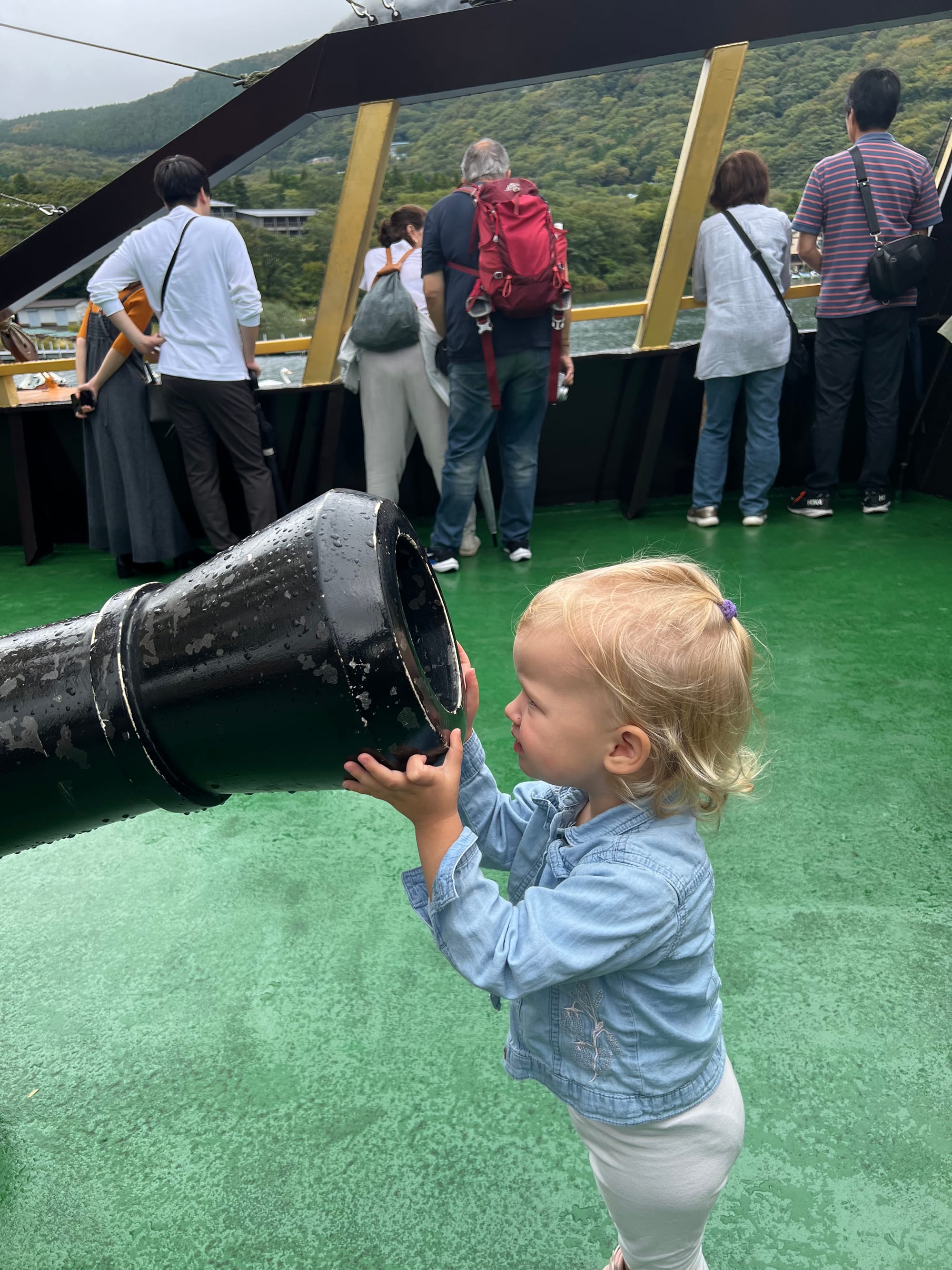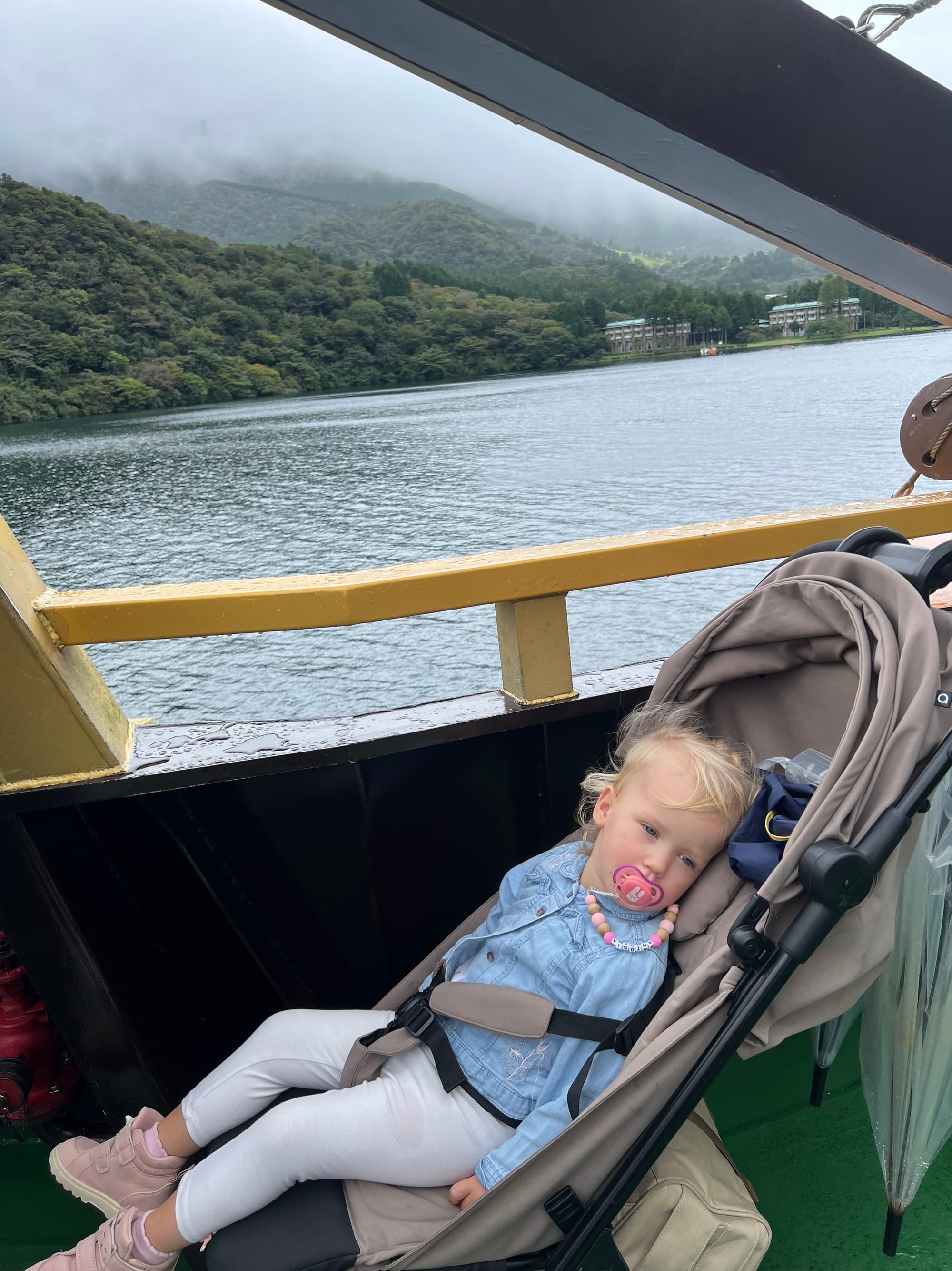 Następnie udaliśmy się w rejs statkiem na drugą stronę jeziora, podziwiając przepiękne widoki, które wprawiły nas w wyśmienity nastrój. Tosia natomiast najpierw zachwyciła się armatą stanowiącą dekorację statku, a później opadła z sił i zasnęła w wózeczku.