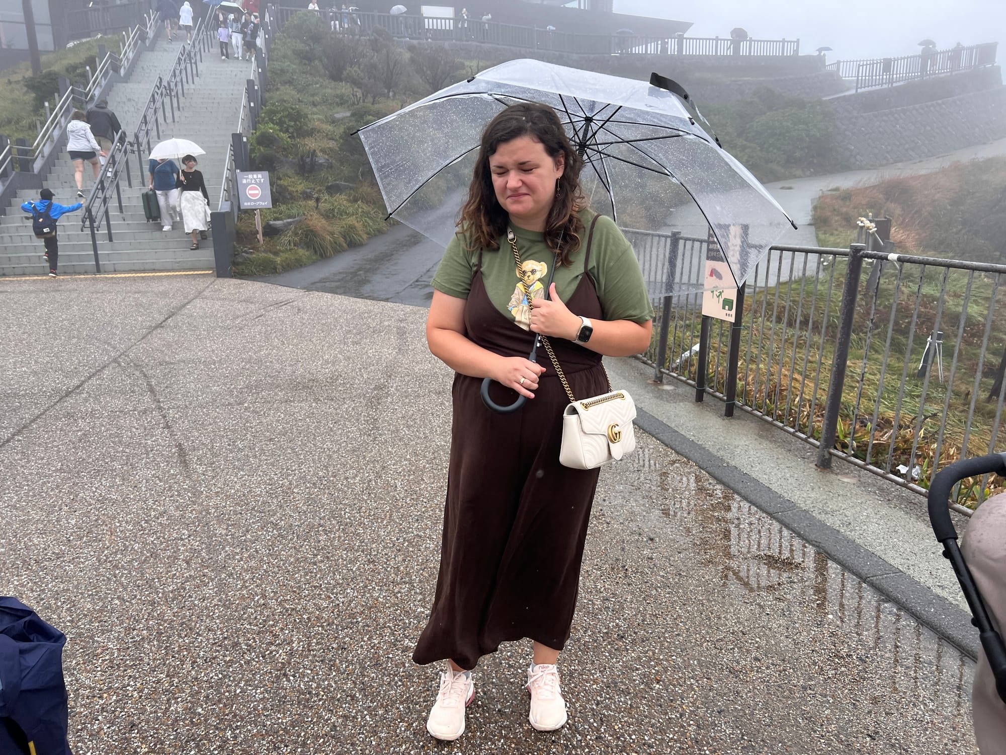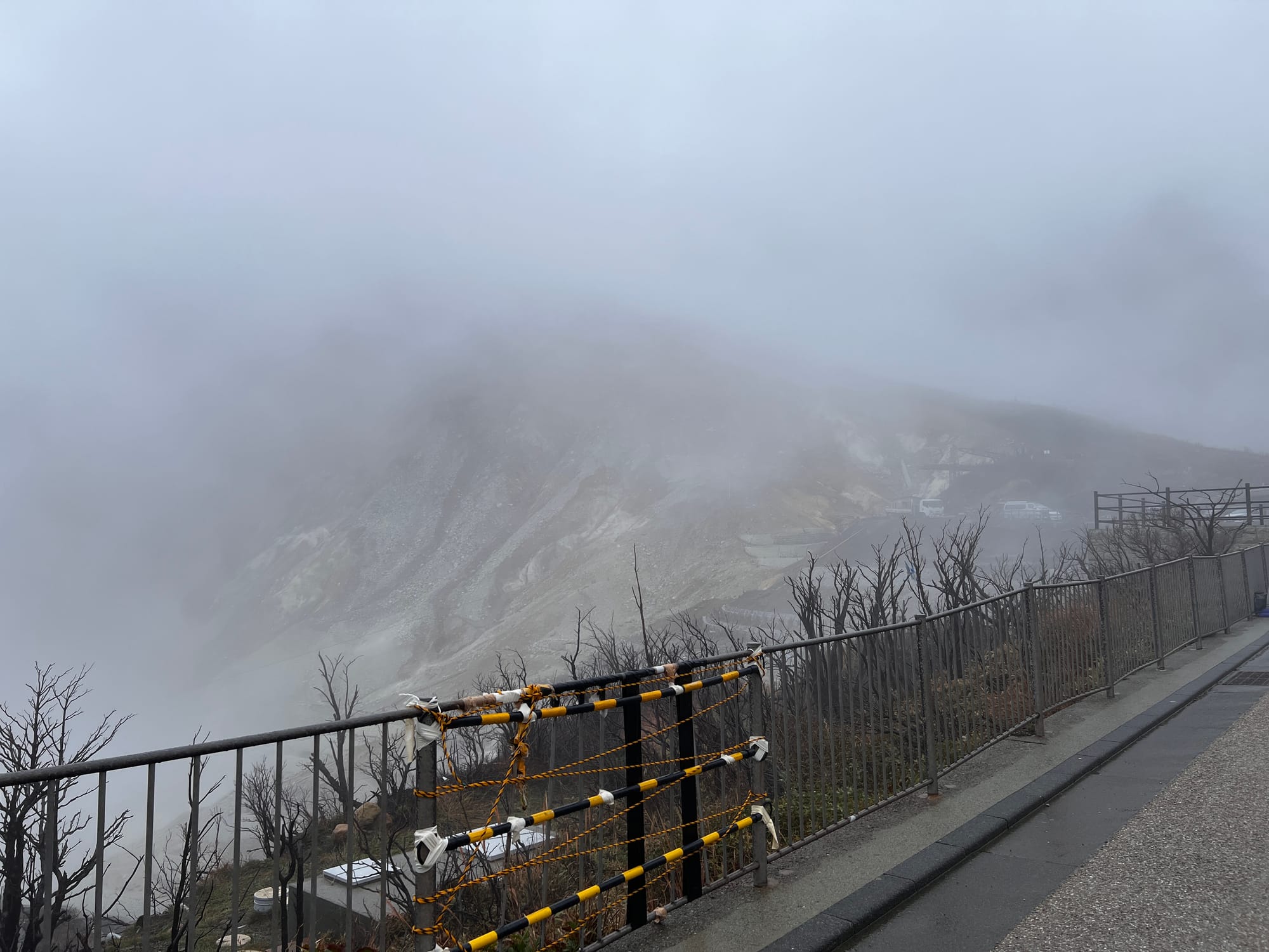 Z doliny Owakudani w pogodny dzień można podziwiać piękne widoki, przy dużym szczęściu, dostrzec można nawet górę Fuji. Przy naszym szczęściu dostrzegliśmy jedynie ogrom mgły, za to najgorszym aspektem pobytu tam był intensywny, szczypiący w oczy i powodujący ból głowy zapach siarki, który my określiliśmy mianem smrodu zgniłego jaja. Podsumowując więc, pięknych widoków zero, góry Fuji zero, za to smrodu pod dostatkiem.