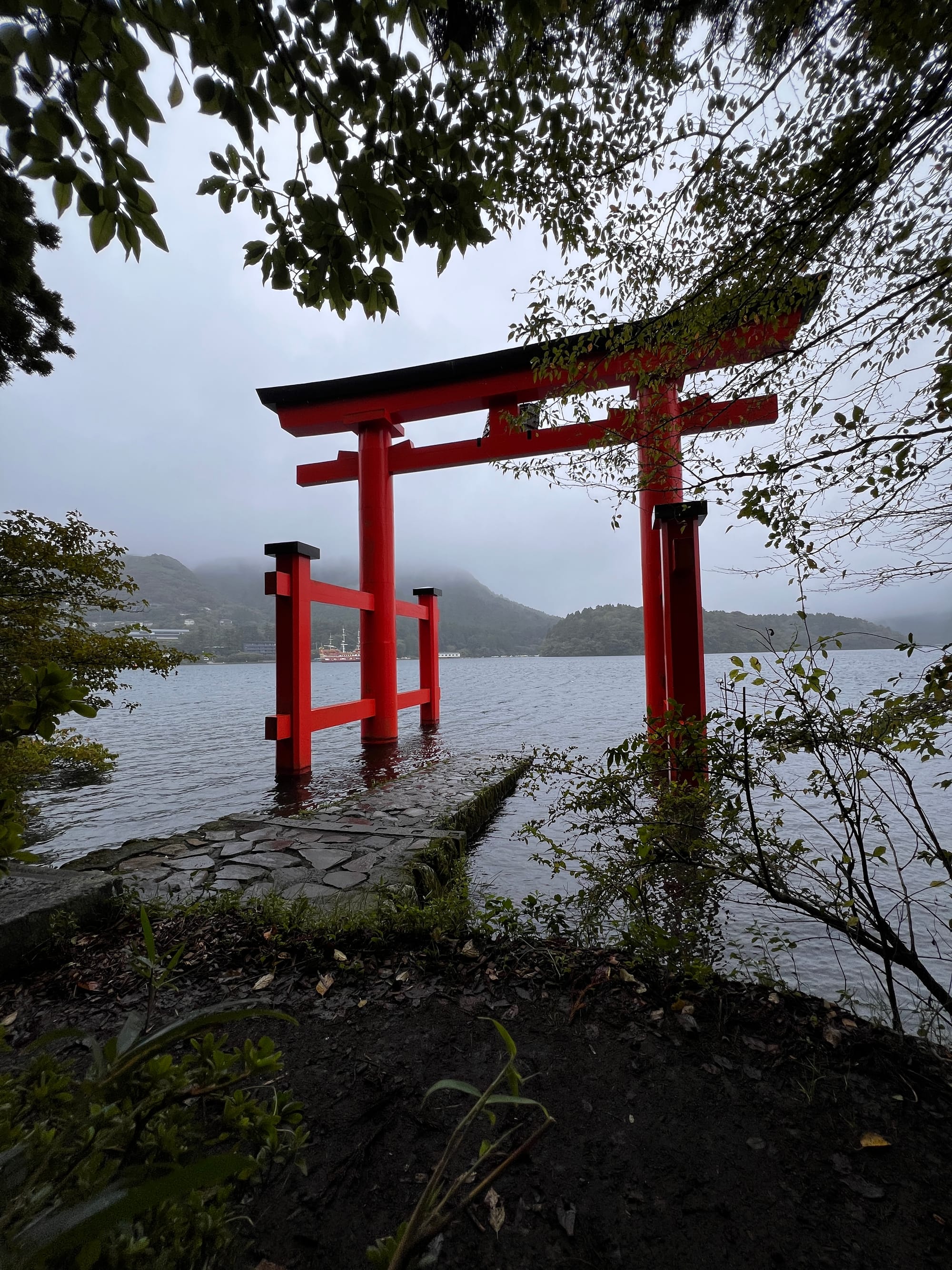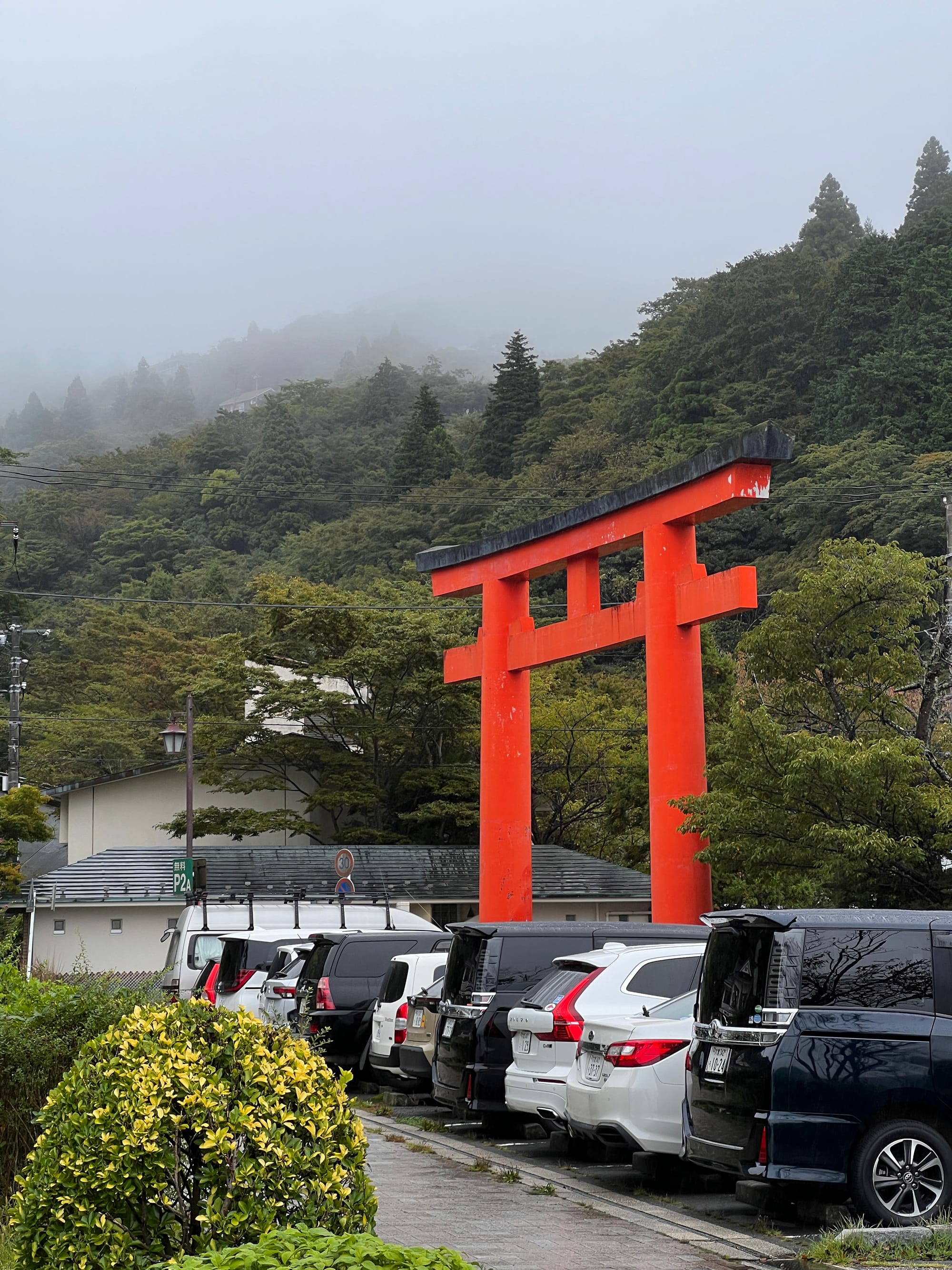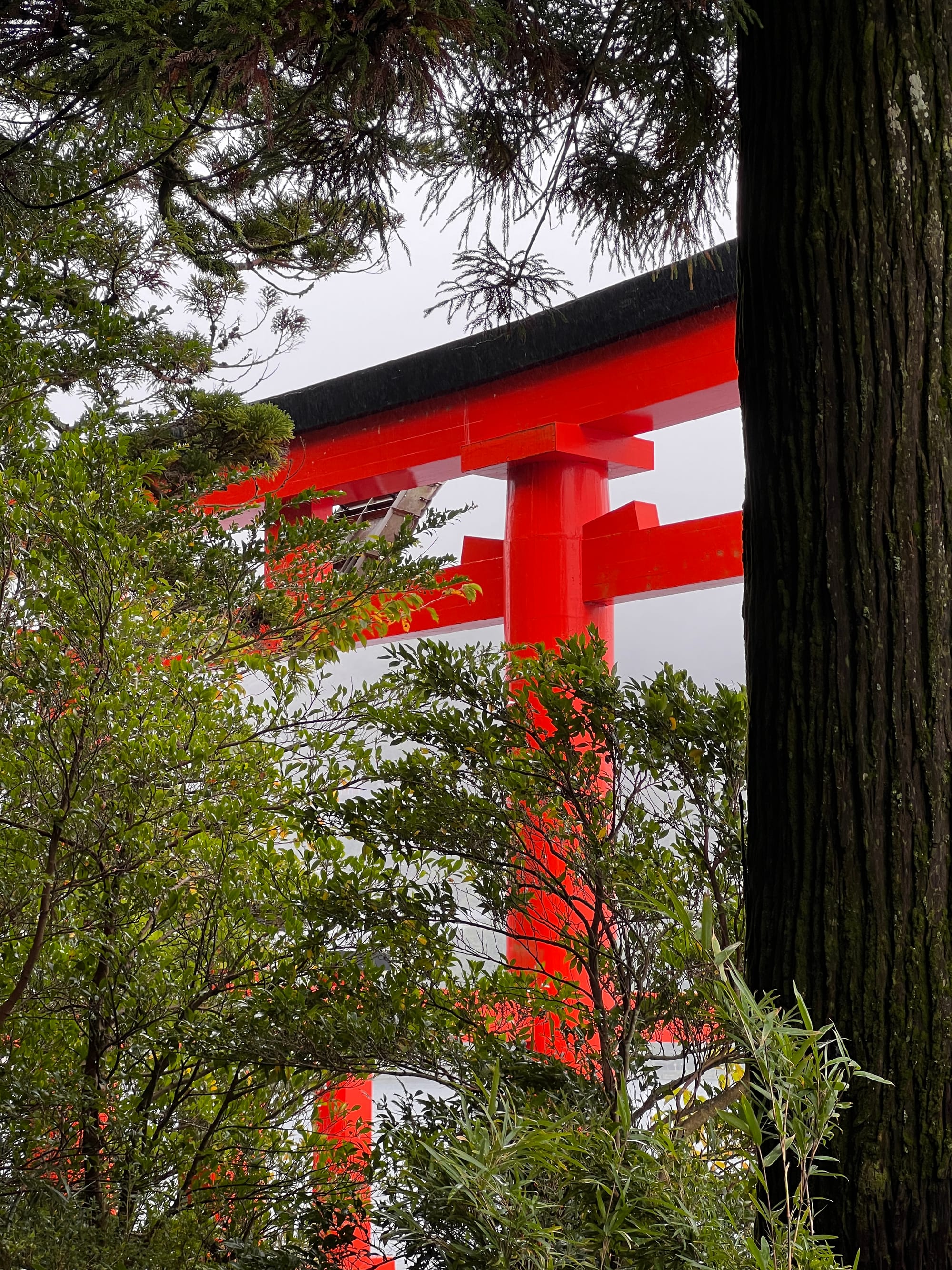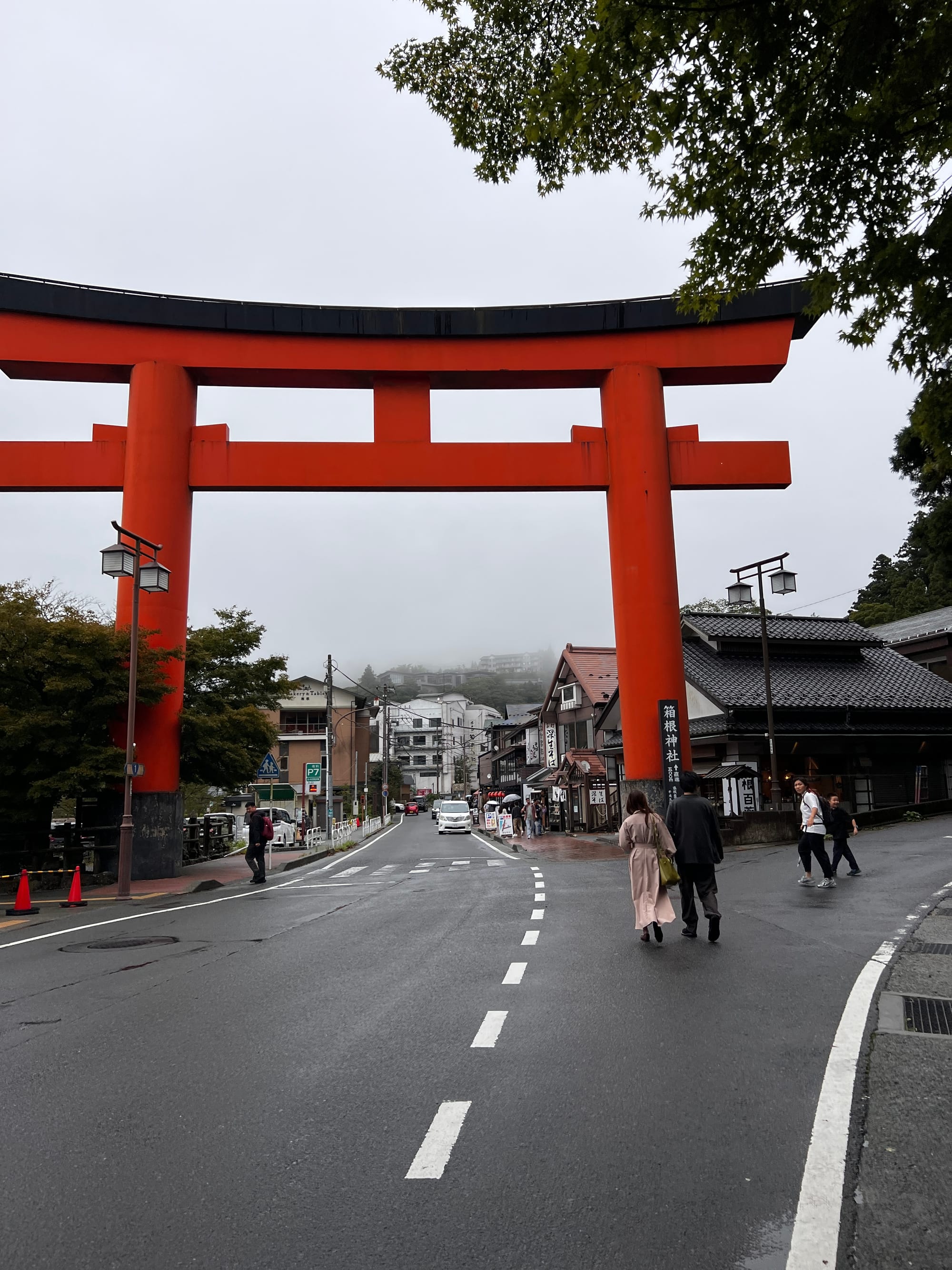 Po dotarciu na ląd, wyruszyliśmy w dalszą trasę, najpierw autobusem, a później spacerem, pod słynną bramę Torii w Hakone. Torii jest tradycyjną japońską bramą, znajdującą się w szczególności przy wejściu do świątyni Shinto lub wewnątrz niej, symbolizując przejście od przyziemnych spraw do świętości. Generalnie bramy Torii są często spotykane w Japonii, jednak niektóre, z uwagi na ich położenie i otaczający je krajobraz, cieszą się większą popularnością wśród turystów. Tak też jest z bramą, pod którą dzisiaj się wybraliśmy. Po czekaniu w kolejce około 15 minut na możliwość zrobienia sobie zdjęcia pod samą bramą i perspektywą kolejnych 30 minut oczekiwania, postanowiliśmy nieco zboczyć z głównej ścieżki i zrobić sobie zdjęcie bramy od innej strony.