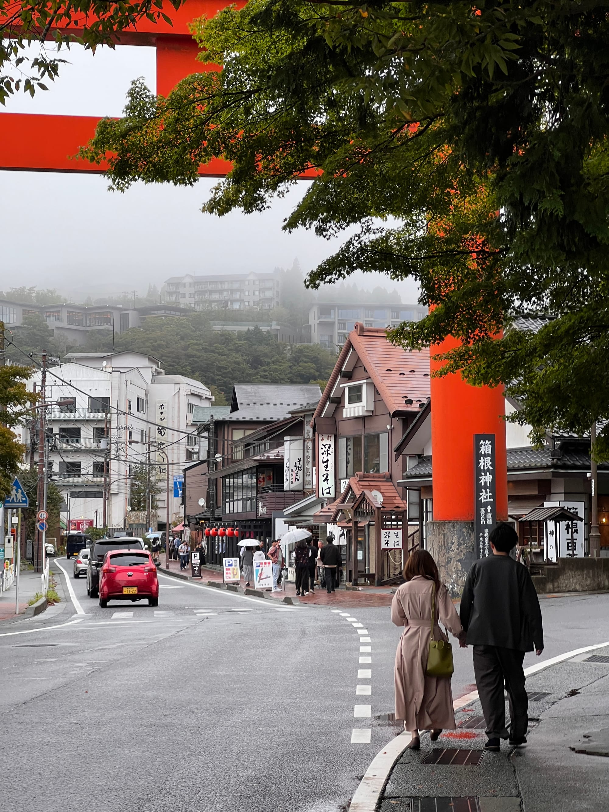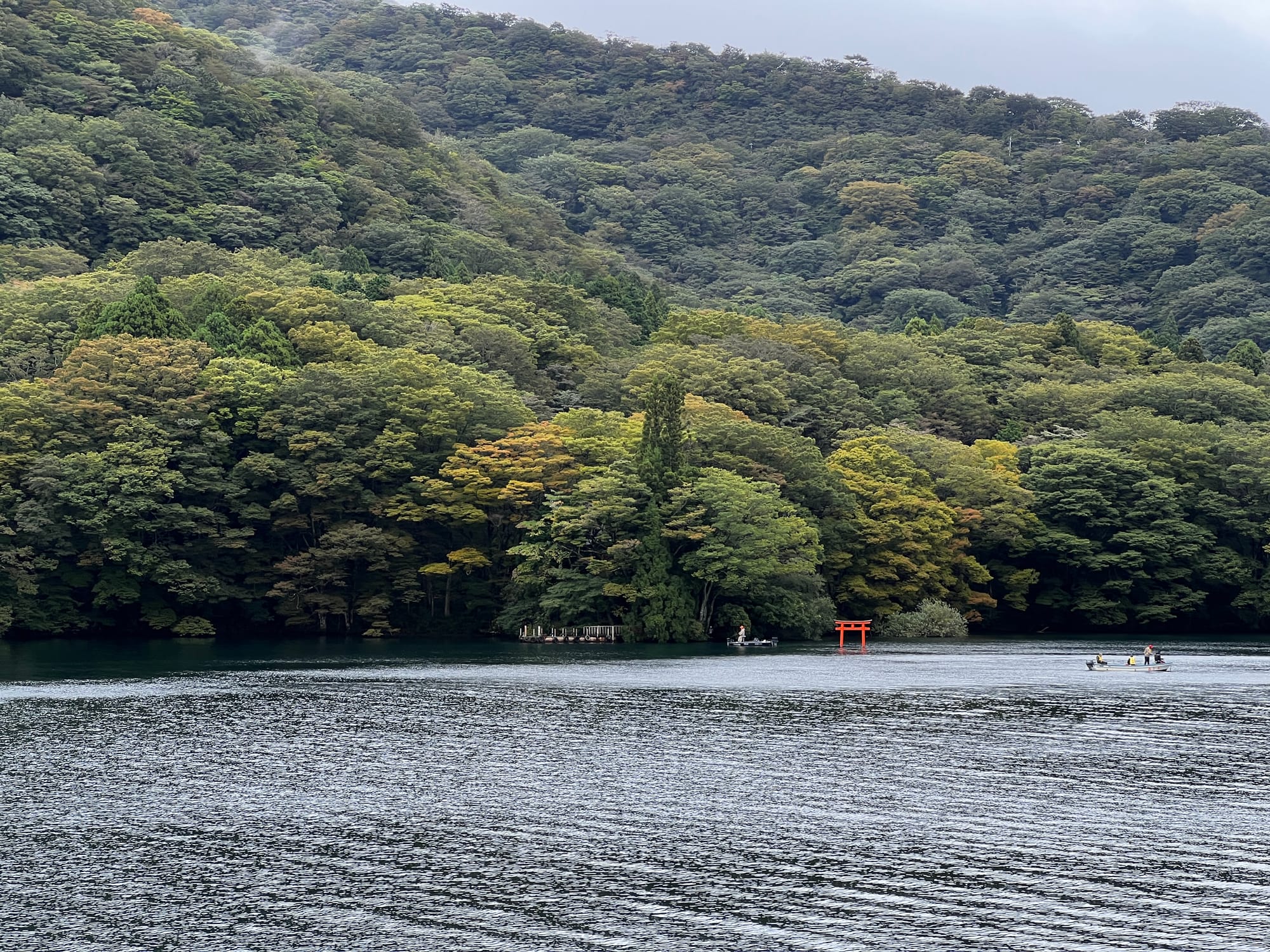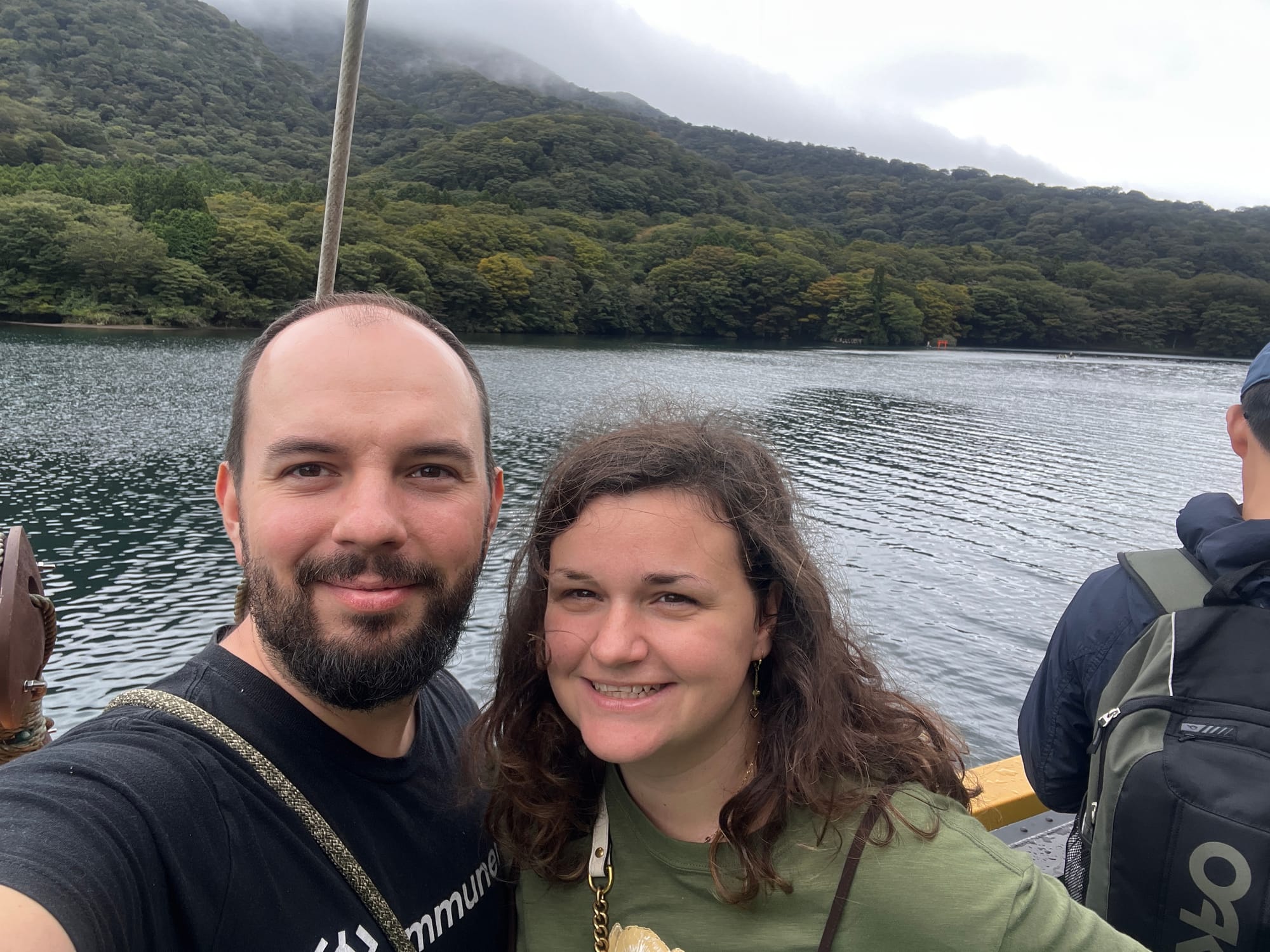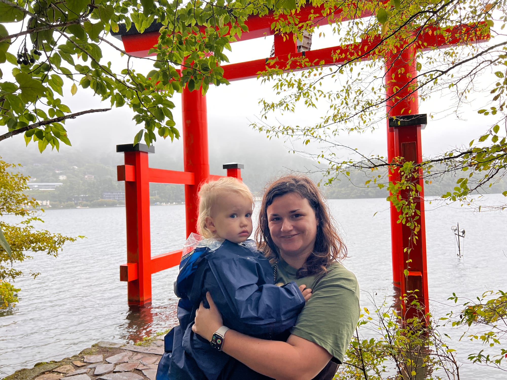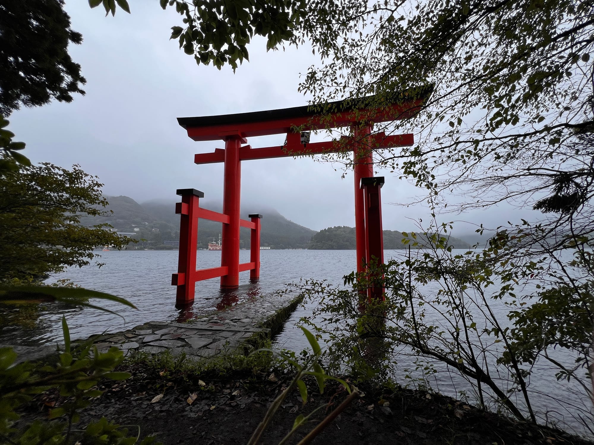 Po dotarciu na ląd, wyruszyliśmy w dalszą trasę, najpierw autobusem, a później spacerem, pod słynną bramę Torii w Hakone. Torii jest tradycyjną japońską bramą, znajdującą się w szczególności przy wejściu do świątyni Shinto lub wewnątrz niej, symbolizując przejście od przyziemnych spraw do świętości. Generalnie bramy Torii są często spotykane w Japonii, jednak niektóre, z uwagi na ich położenie i otaczający je krajobraz, cieszą się większą popularnością wśród turystów. Tak też jest z bramą, pod którą dzisiaj się wybraliśmy. Po czekaniu w kolejce około 15 minut na możliwość zrobienia sobie zdjęcia pod samą bramą i perspektywą kolejnych 30 minut oczekiwania, postanowiliśmy nieco zboczyć z głównej ścieżki i zrobić sobie zdjęcie bramy od innej strony.