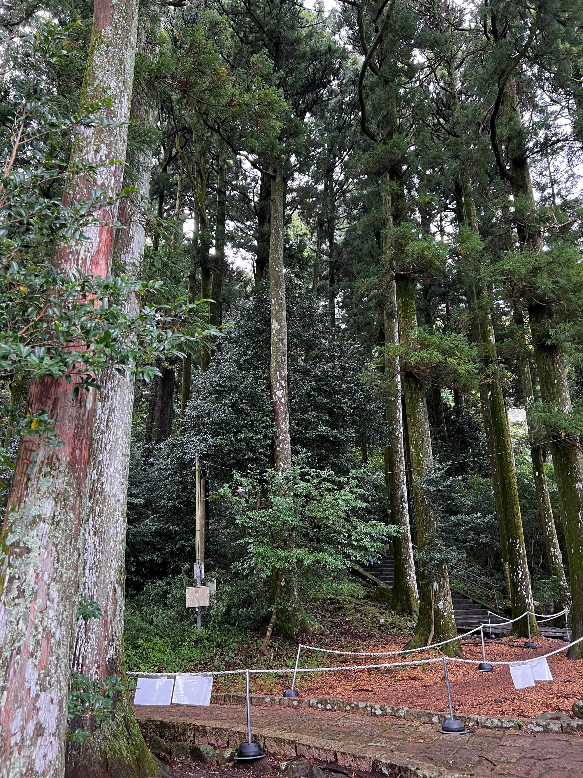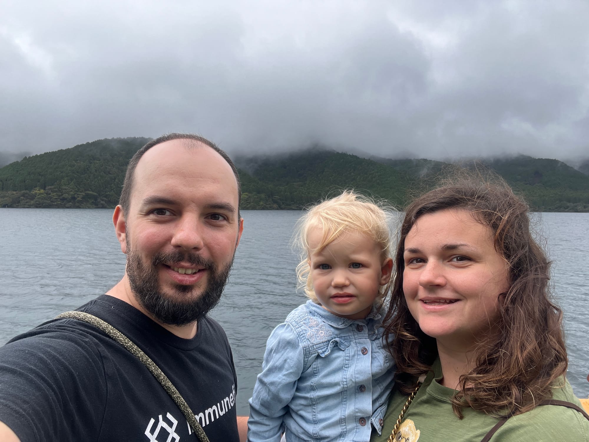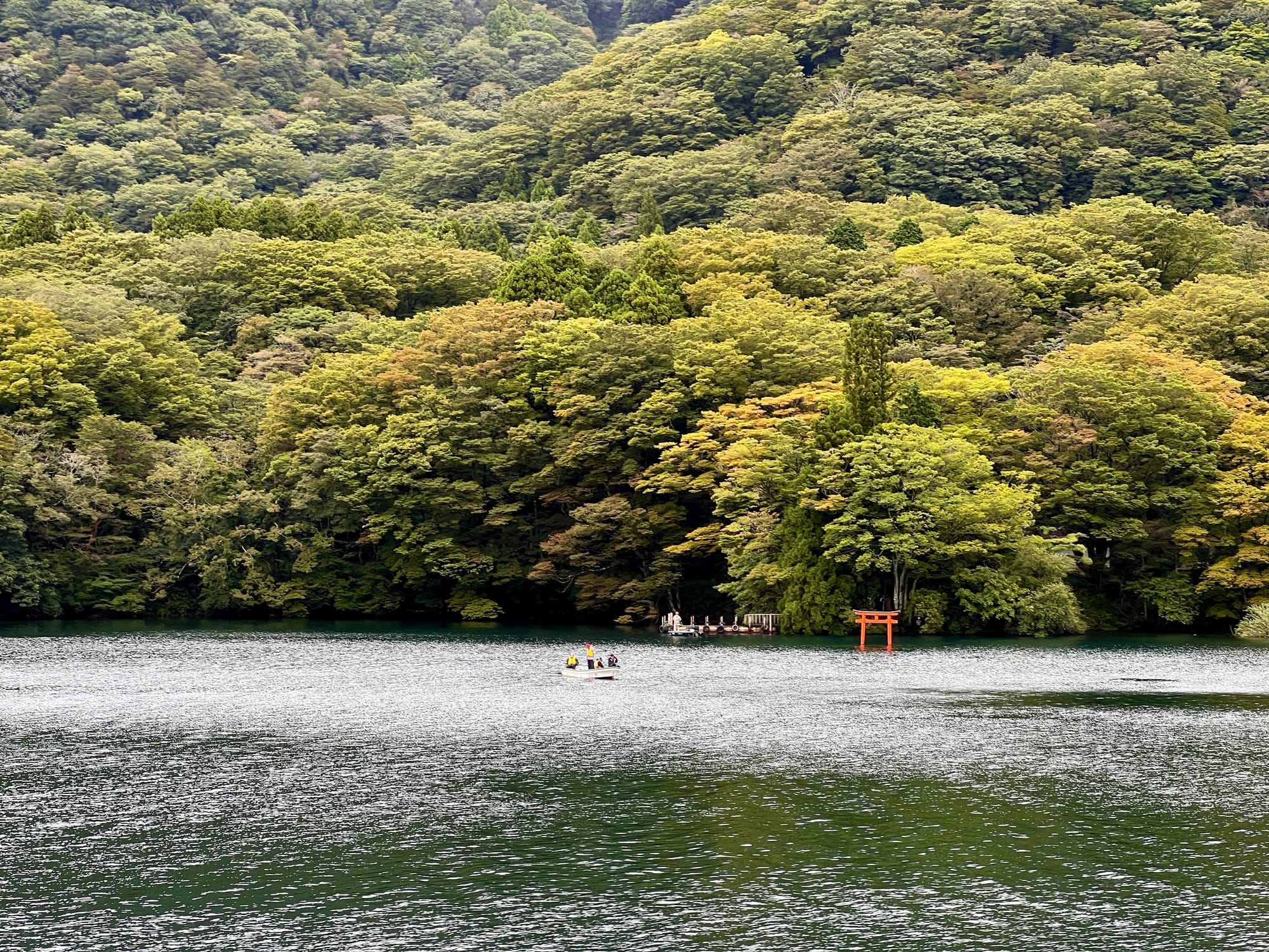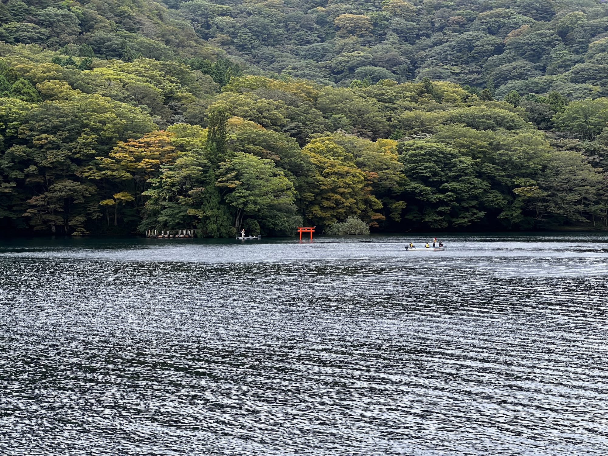 Po dotarciu na ląd, wyruszyliśmy w dalszą trasę, najpierw autobusem, a później spacerem, pod słynną bramę Torii w Hakone. Torii jest tradycyjną japońską bramą, znajdującą się w szczególności przy wejściu do świątyni Shinto lub wewnątrz niej, symbolizując przejście od przyziemnych spraw do świętości. Generalnie bramy Torii są często spotykane w Japonii, jednak niektóre, z uwagi na ich położenie i otaczający je krajobraz, cieszą się większą popularnością wśród turystów. Tak też jest z bramą, pod którą dzisiaj się wybraliśmy. Po czekaniu w kolejce około 15 minut na możliwość zrobienia sobie zdjęcia pod samą bramą i perspektywą kolejnych 30 minut oczekiwania, postanowiliśmy nieco zboczyć z głównej ścieżki i zrobić sobie zdjęcie bramy od innej strony.