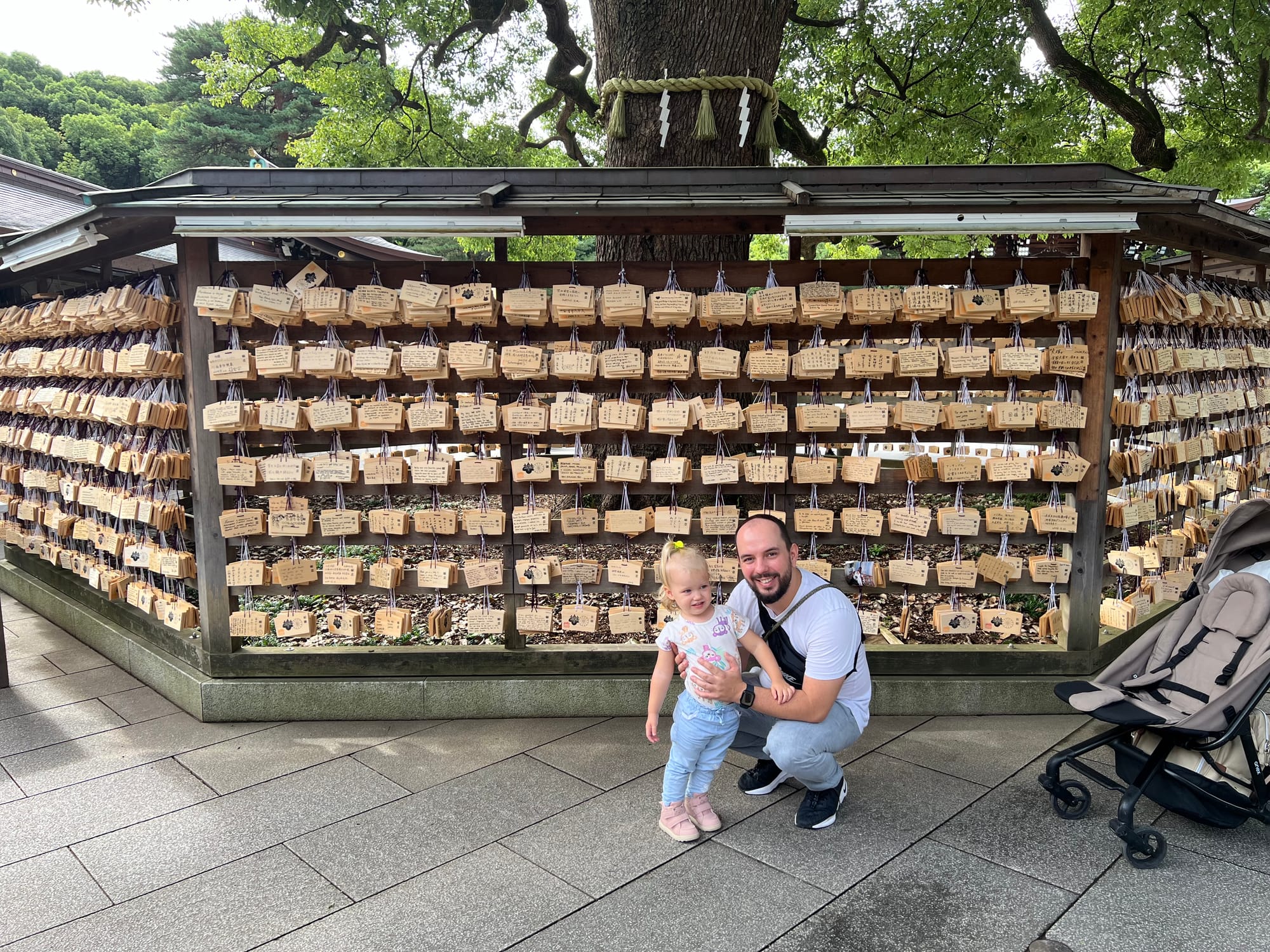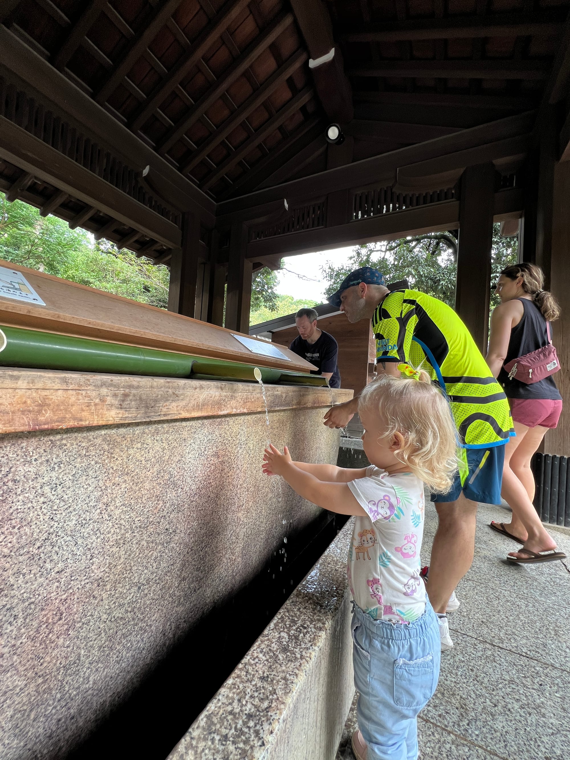 Przed świątynią znajduje się zbiornik z wodą, którą można obmyć ręce i twarz (Tosia ochoczo korzystała z tej opcji) oraz sklepik, w którym można nabyć różnego rodzaju talizmany mające przynieść nabywcy określone korzyści. My zdecydowaliśmy się na zakup tego, który ma przynieść po prostu szczęście. Oczywiście traktujemy go jako pamiątkę, a nie inwestycję w przychylność losu. Dodatkowo przed świątynią znajduje się miejsce, w którym można powiesić tabliczkę z wypisanymi własnoręczne marzeniami czy planami na najbliższy czas, które dzięki temu mają się spełnić. Z tej opcji jednak już nie skorzystaliśmy, w końcu po co komu aż tyle szczęścia 🫢.