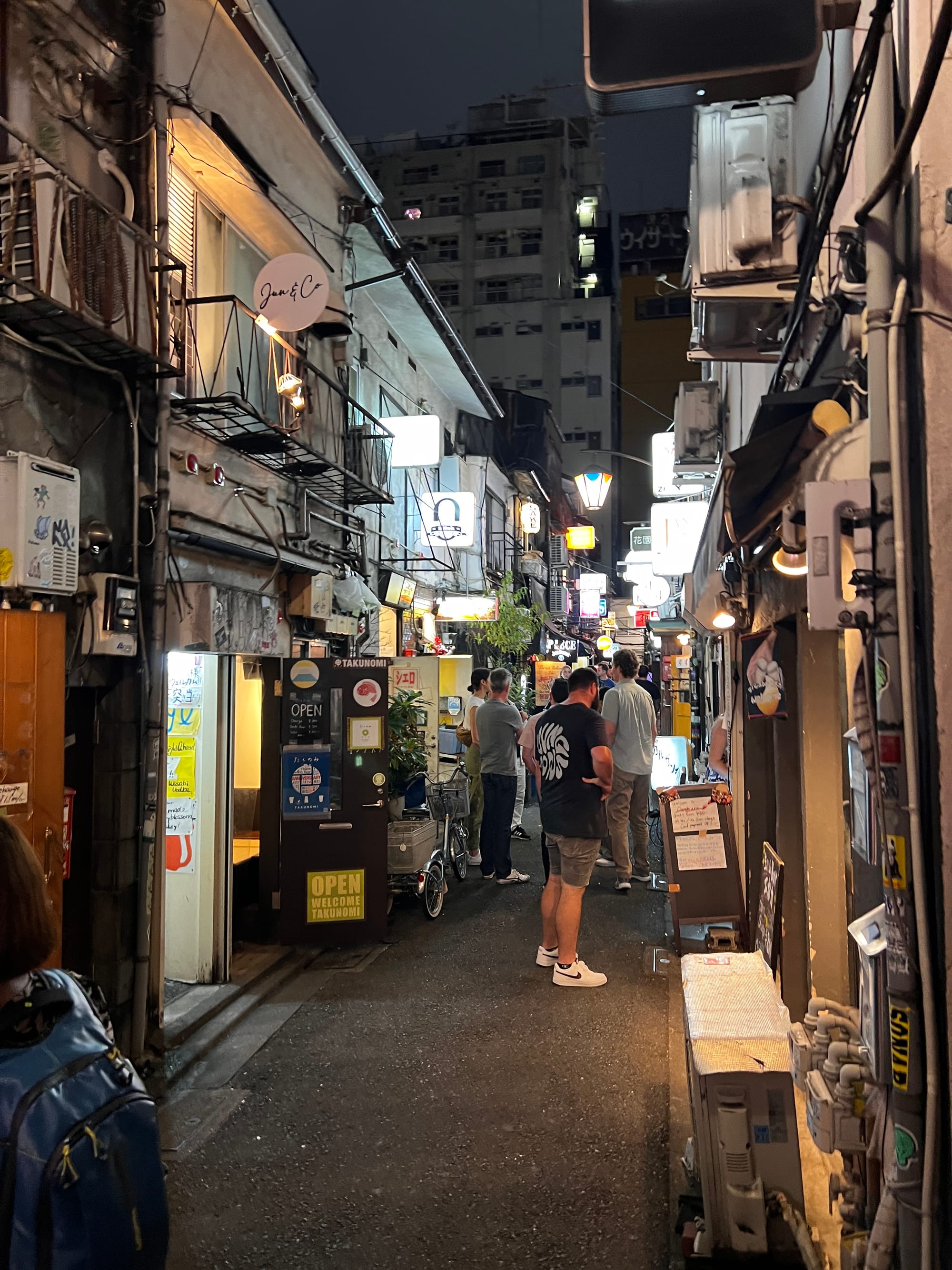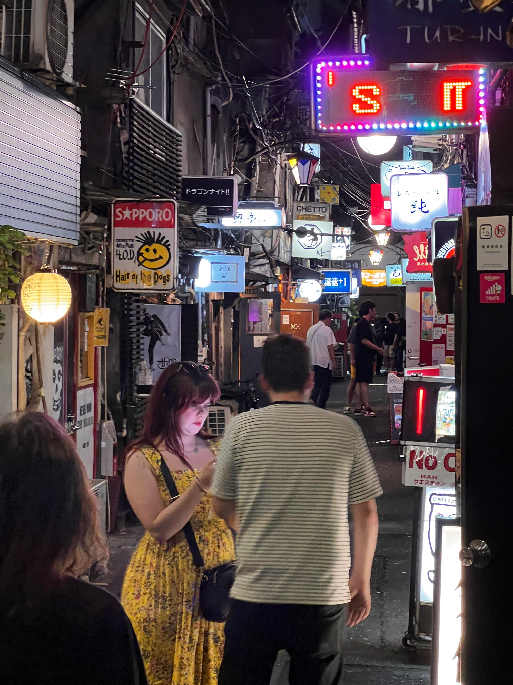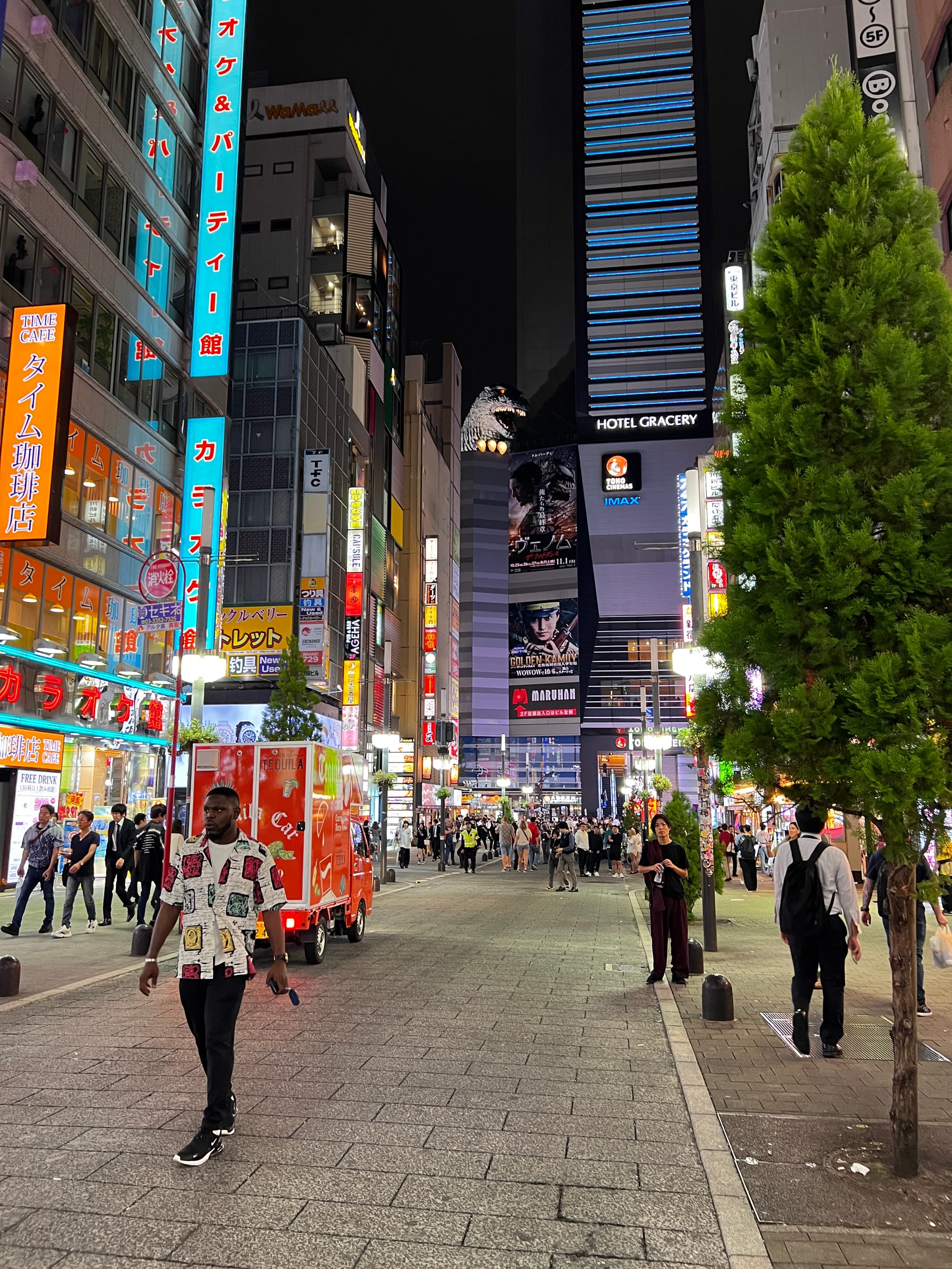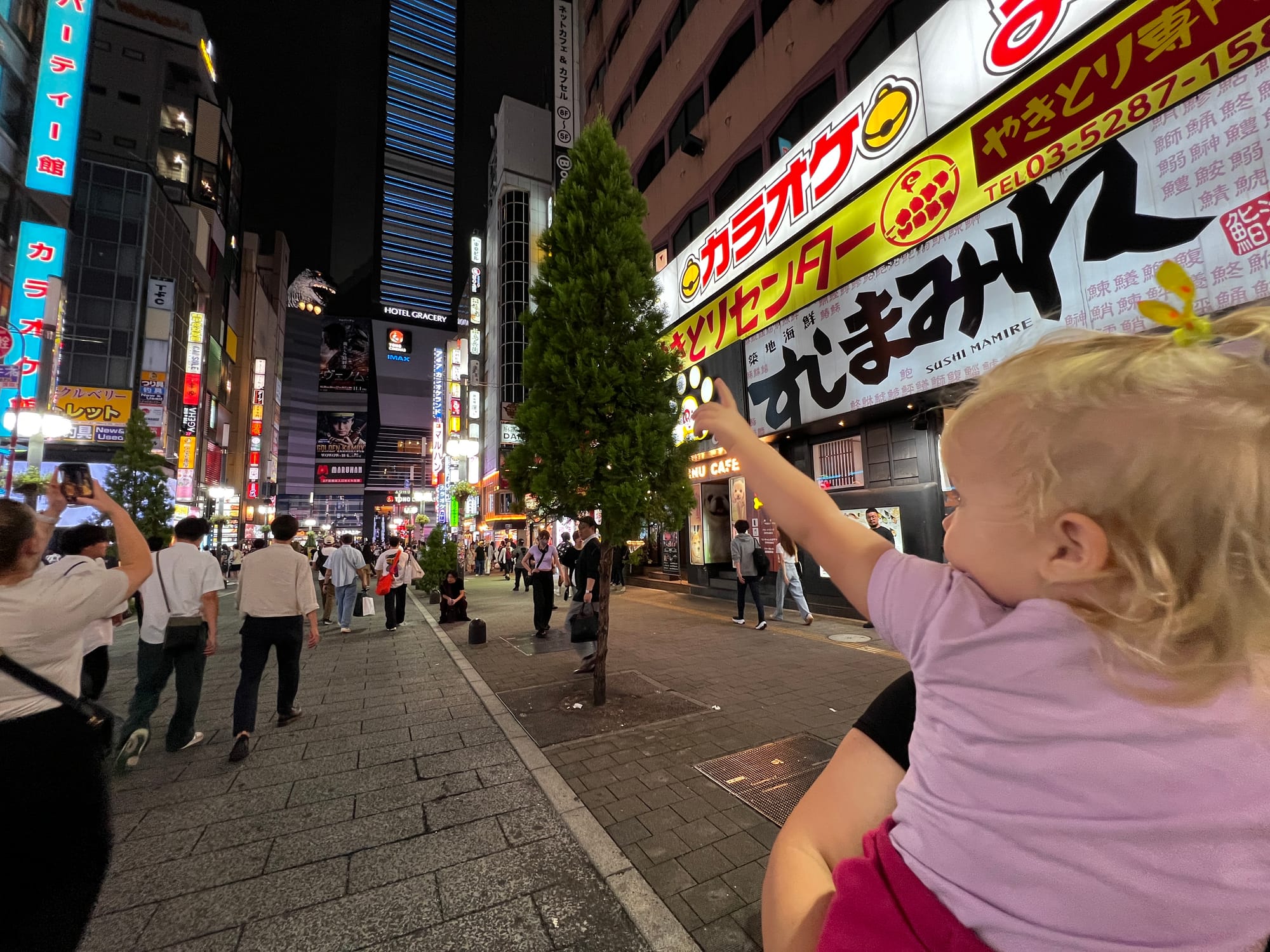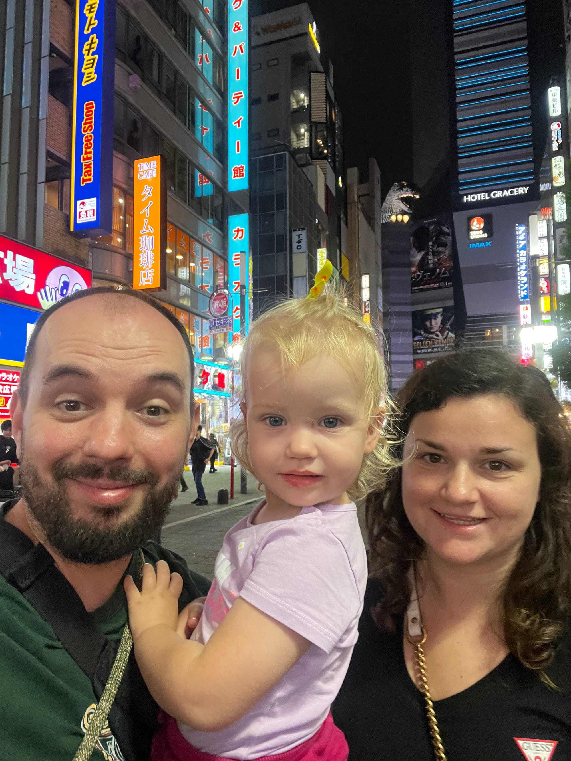 Po powrocie do mieszkania, znów wykończeni, ale tym razem zadowoleni, poszliśmy na drzemkę. Po regeneracji sił udaliśmy się jeszcze na spacer po naszej dzielnicy, która lepiej prezentuje się po zmroku. Dotarliśmy do takich atrakcji jak głowa Godzilli wystająca zza wysokiego budynku Toho zlokalizowanego w pobliżu oświetlonego neonami obszaru Kabukicho oraz Golden Gai, czyli ponad 200 maleńkich barów (mieszczących jedynie kilka osób) zlokalizowanych na niewielkiej powierzchni i oddzielonych wąskimi, zatłoczonymi uliczkami. Jest to jedno z nielicznych miejsc, które zachowały klimat Tokio pomimo zmieniających się czasów. Glowa Godzilli zrobiła szczególne wrażenie na Tosieńce, która bez przerwy na nią pokazywała, bardzo się przy tym ciesząc.