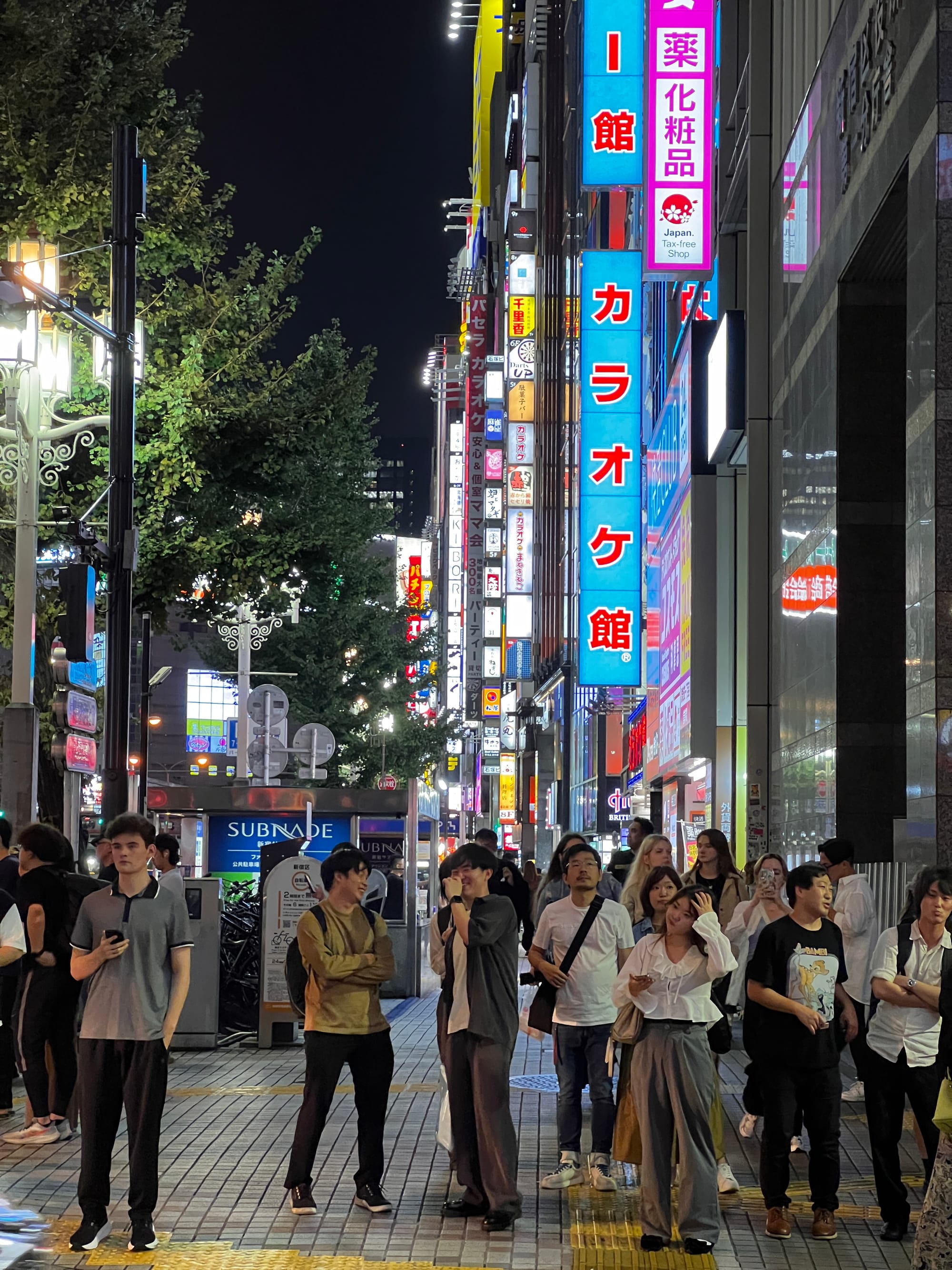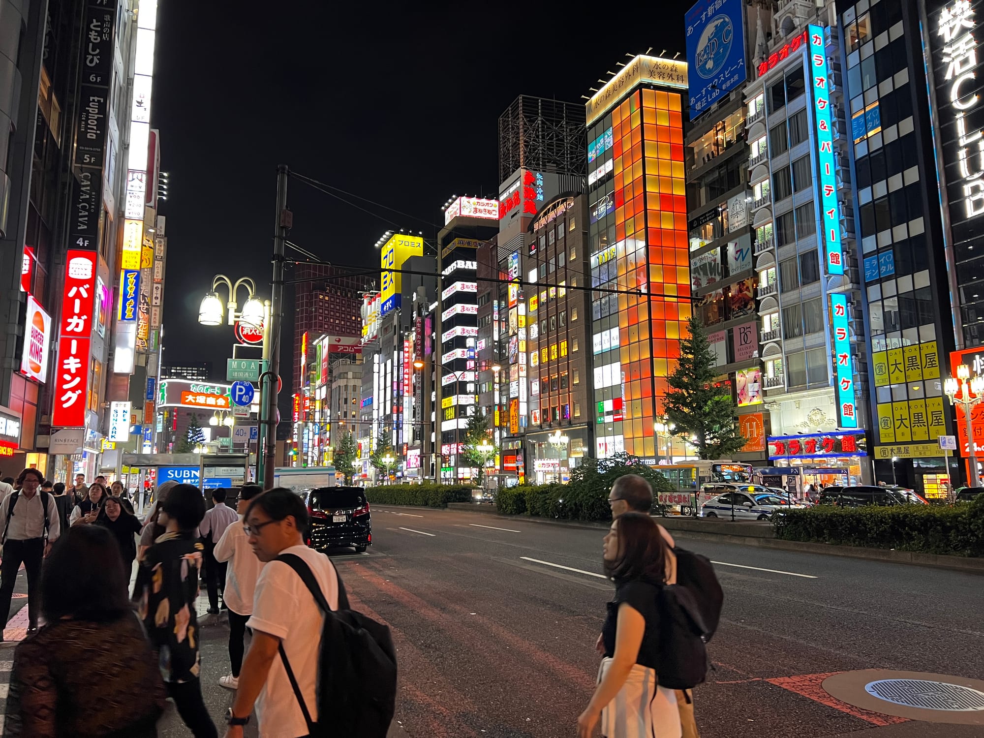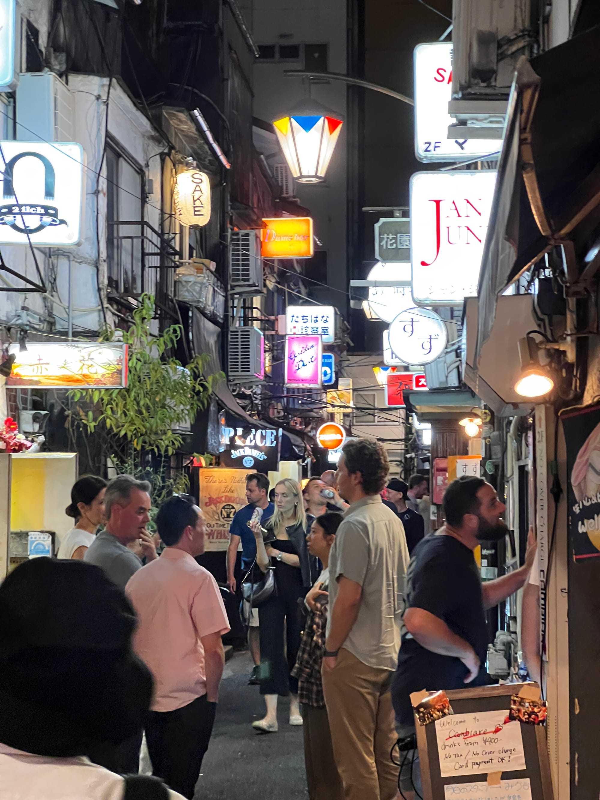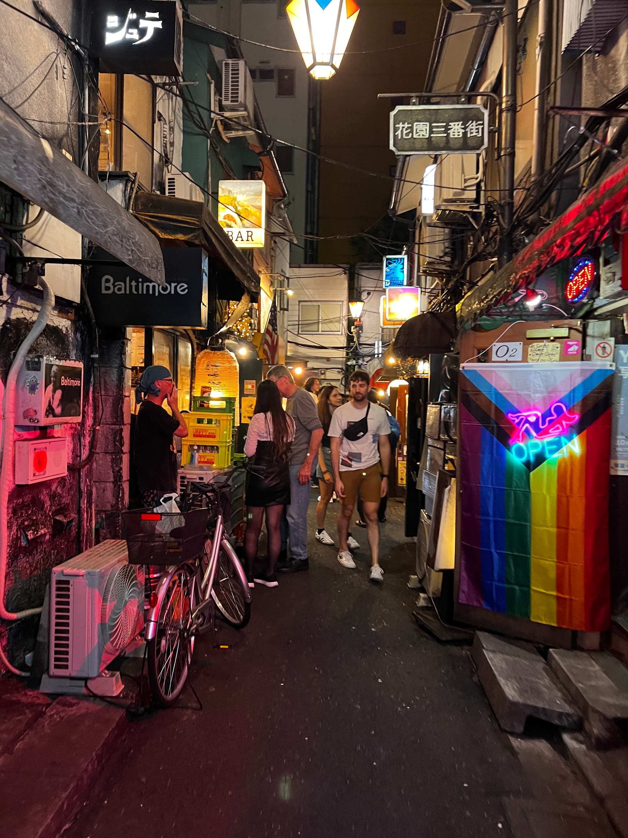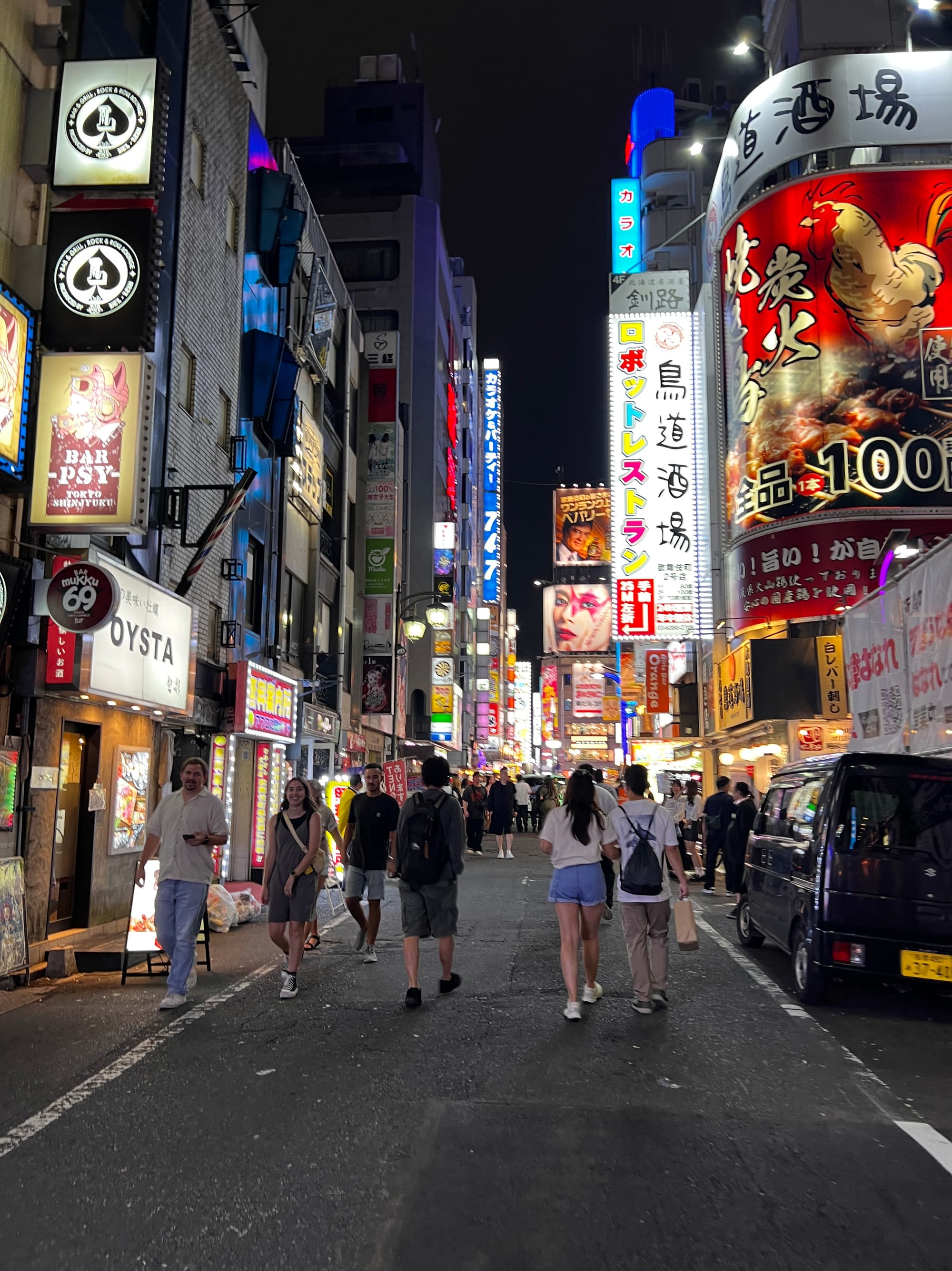 Po powrocie do mieszkania, znów wykończeni, ale tym razem zadowoleni, poszliśmy na drzemkę. Po regeneracji sił udaliśmy się jeszcze na spacer po naszej dzielnicy, która lepiej prezentuje się po zmroku. Dotarliśmy do takich atrakcji jak głowa Godzilli wystająca zza wysokiego budynku Toho zlokalizowanego w pobliżu oświetlonego neonami obszaru Kabukicho oraz Golden Gai, czyli ponad 200 maleńkich barów (mieszczących jedynie kilka osób) zlokalizowanych na niewielkiej powierzchni i oddzielonych wąskimi, zatłoczonymi uliczkami. Jest to jedno z nielicznych miejsc, które zachowały klimat Tokio pomimo zmieniających się czasów. Glowa Godzilli zrobiła szczególne wrażenie na Tosieńce, która bez przerwy na nią pokazywała, bardzo się przy tym ciesząc.