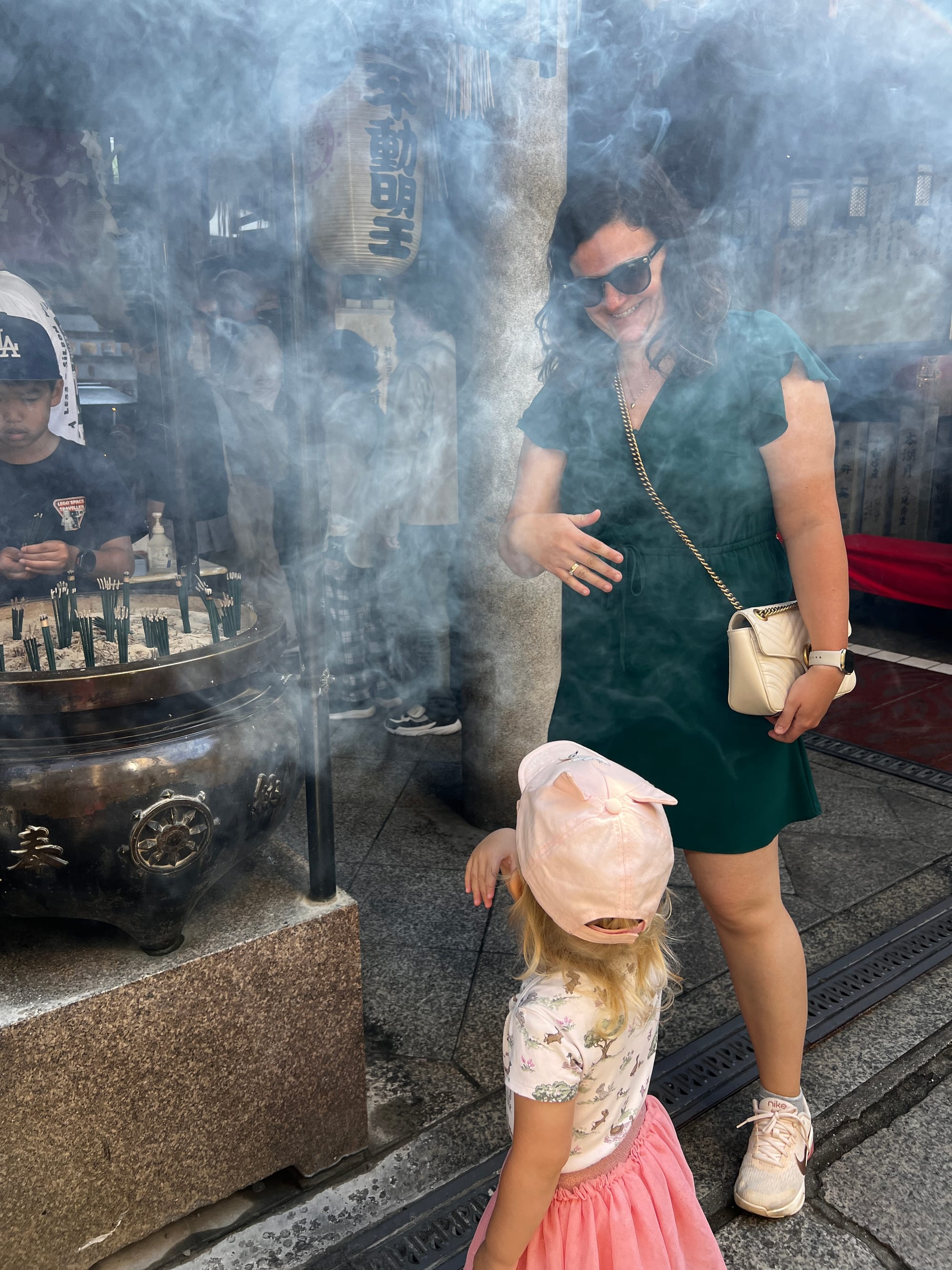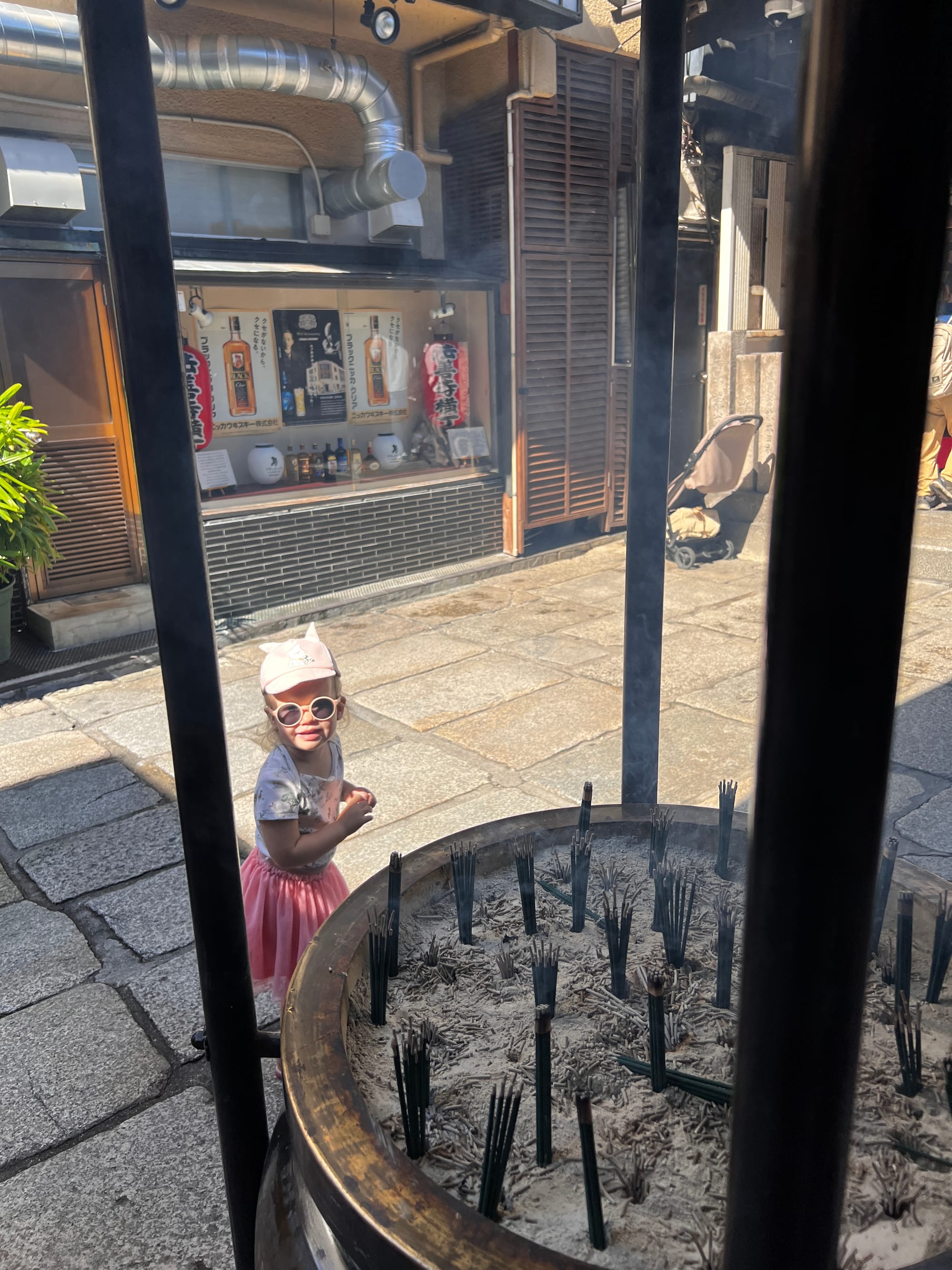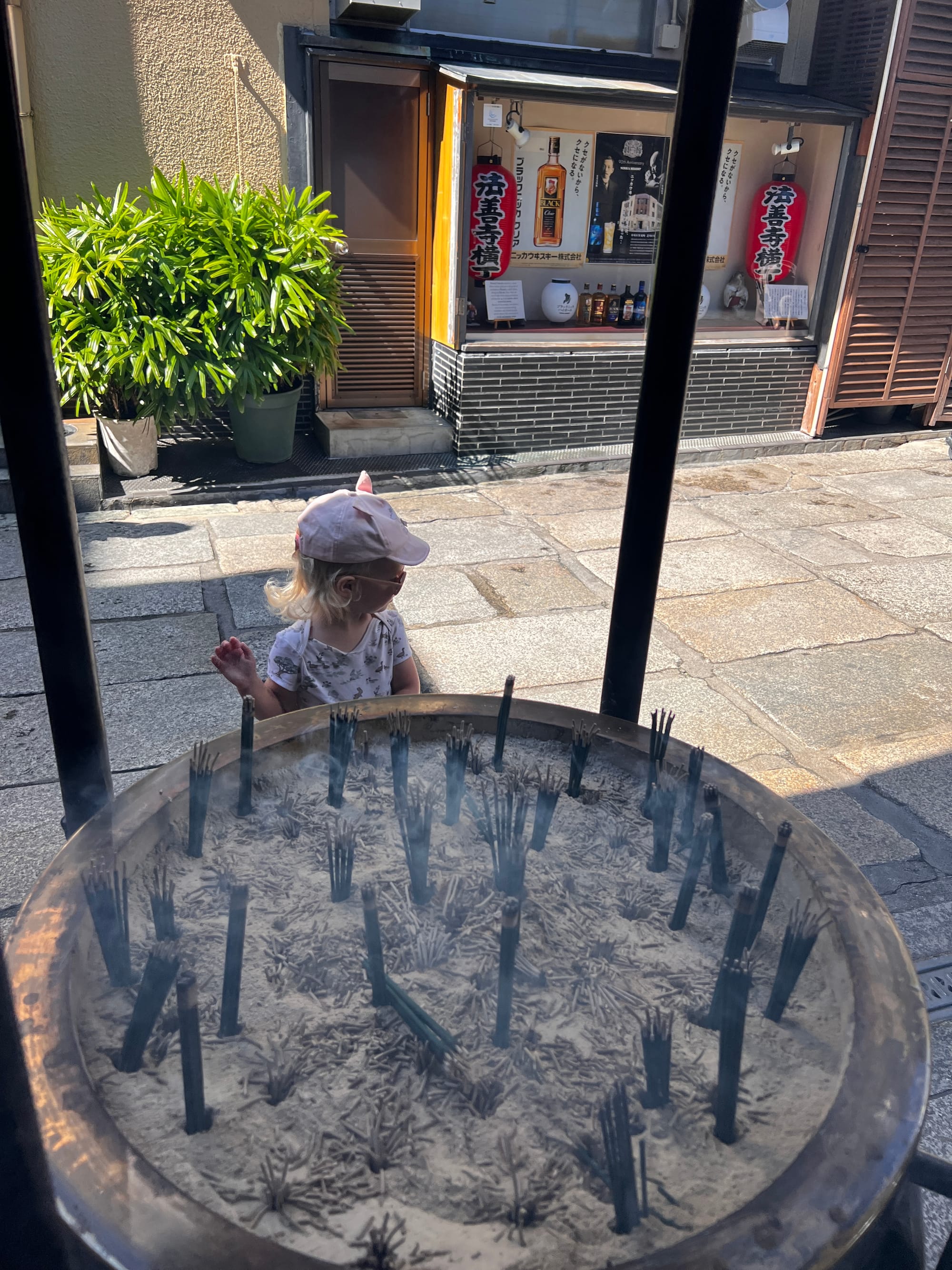 To już chyba tradycja, że nasze wojaże nieodłącznie związane są z różnego rodzaju przeziębieniami czy wirusami. Chociaż wydawało się, że mamy dobrą passę i wszystko idzie zgodnie z planem, niestety i na tym wyjeździe nas dopadło. Od dwóch dni Tosia miała katarek, dzisiaj wydaje się już czuć lepiej, ale za to my obudziliśmy się z katarem i bólem gardła. Nie chcąc jednak tracić dnia, postanowiliśmy zobaczyć co nieco w okolicy. Zaczęliśmy od spaceru do pobliskiej, maleńkiej świątyni Hozen-ji, która słynie z porośniętej mchem figury kami Mizukake Fudo. Świątynia zajmuje stosunkowo niedużą przestrzeń, w rezultacie była zatłoczona, a zapach palonych kadzidełek był bardzo intensywny, więc nie zabawiliśmy tam długo.
