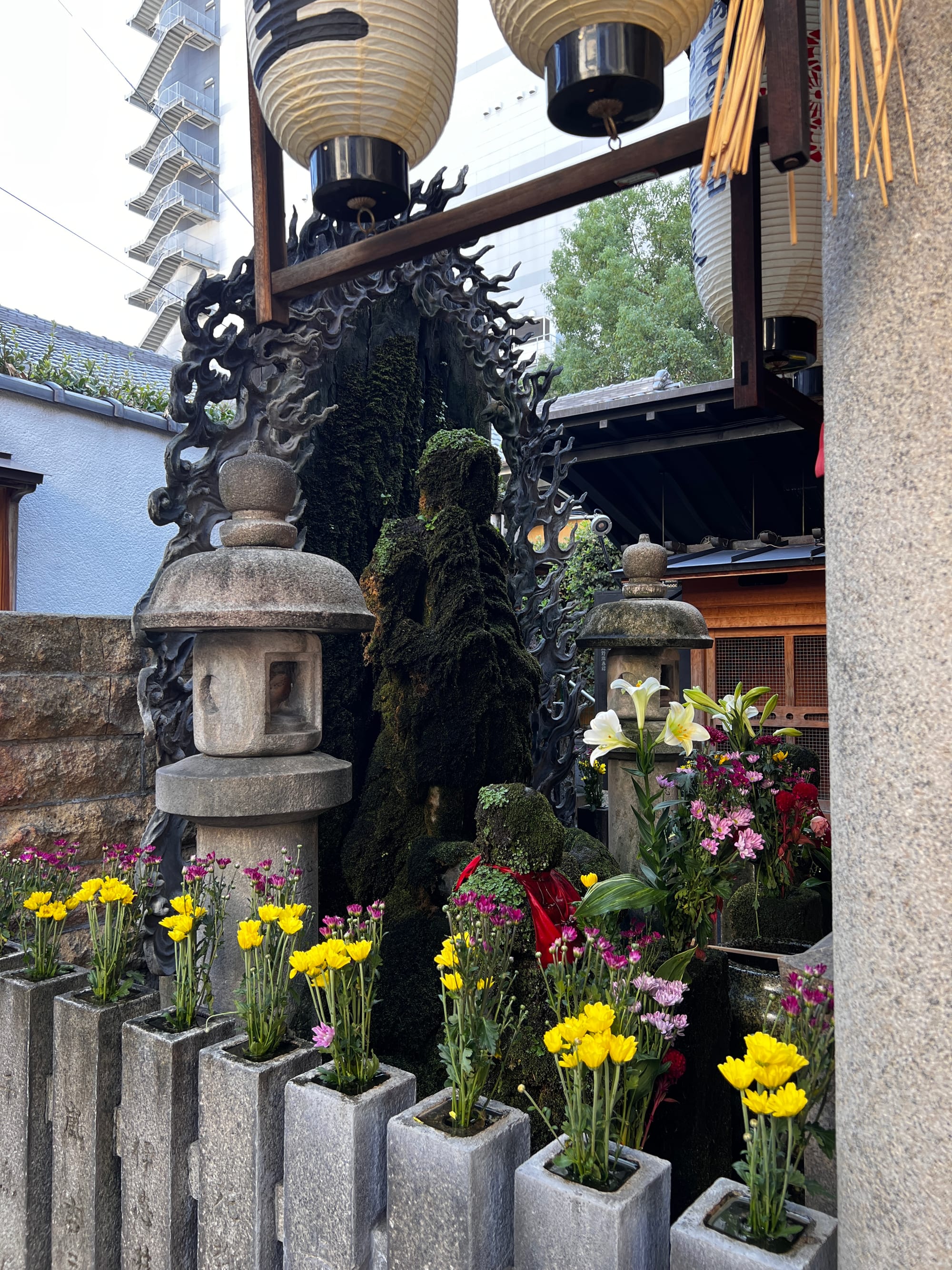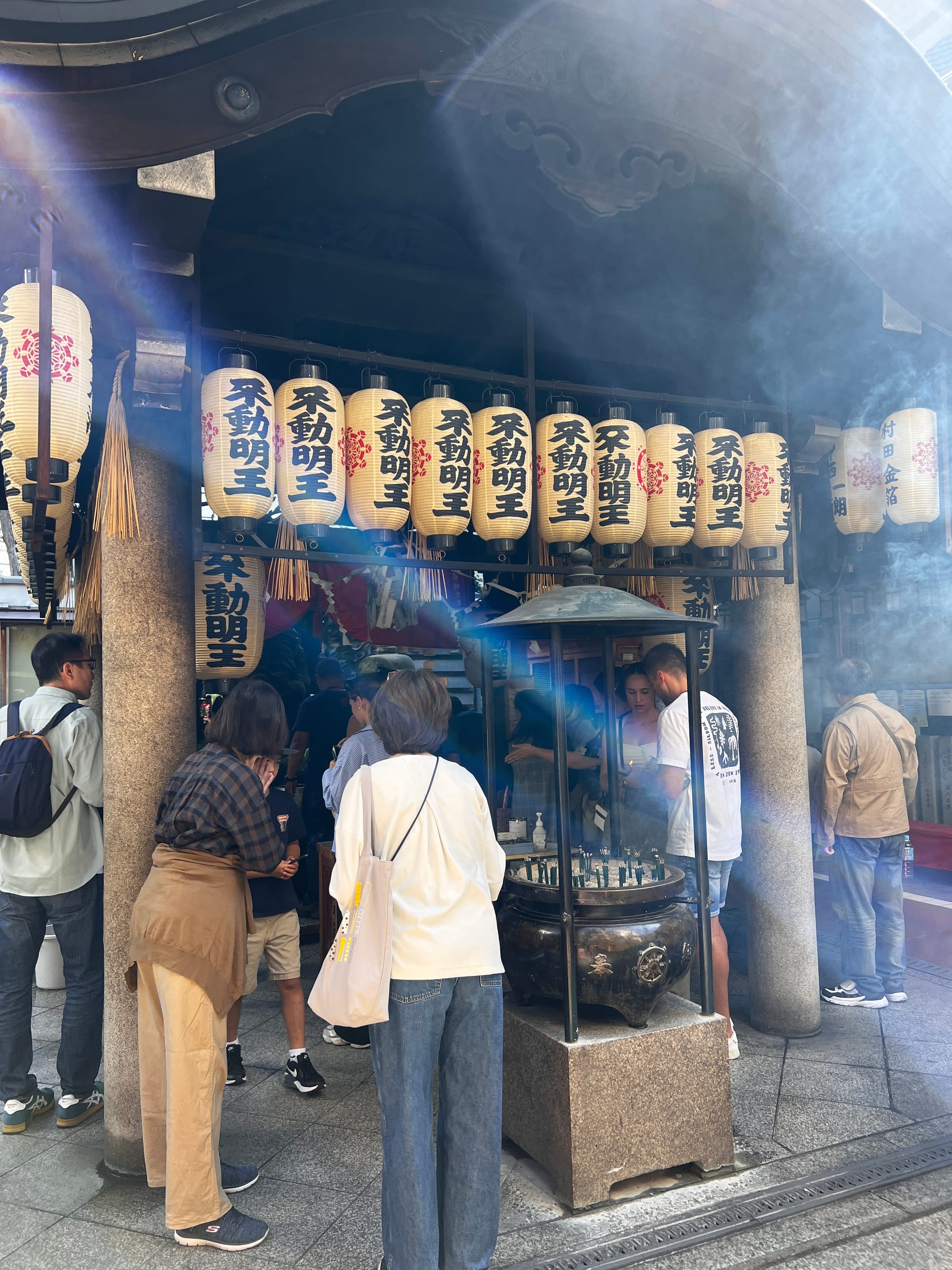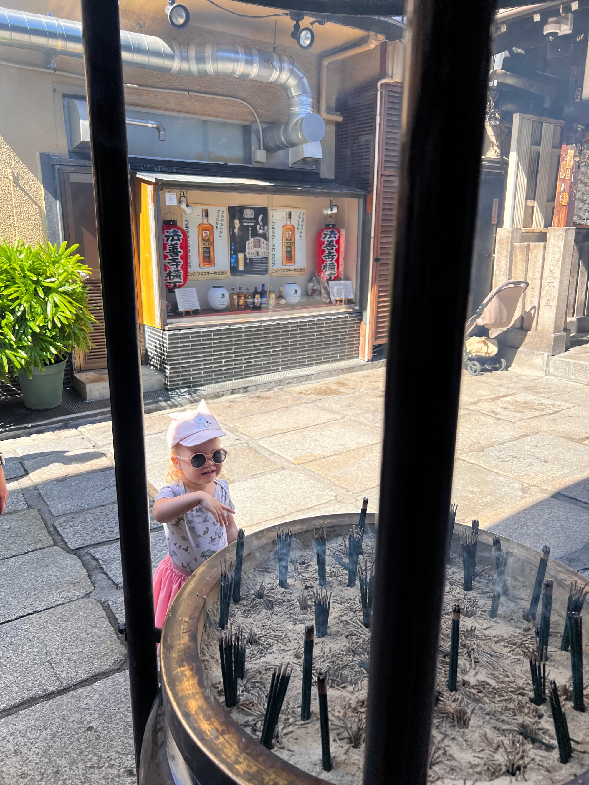 To już chyba tradycja, że nasze wojaże nieodłącznie związane są z różnego rodzaju przeziębieniami czy wirusami. Chociaż wydawało się, że mamy dobrą passę i wszystko idzie zgodnie z planem, niestety i na tym wyjeździe nas dopadło. Od dwóch dni Tosia miała katarek, dzisiaj wydaje się już czuć lepiej, ale za to my obudziliśmy się z katarem i bólem gardła. Nie chcąc jednak tracić dnia, postanowiliśmy zobaczyć co nieco w okolicy. Zaczęliśmy od spaceru do pobliskiej, maleńkiej świątyni Hozen-ji, która słynie z porośniętej mchem figury kami Mizukake Fudo. Świątynia zajmuje stosunkowo niedużą przestrzeń, w rezultacie była zatłoczona, a zapach palonych kadzidełek był bardzo intensywny, więc nie zabawiliśmy tam długo.