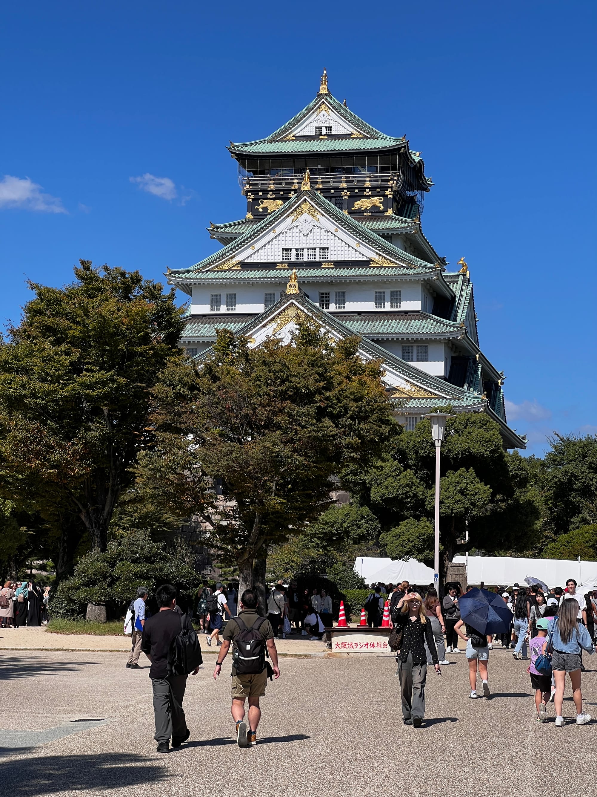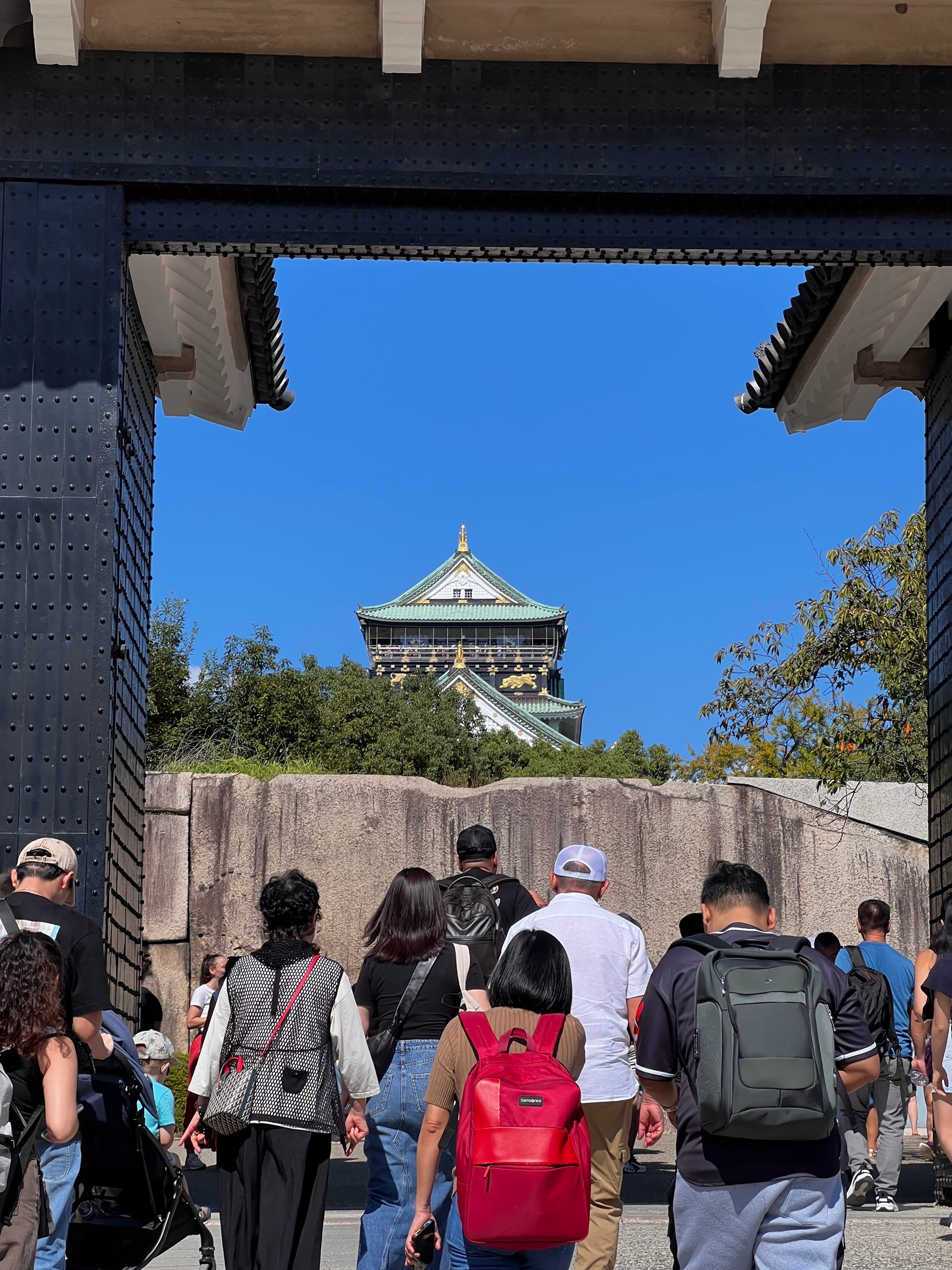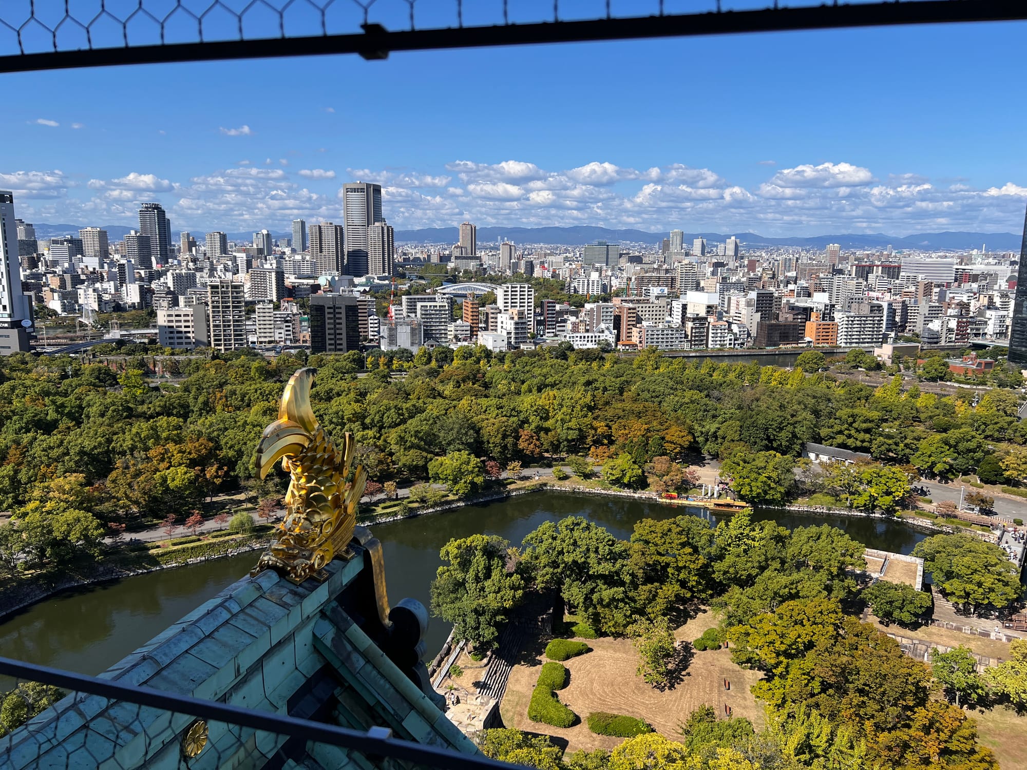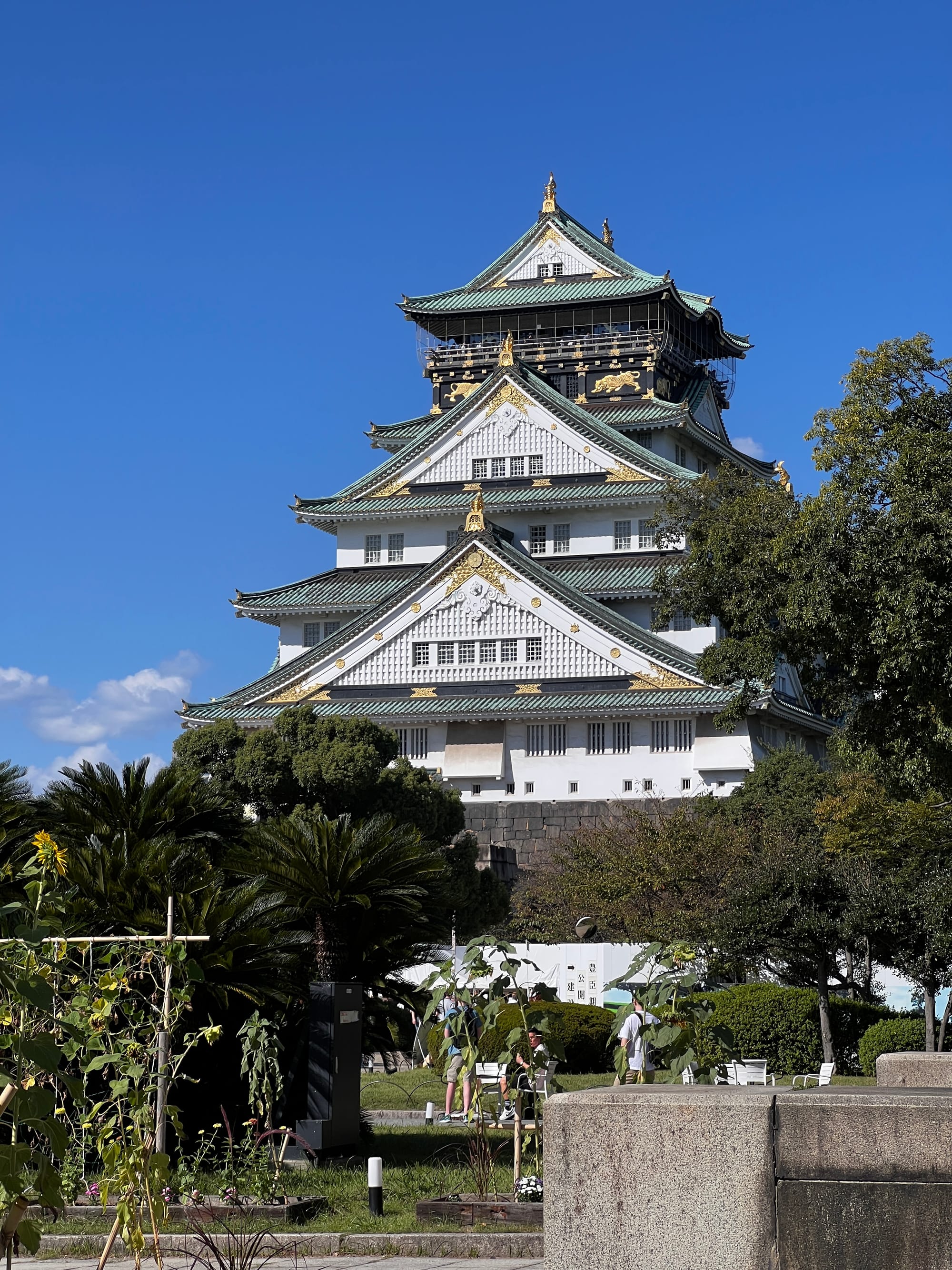 Następnie udaliśmy się metrem do chyba jedynej w tym mieście zabytkowej atrakcji, jaką jest Zamek Osaka. W pewnym momencie był to największy zamek w kraju, jednak obecnie znajduje się tam jedynie rekonstrukcja murów obronnych i wieży tenshu, która została zagospodarowana jako historyczne muzeum tego miejsca. Z balkonu znajdującego się na ósmym piętrze zamku rozpościera się piękny widok na okolicę, w tym otaczający zamek park i ogród.