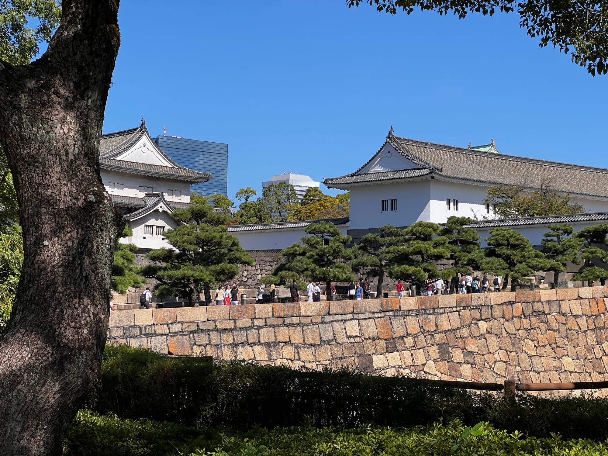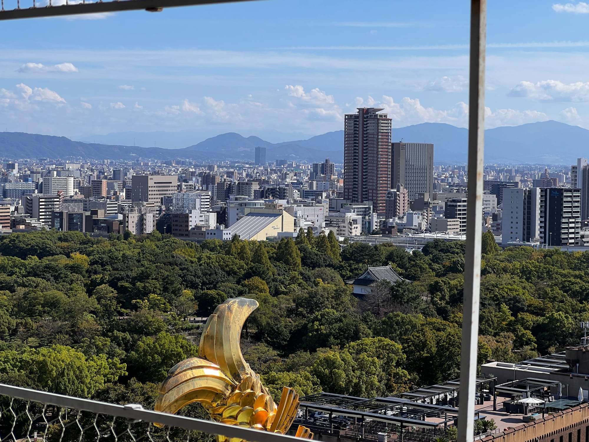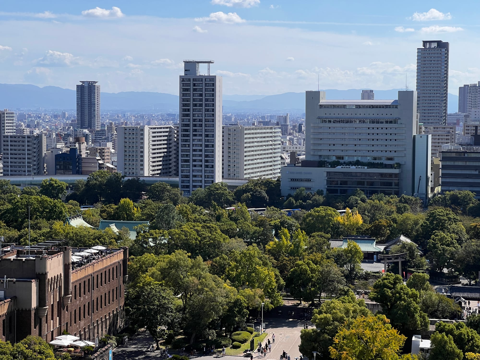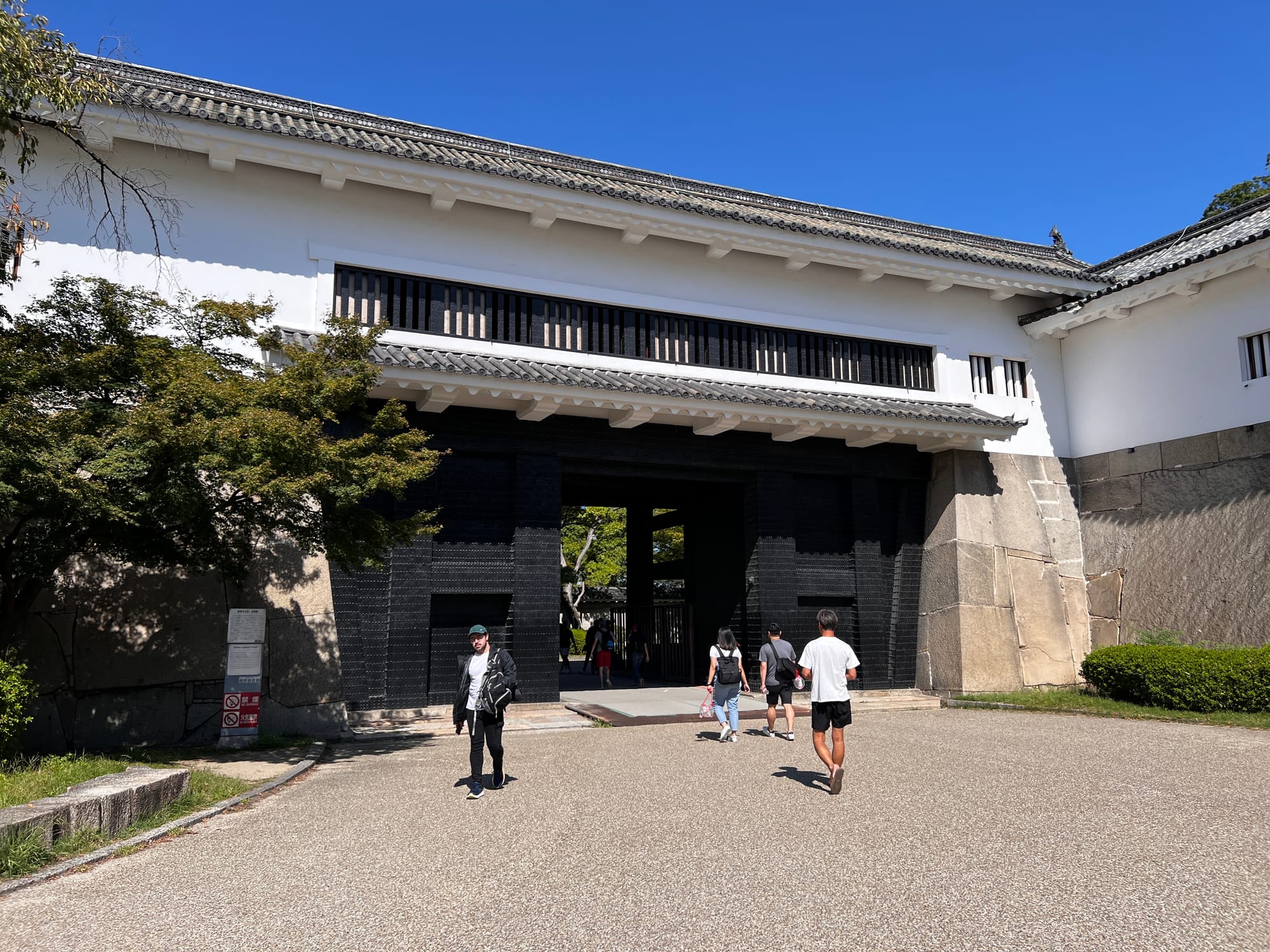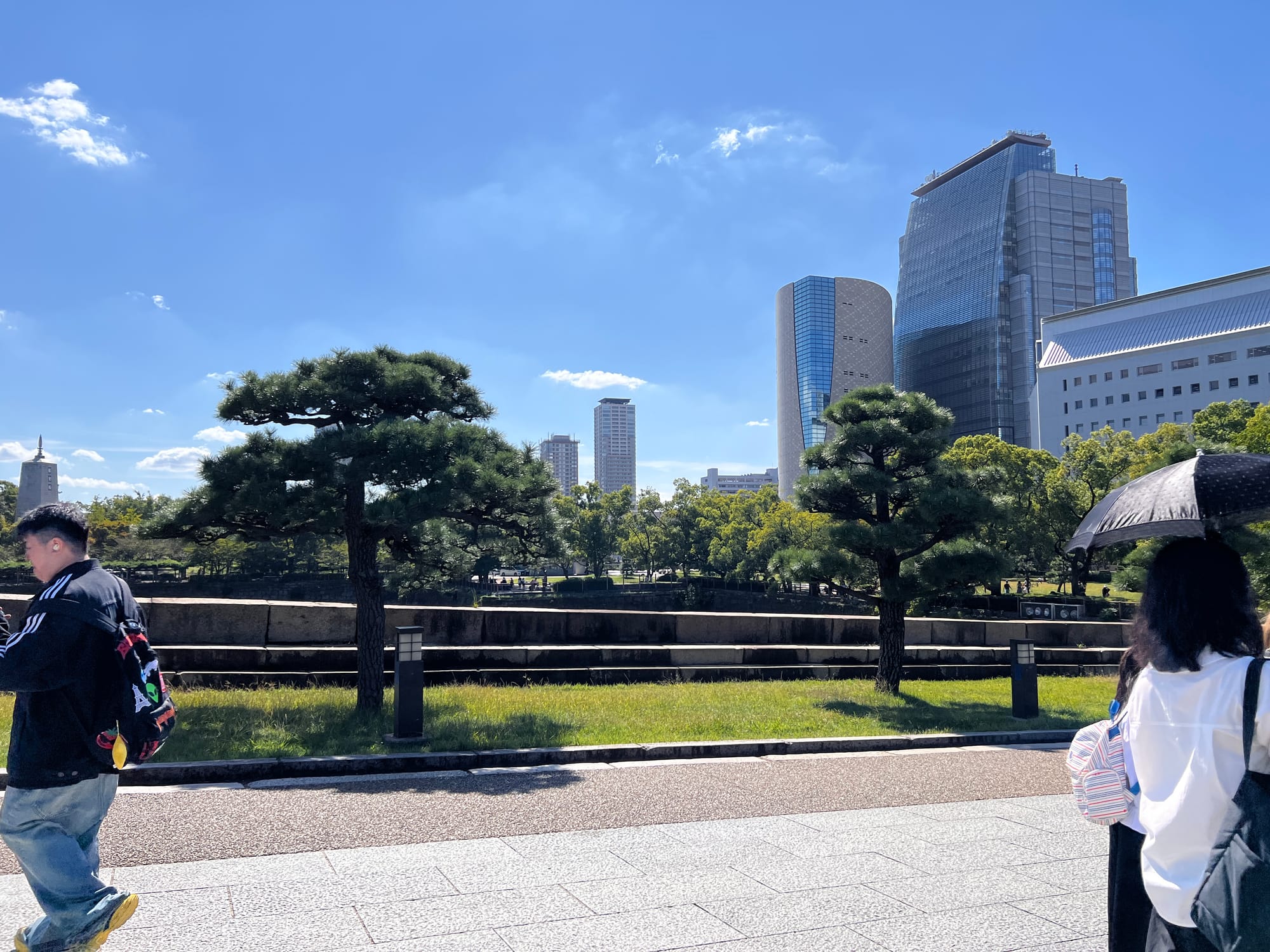 Następnie udaliśmy się metrem do chyba jedynej w tym mieście zabytkowej atrakcji, jaką jest Zamek Osaka. W pewnym momencie był to największy zamek w kraju, jednak obecnie znajduje się tam jedynie rekonstrukcja murów obronnych i wieży tenshu, która została zagospodarowana jako historyczne muzeum tego miejsca. Z balkonu znajdującego się na ósmym piętrze zamku rozpościera się piękny widok na okolicę, w tym otaczający zamek park i ogród.
